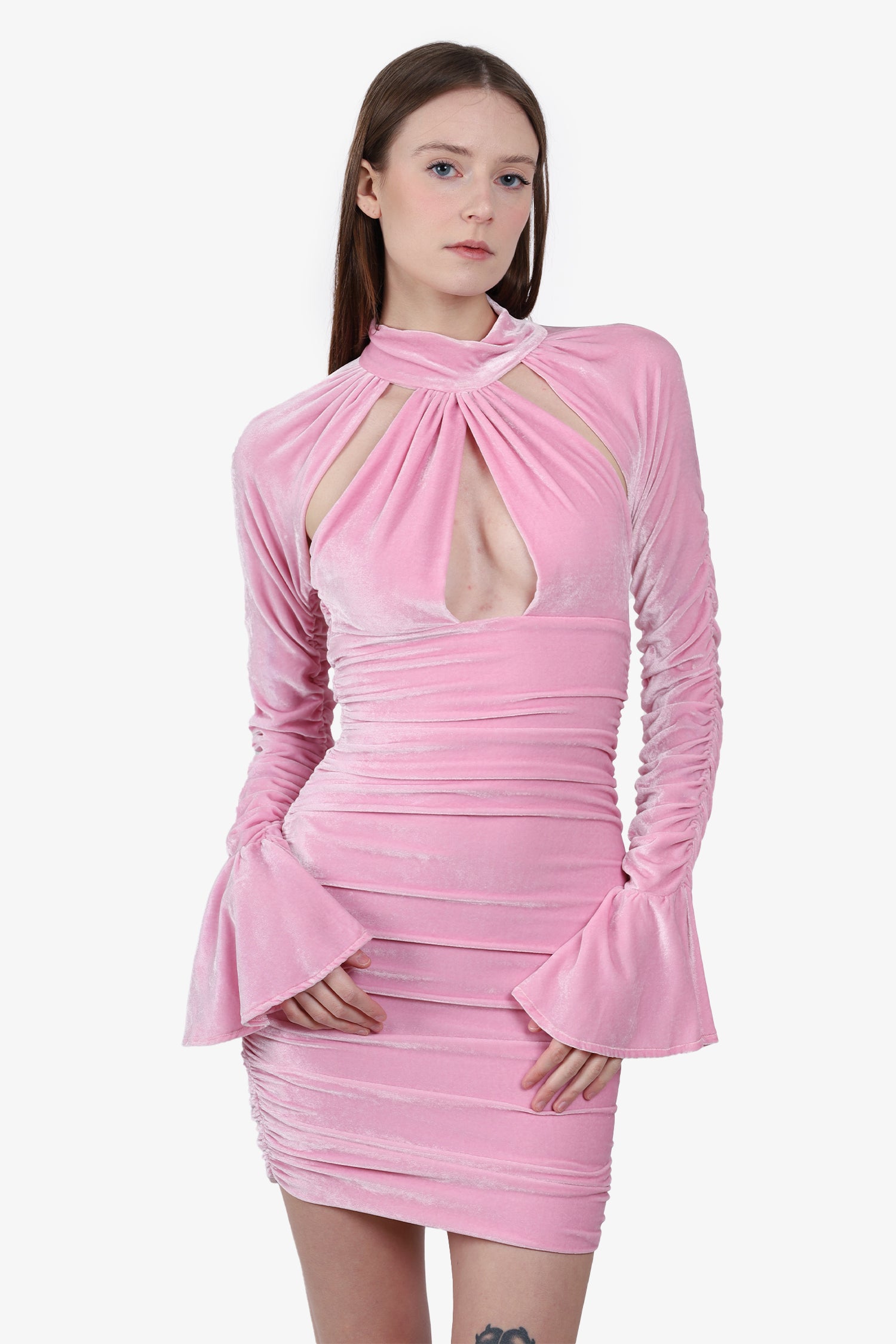 Blumarine Pink Cutout Ruched Stretch Velvet Mini Dress. High neckline. Back button closure. Cut-out detailing on front. Poet sleeve. Interior lining. Tonal stitching.