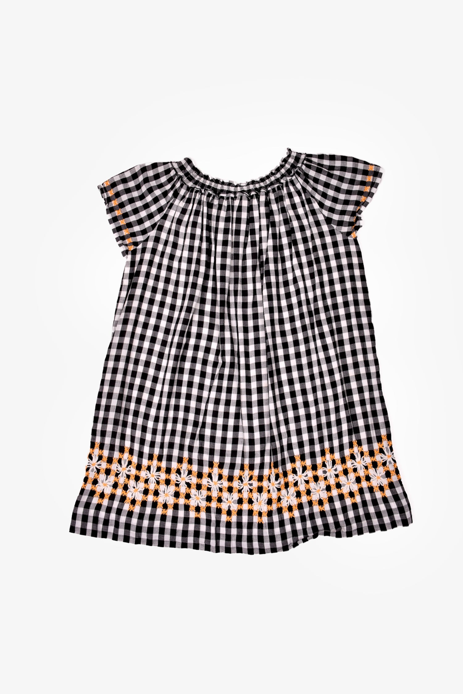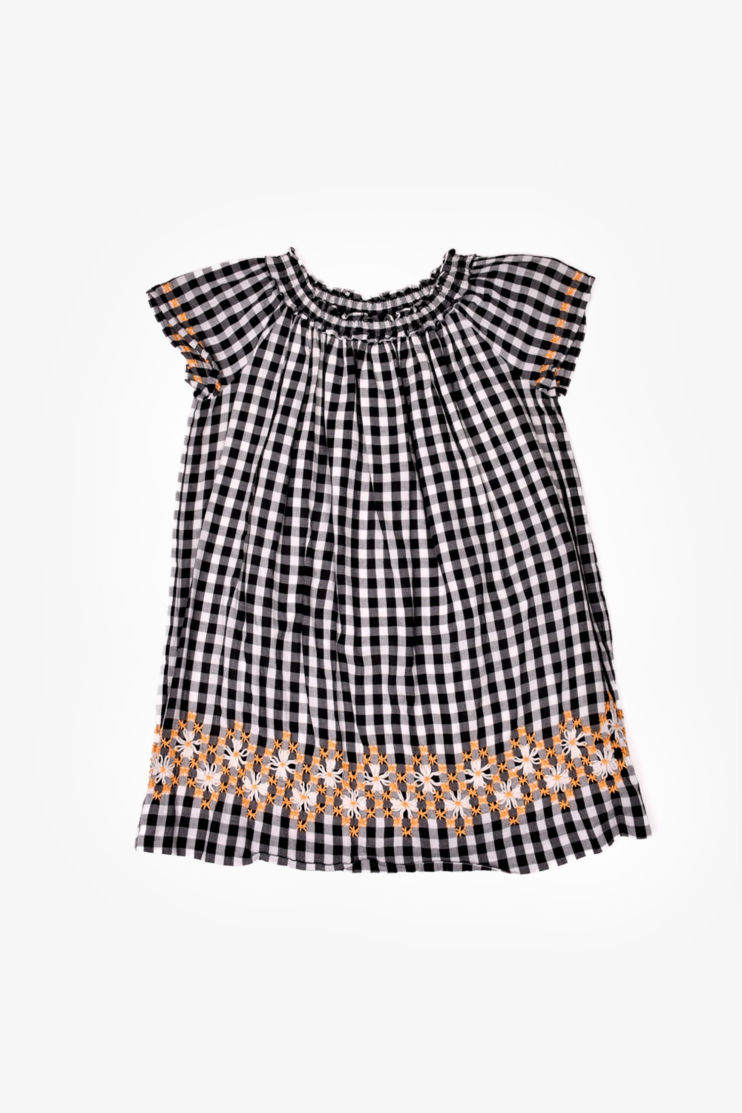 Refresh availabilityBonpoint White/Black Gingham Print Dress with Orange Floral Embroidery. Round neck. Pull-on. Tonal stitching.
