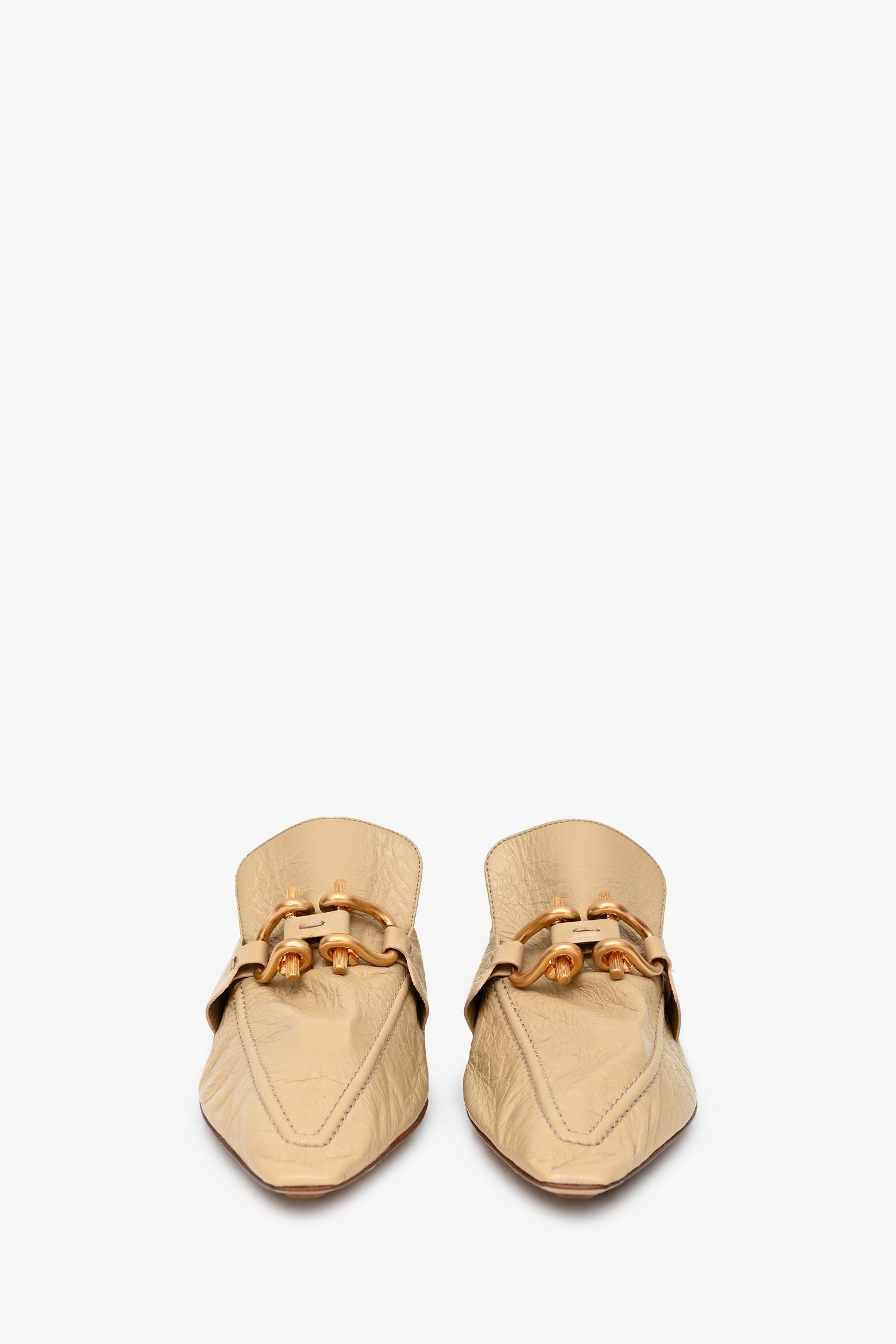 Refresh availabilityBottega Veneta Beige Crinkled Leather Pointed Toe Gold Buckle Flats. Slip-on.