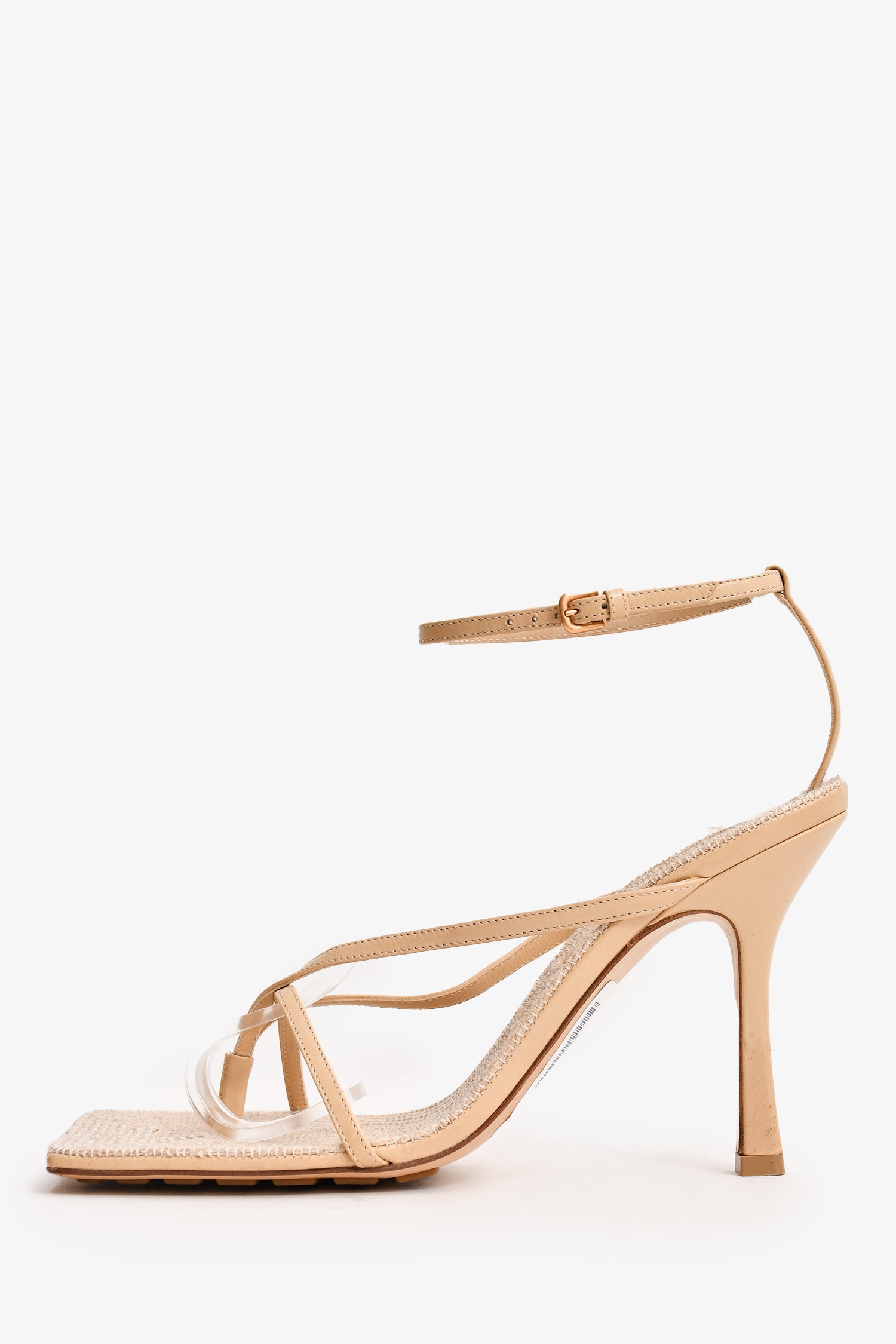 Refresh availabilityBottega Veneta Beige Leather Stretch Strap Sandals. Slip-on. Square toe. Ankle strap with buckle closure.