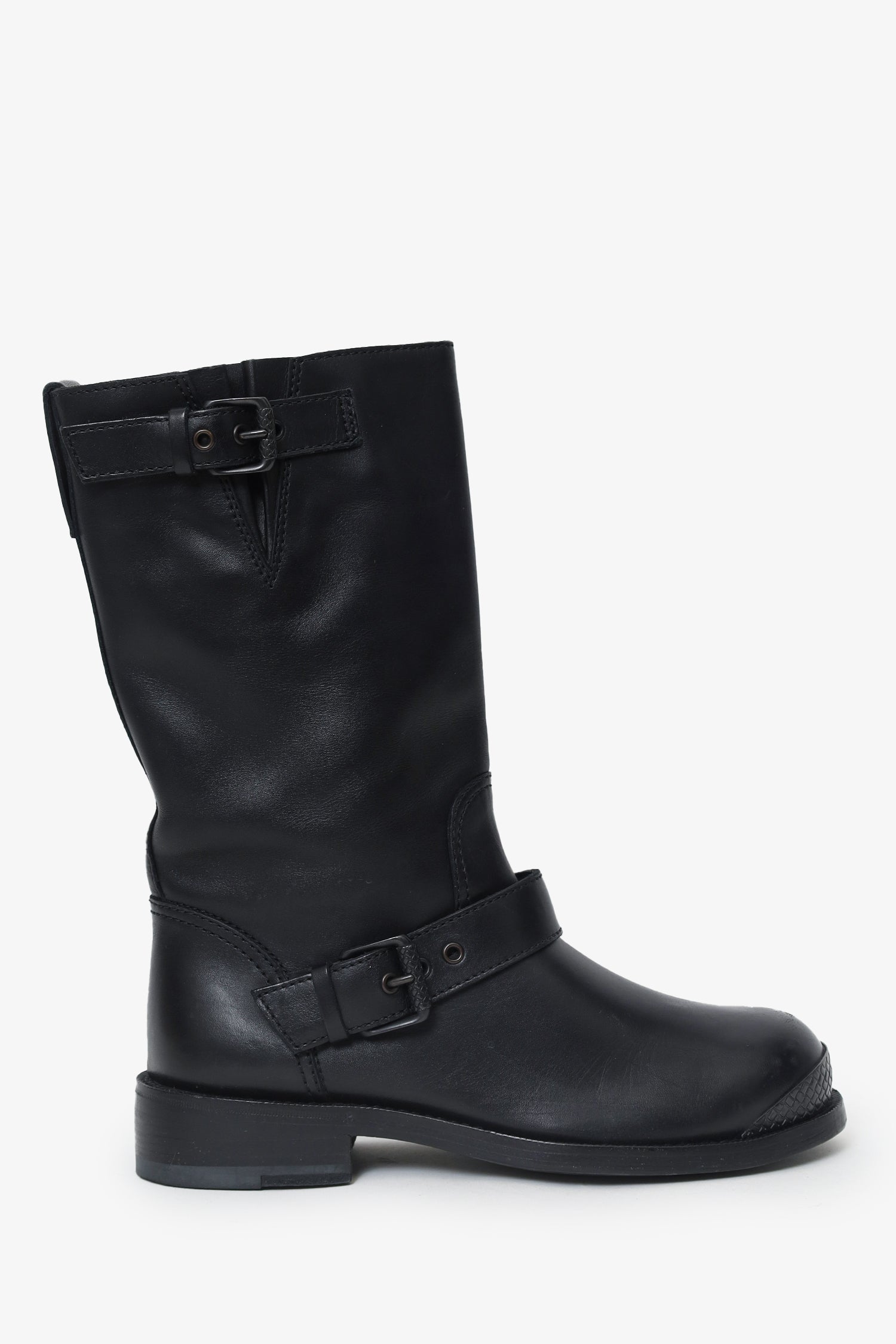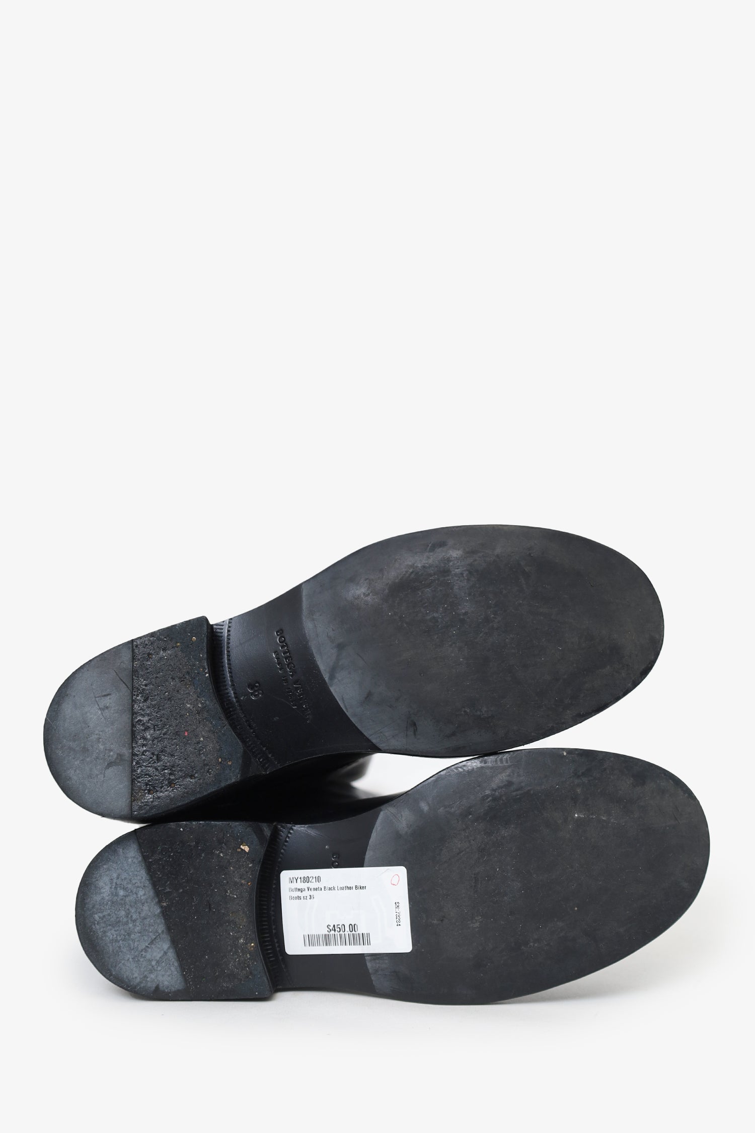 Refresh availabilityBottega Veneta Black Leather Biker Boots. Pull-on. Round toe. Adjustable pull-through buckle closure to arch and shaft. Block heel. Rear pull tab. Lined interior. Gunmetal-tone hardware. Tonal stitching.