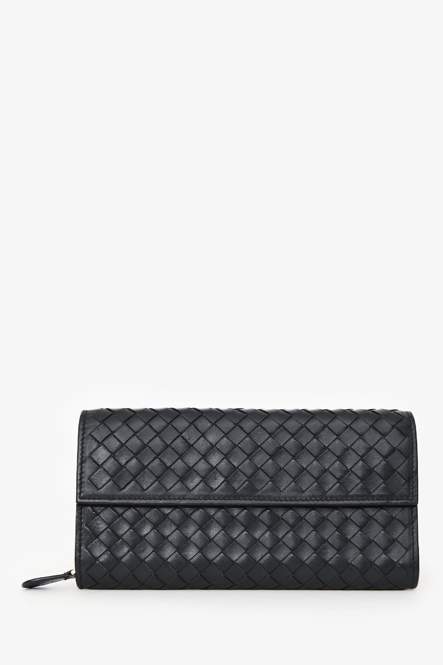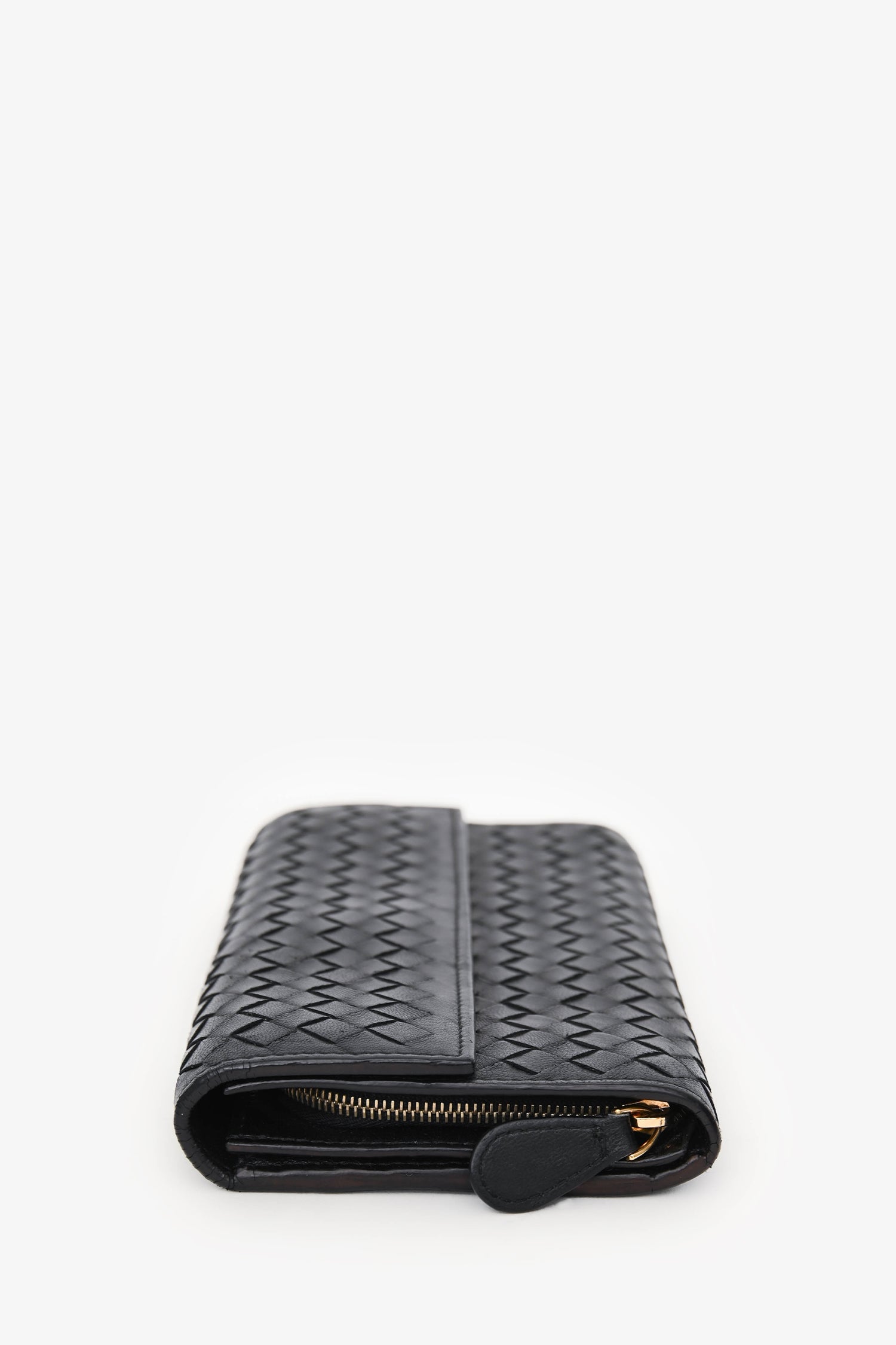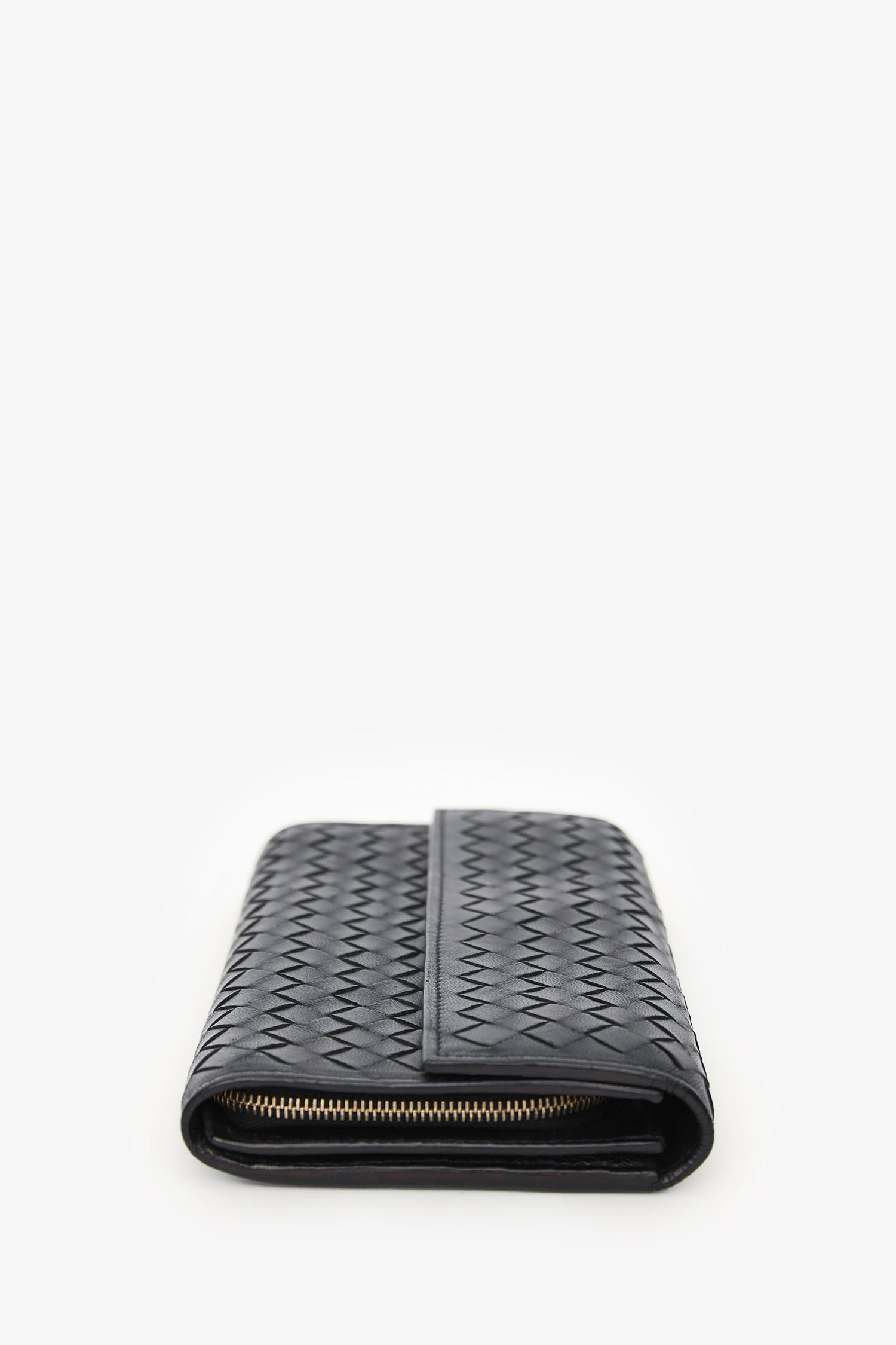 Refresh availabilityBottega Veneta Black Leather Intrecciato Long Wallet. Fold-over flap with a snap closure. 3 interior compartments and 8 card slots. Gold-tone hardware. Tonal stitching.