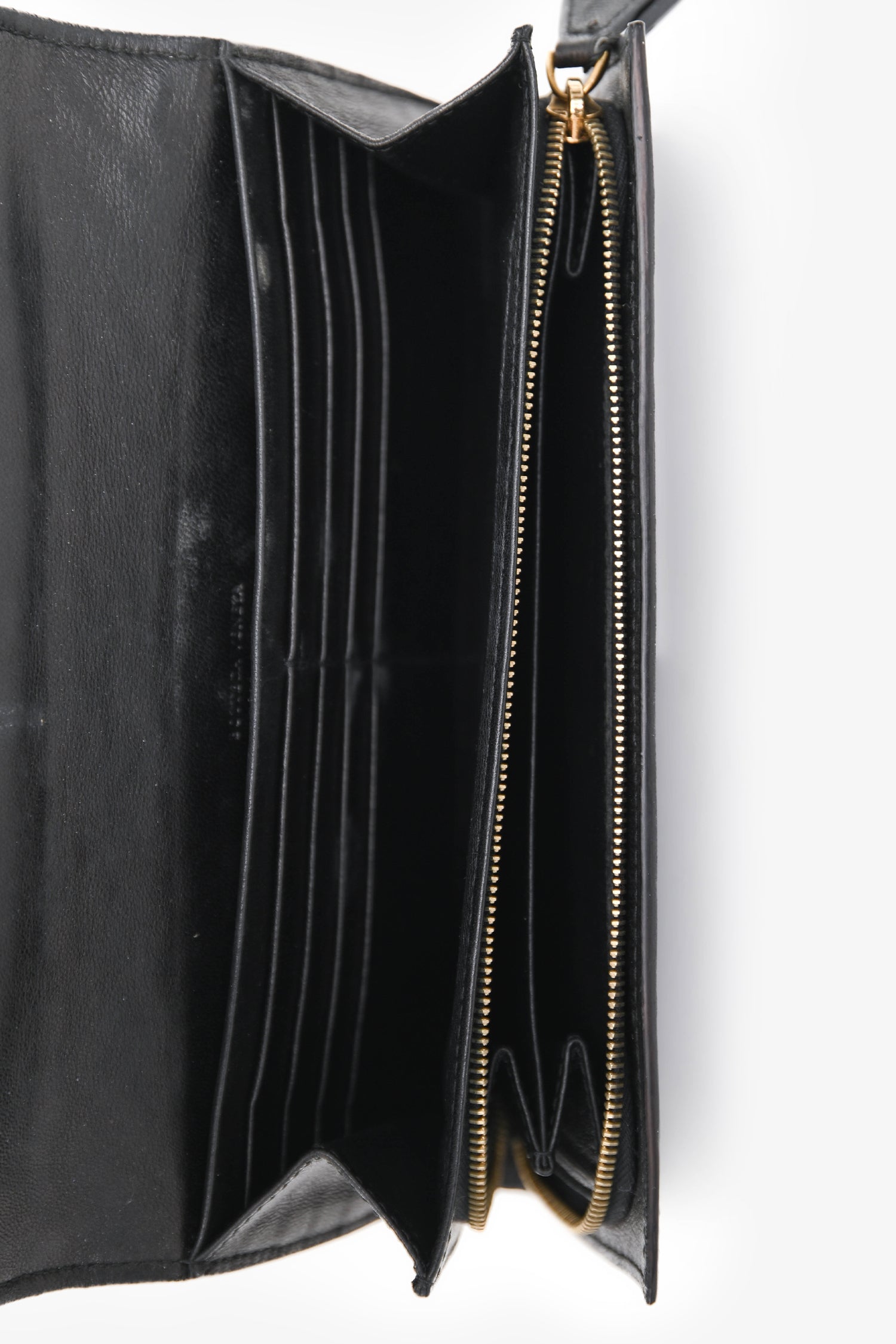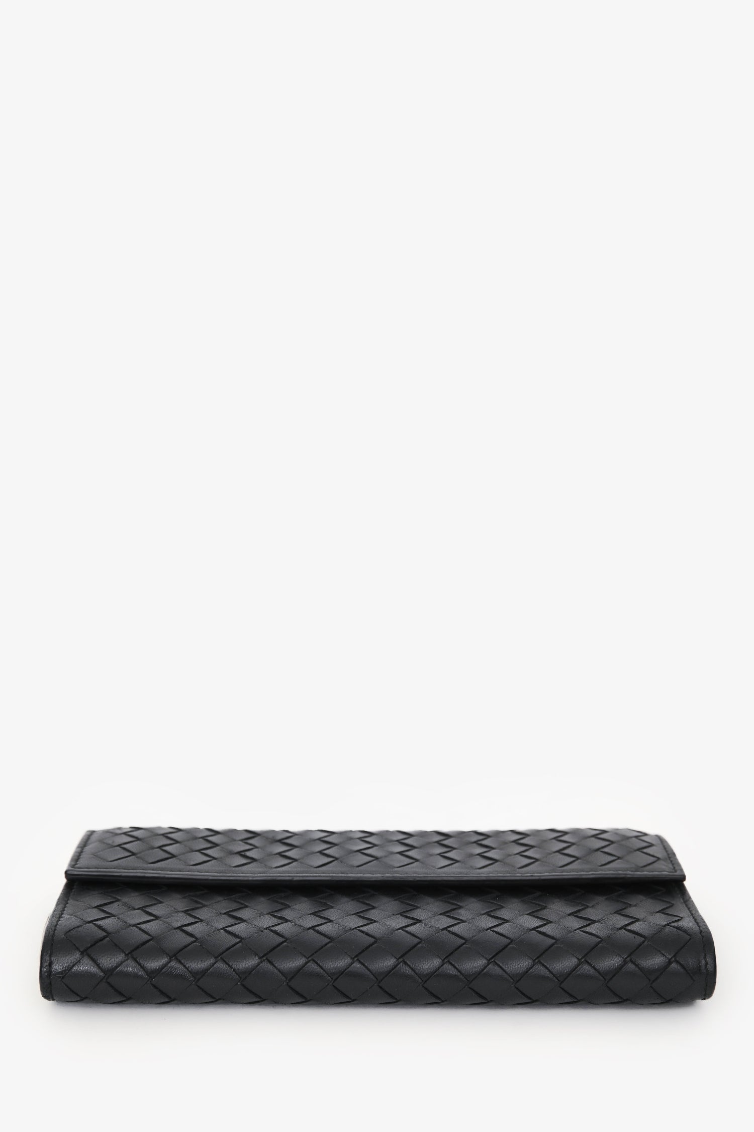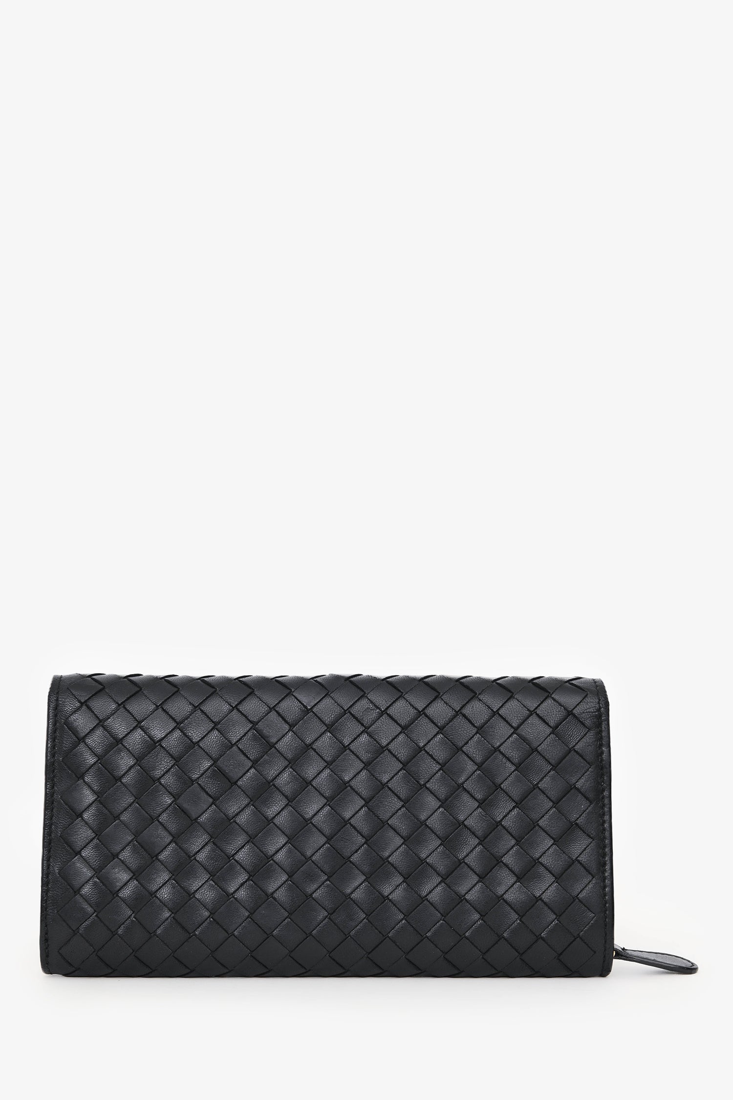Refresh availabilityBottega Veneta Black Leather Intrecciato Long Wallet. Fold-over flap with a snap closure. 3 interior compartments and 8 card slots. Gold-tone hardware. Tonal stitching.