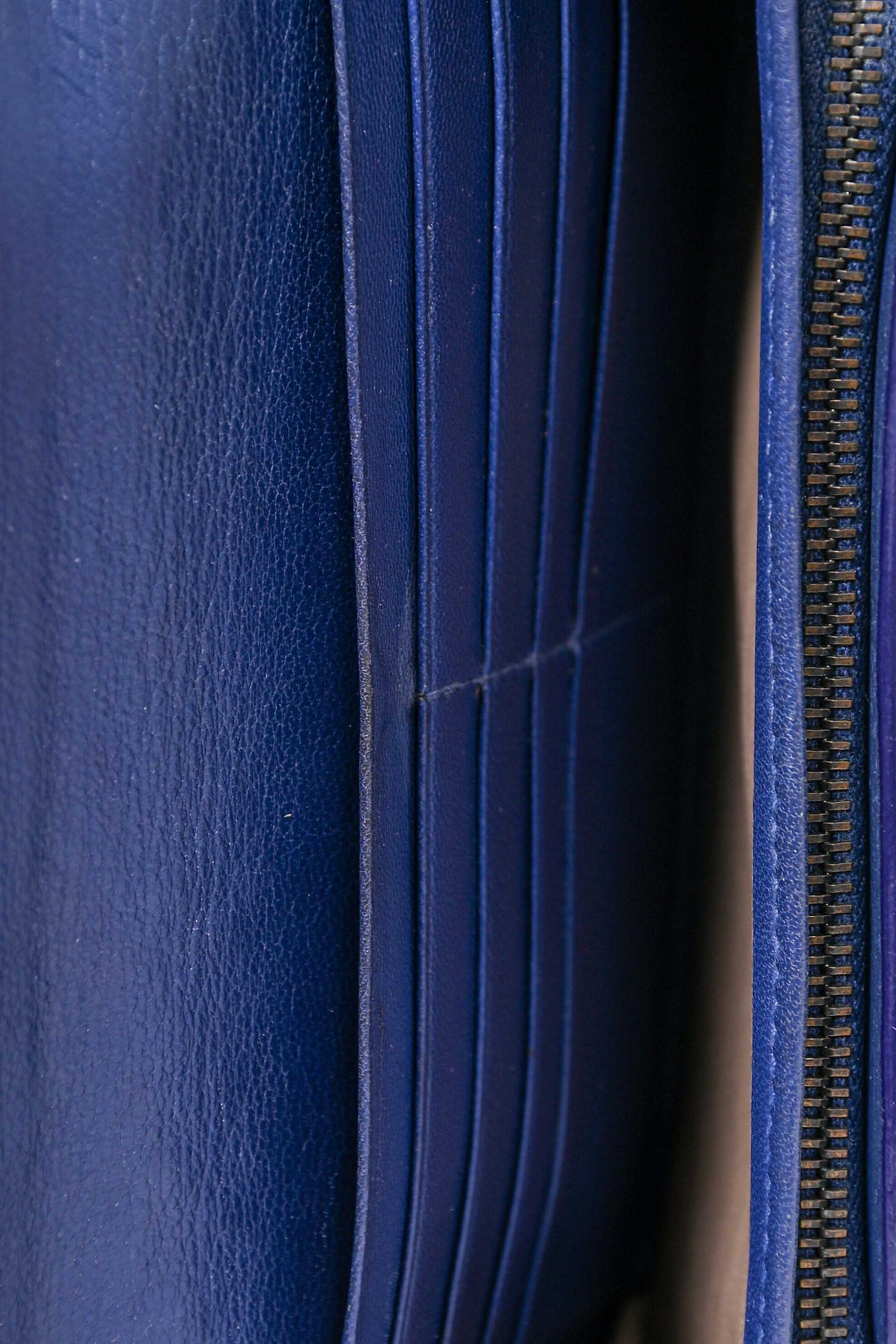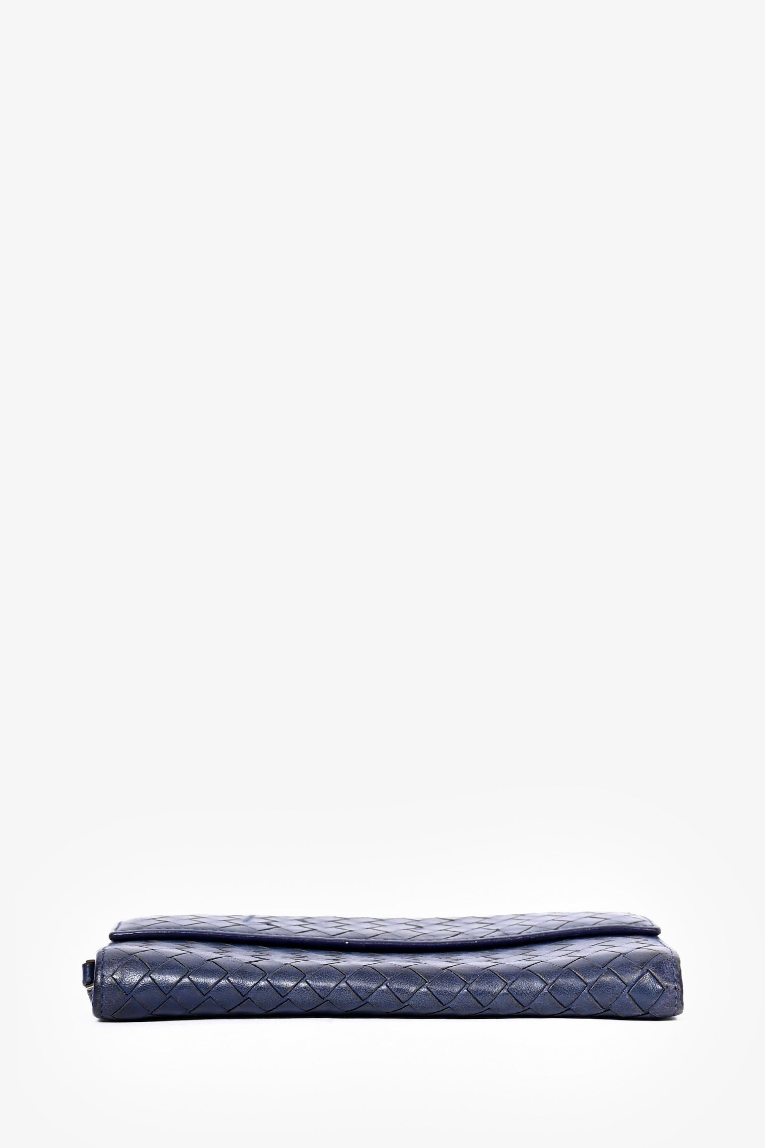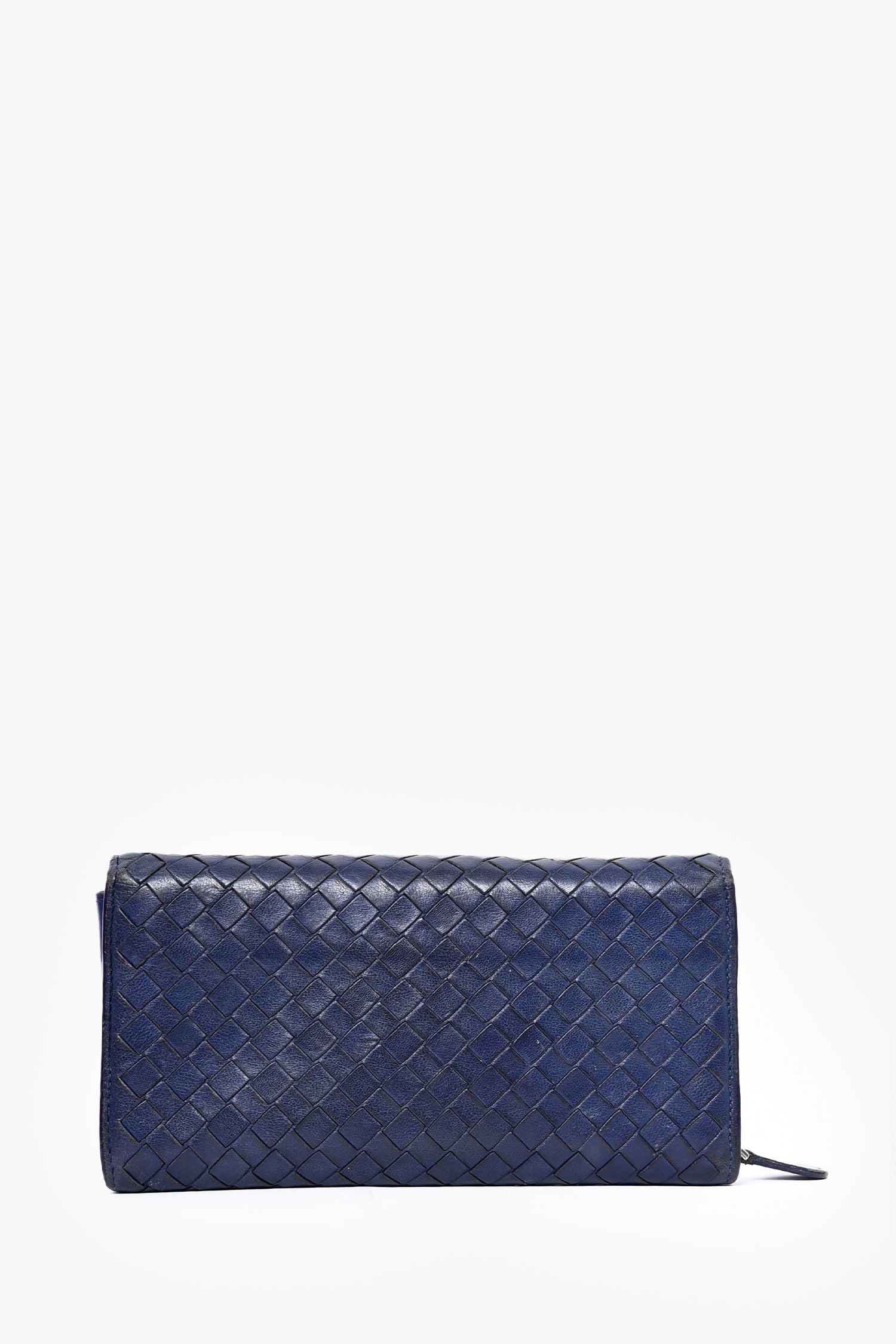 Refresh availabilityBottega Veneta Blue Leather Long Zip Wallet. Front fold-over flap with snap-button closure. Taupe leather interior. 8 card slots. 1 billfold compartment. 1 zippered compartment with 2 dividers.