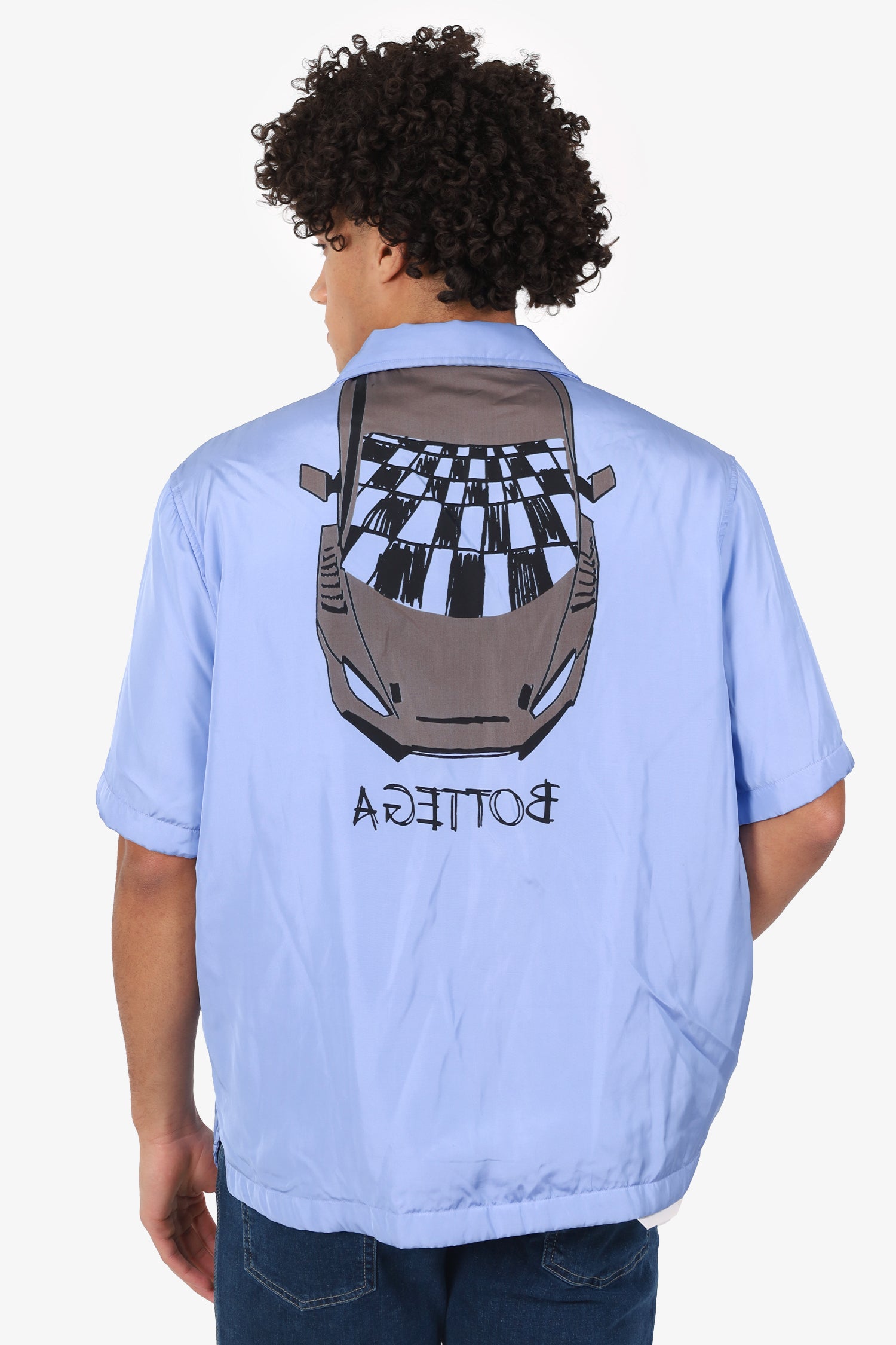 Refresh availabilityBottega Veneta Blue Short Sleeve Car Print Shirt. Pull-on. Collared neckline. Front button-up closure. Single interior slip pocket. Tonal stitching.