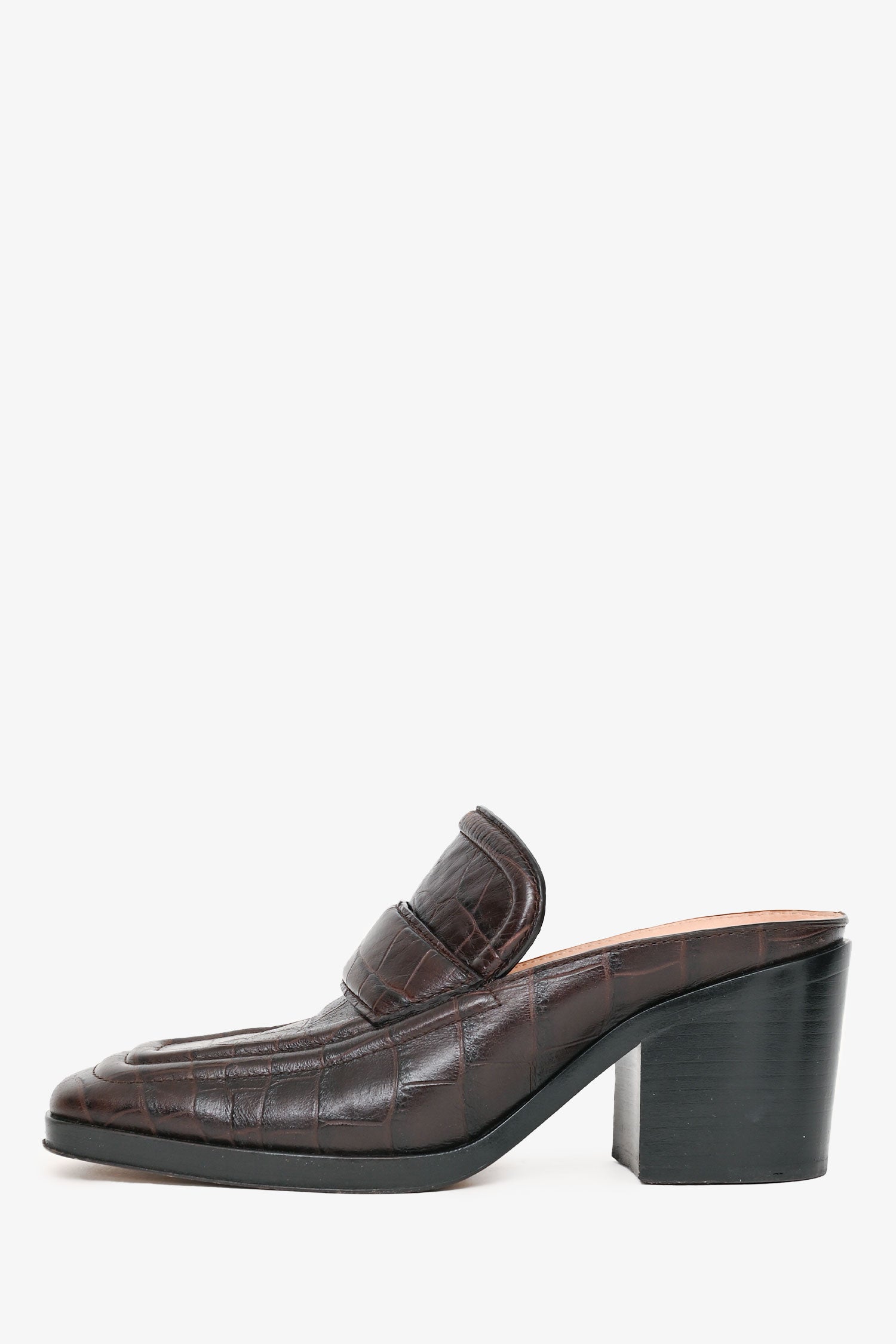 Refresh availabilityBottega Veneta Brown Crocodile Leather Mules. Slip-on design. Square toe. Stacked block heel. Tonal stitching.