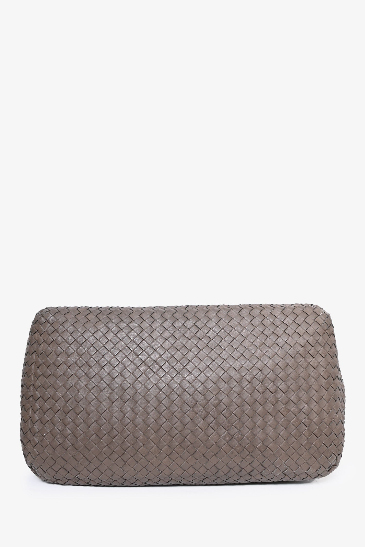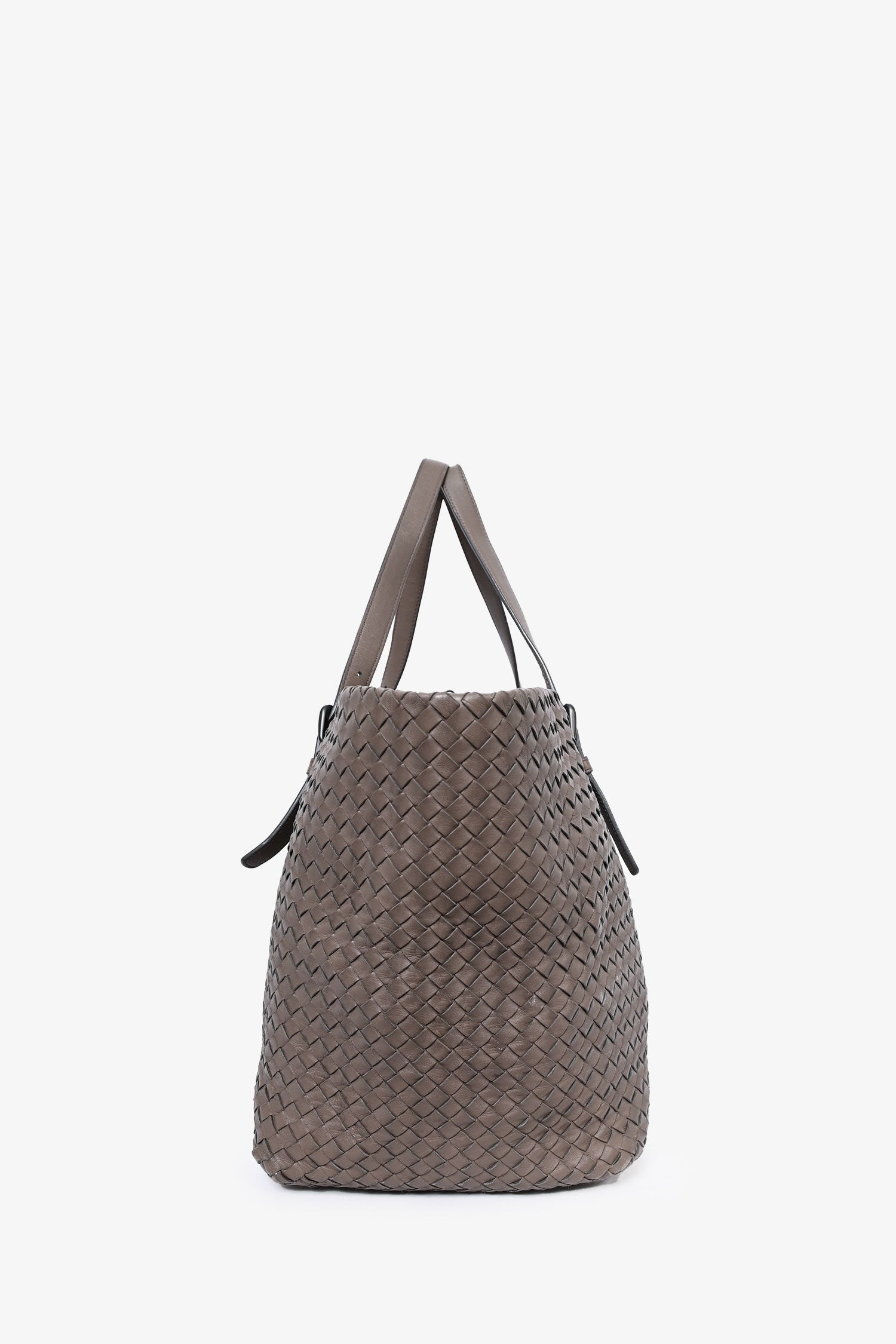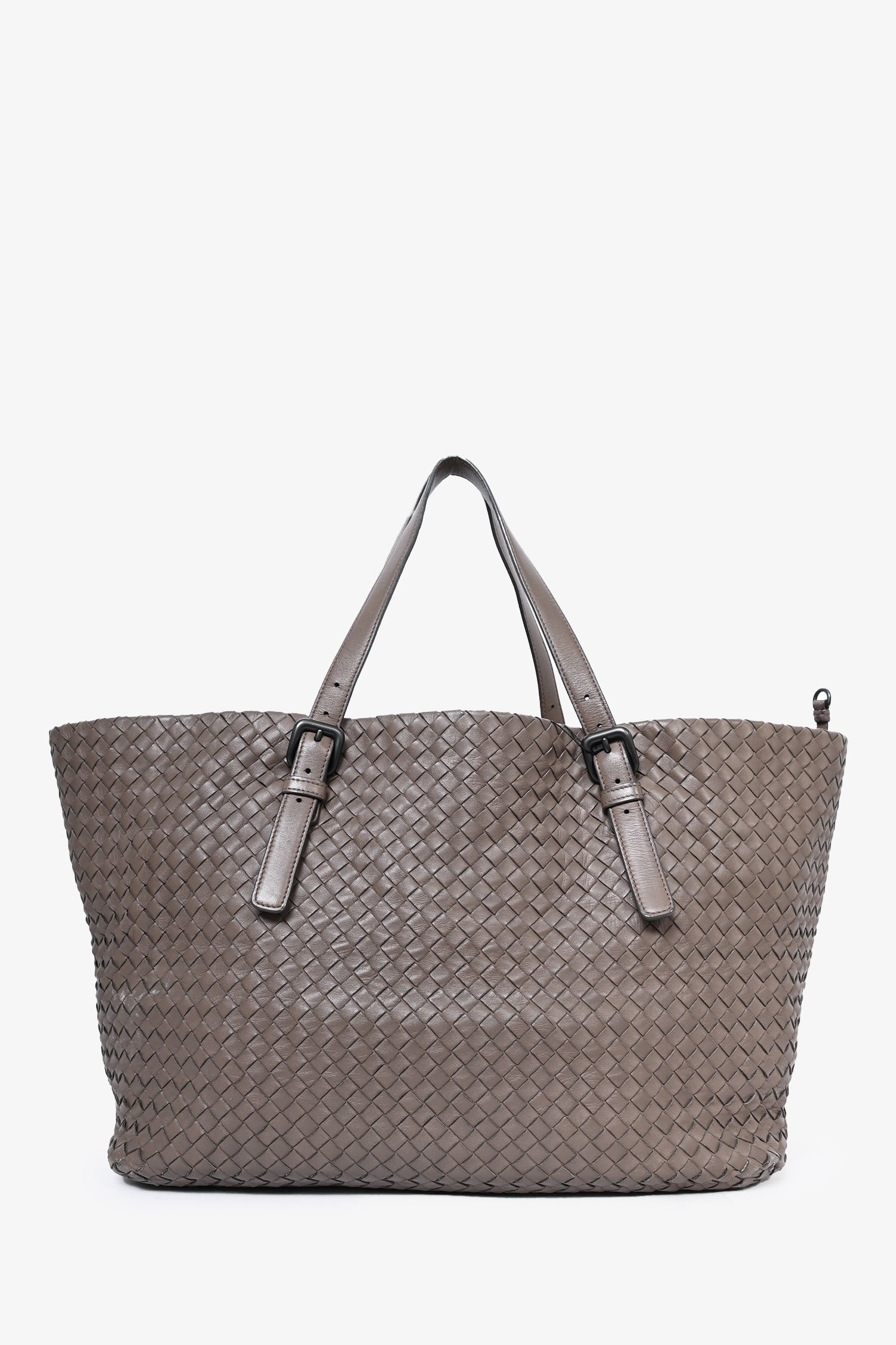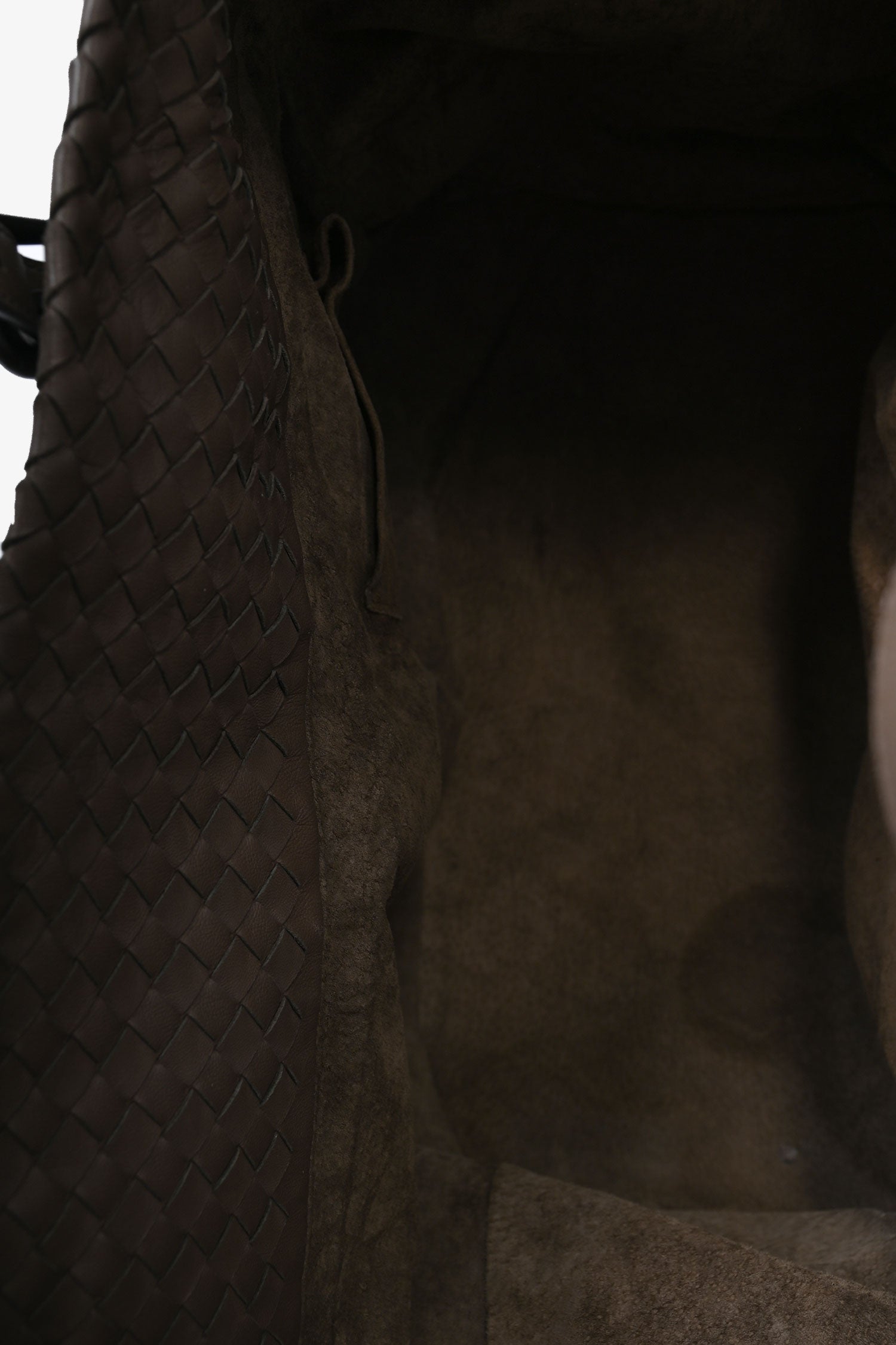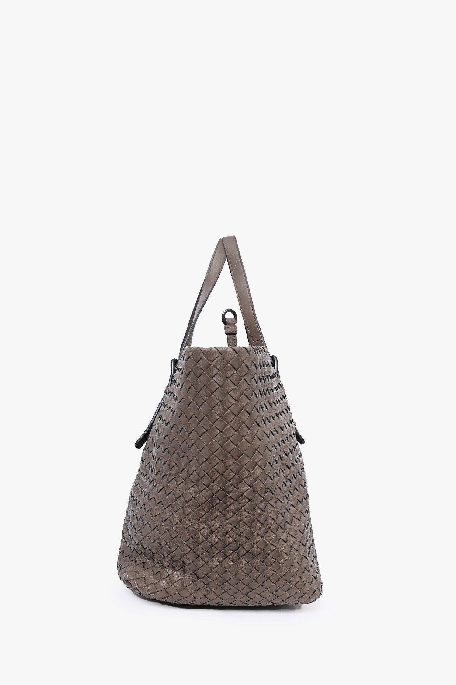 Refresh availabilityBottega Veneta Brown Intrecciato Leather Tote Bag. Top latch closure. Dual handles. 2 interior wall pockets; 1 slip and 1 with zip closure. Tonal suede interior lining. Grey-tone hardware. Adjustable straps.