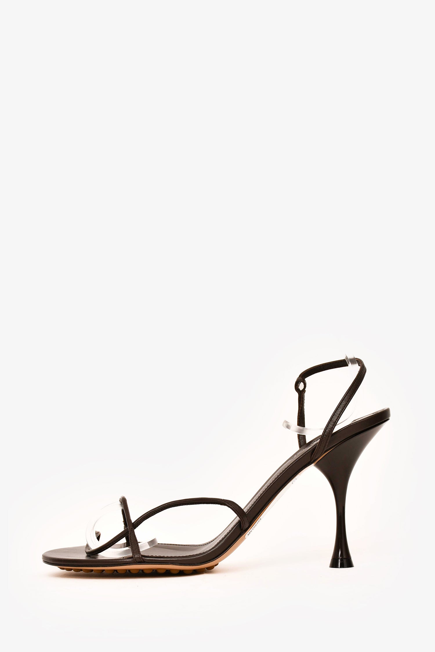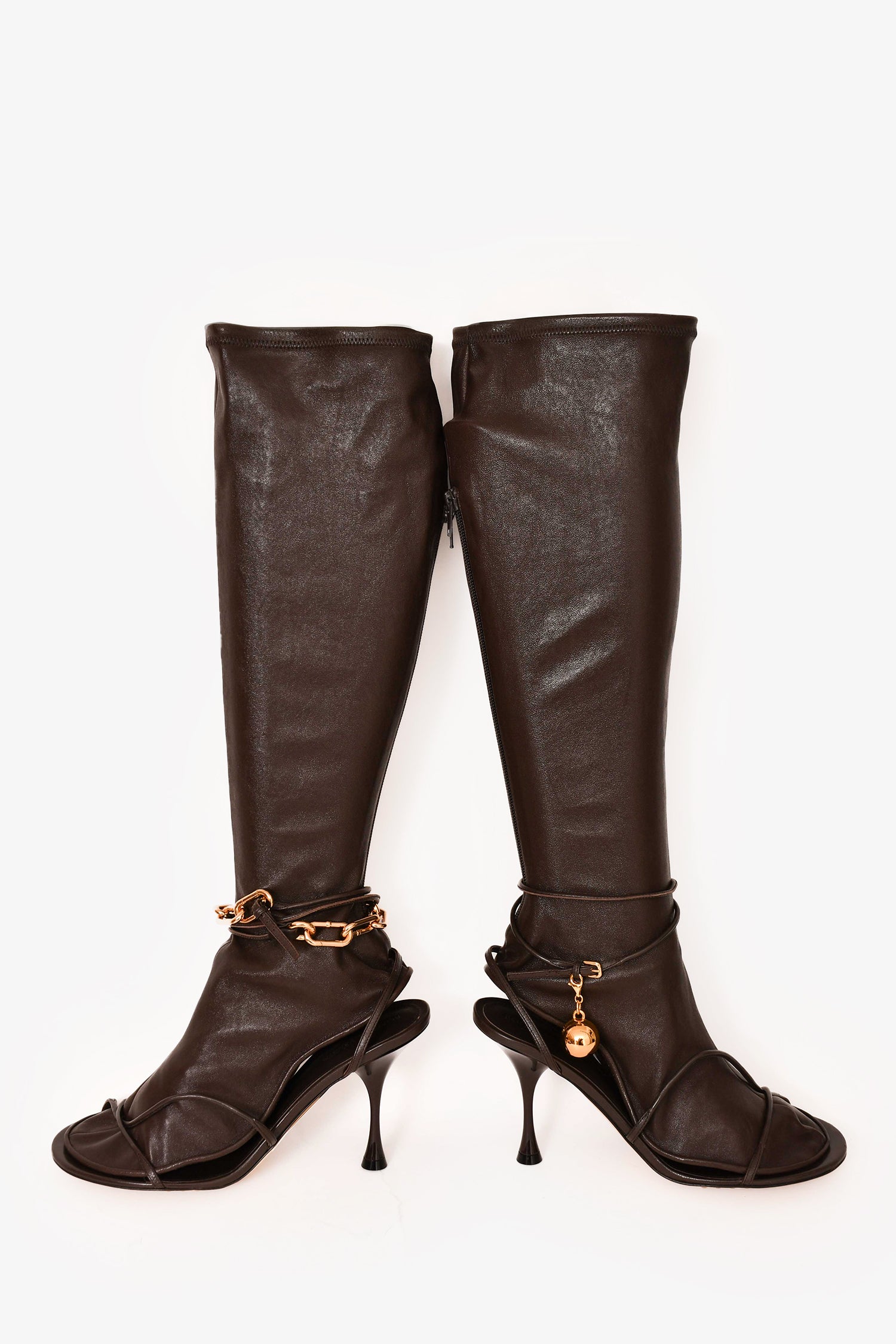 Refresh availabilityBottega Veneta Brown Leather Sandal Heels with Boot Sleeves. Sandals with open toe. Strappy sandal with adjustable ankle strap and buckle closure. Gold-tone hardware. Detachable leather boot sleeves. Tonal stitching. Comes with dust bags.