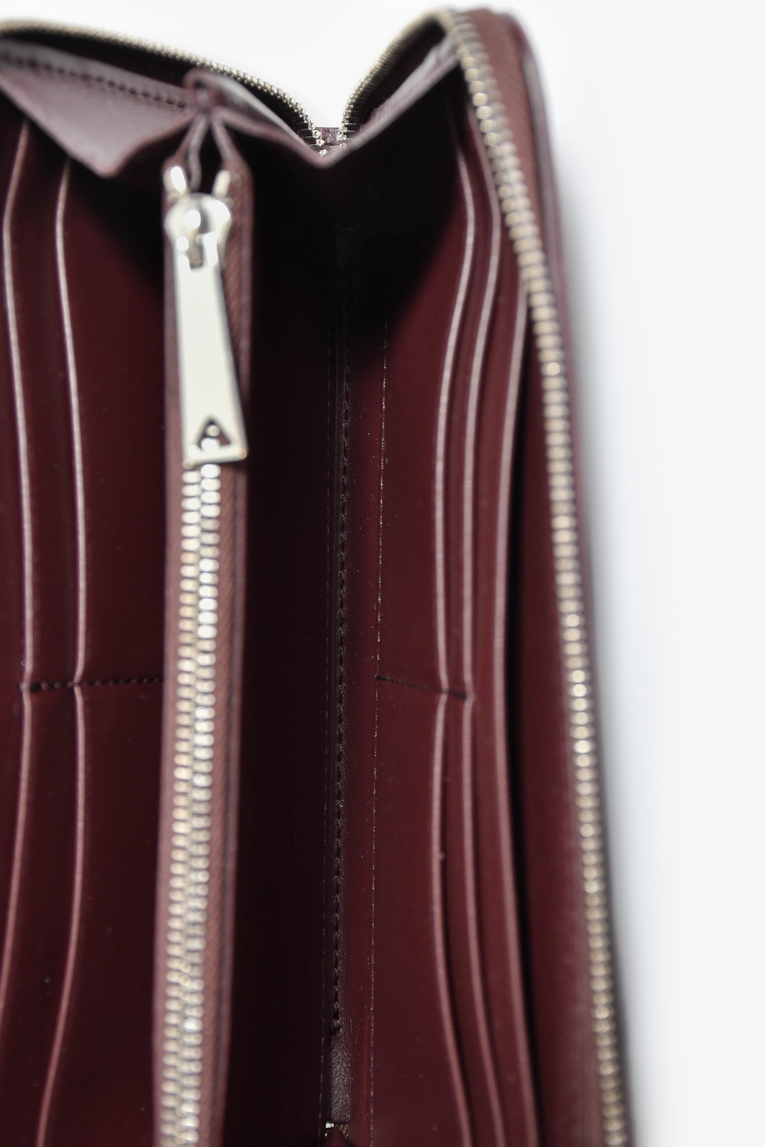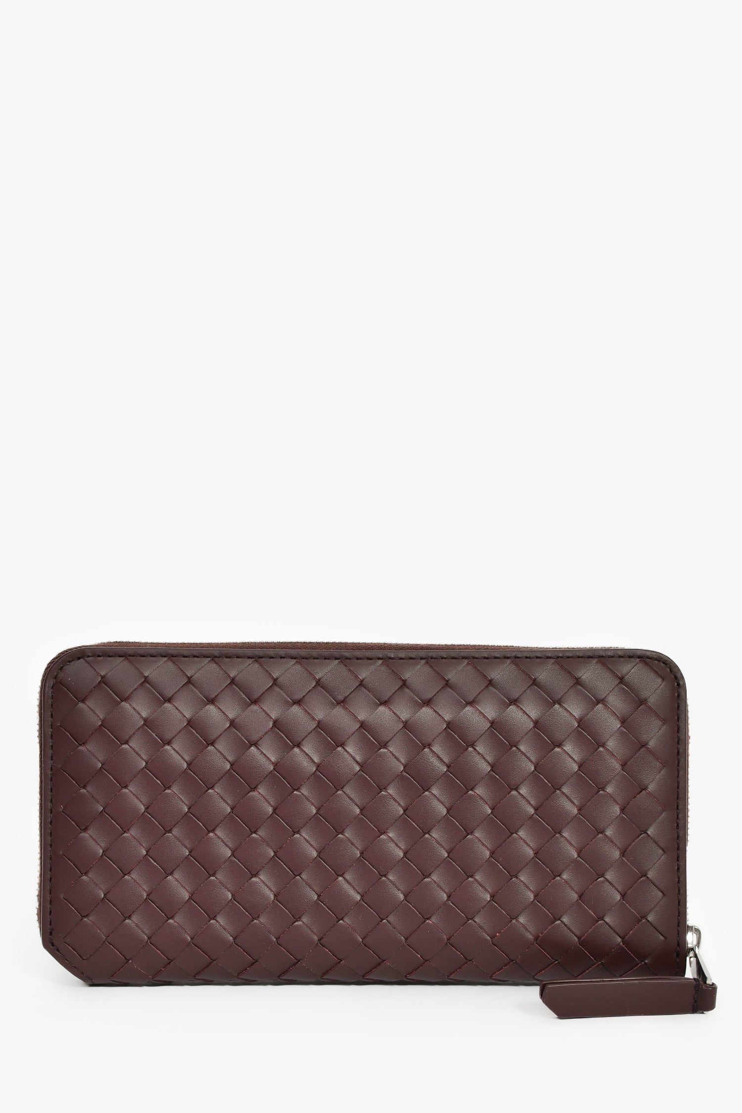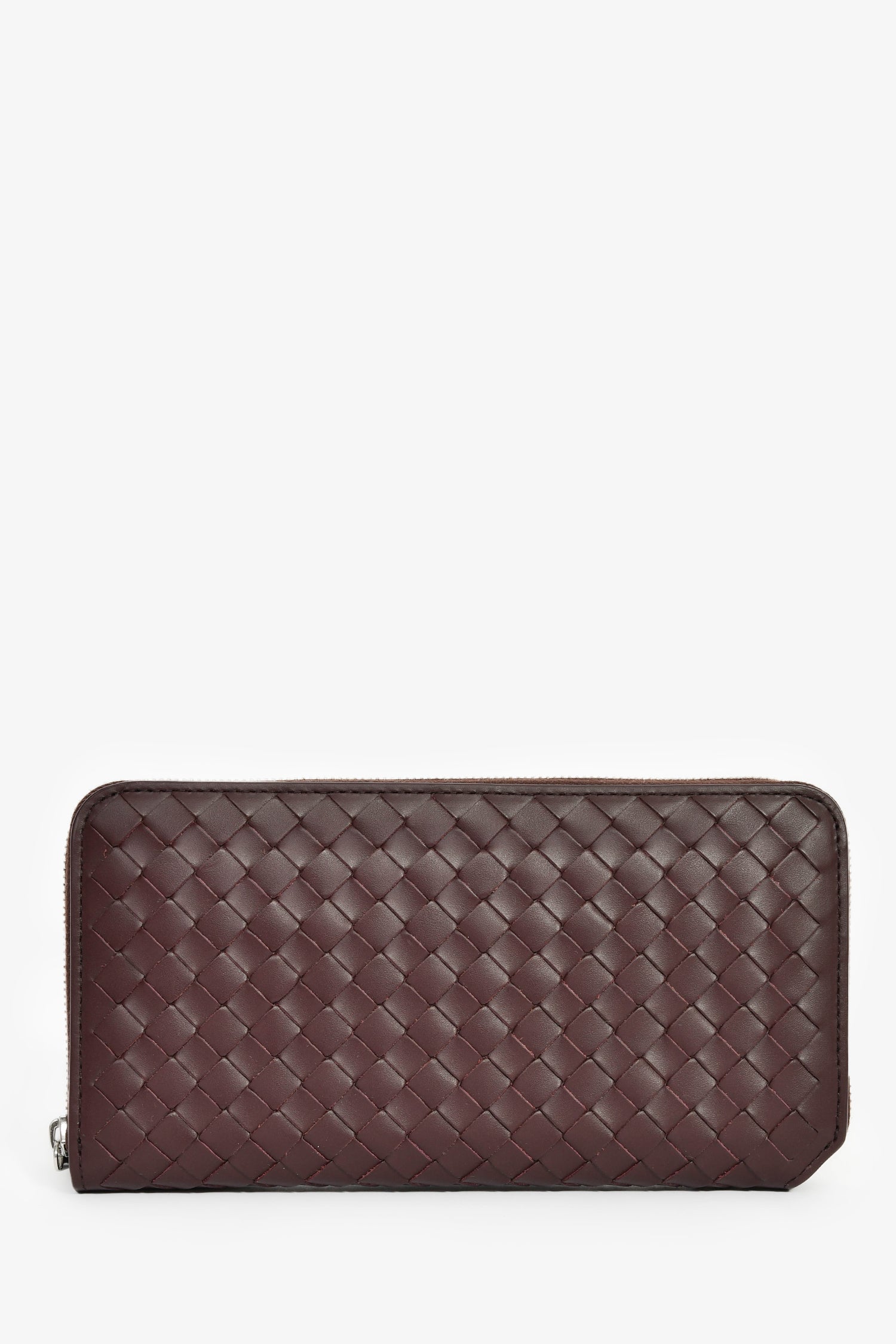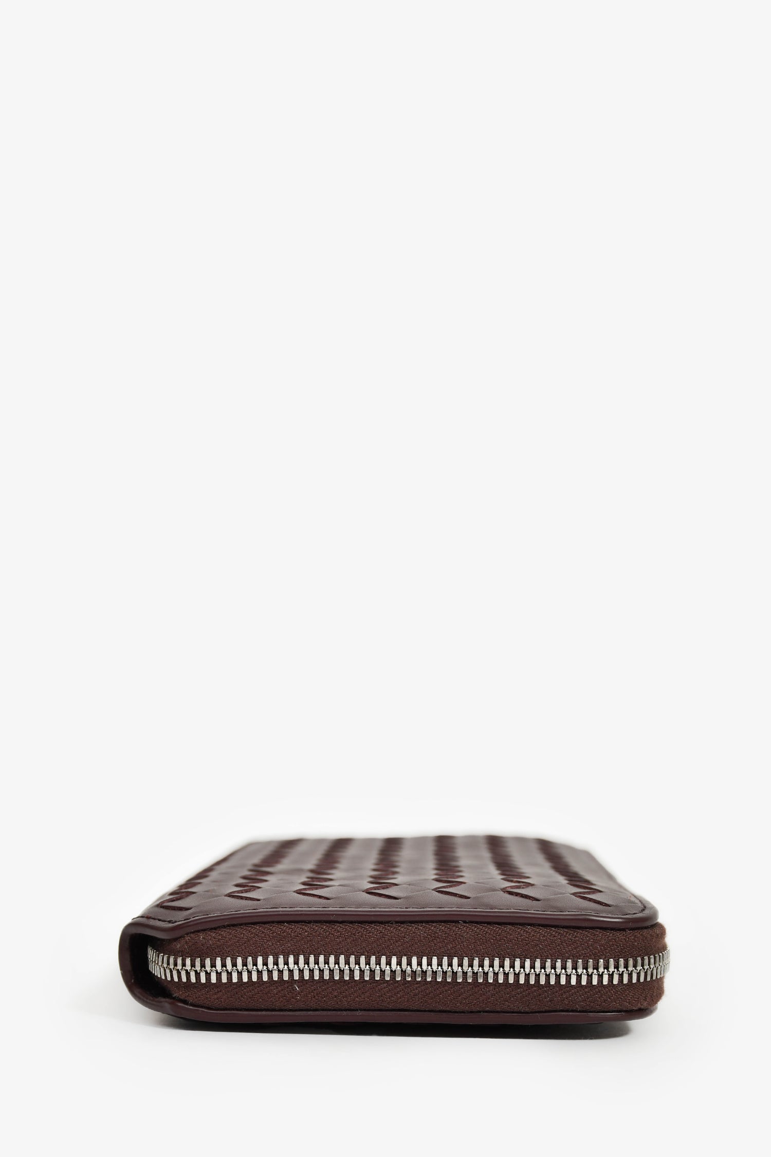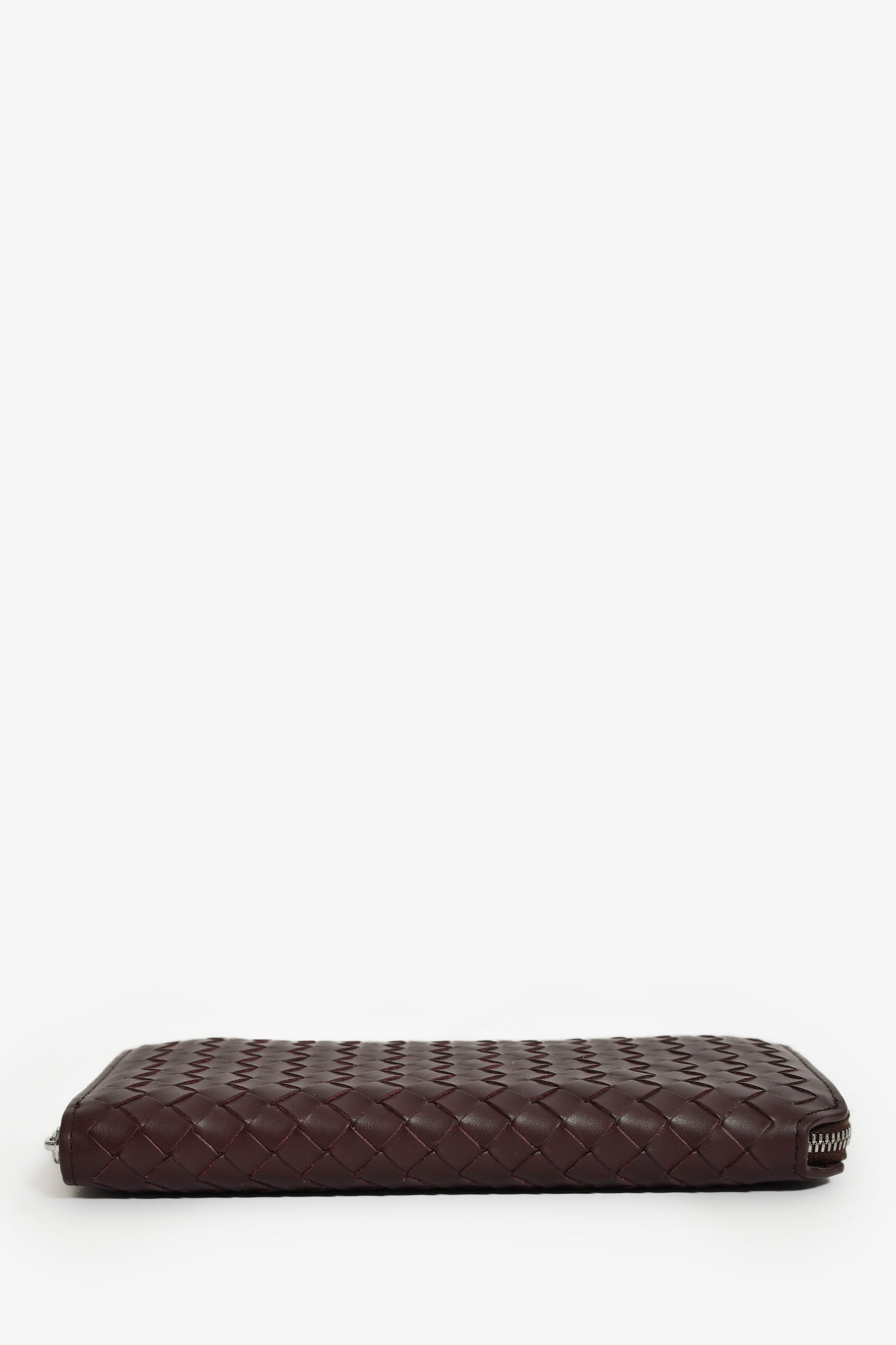 Refresh availabilityBottega Veneta Dark Barolo Intrecciato Leather Piccolo Zip Around Wallet. Top zip closure. 2 interior compartments separated by zip pocket. 4 interior card slots in each compartment. 2 interior bill fold pockets on either side. Silver-tone hardware. Tonal stitching.