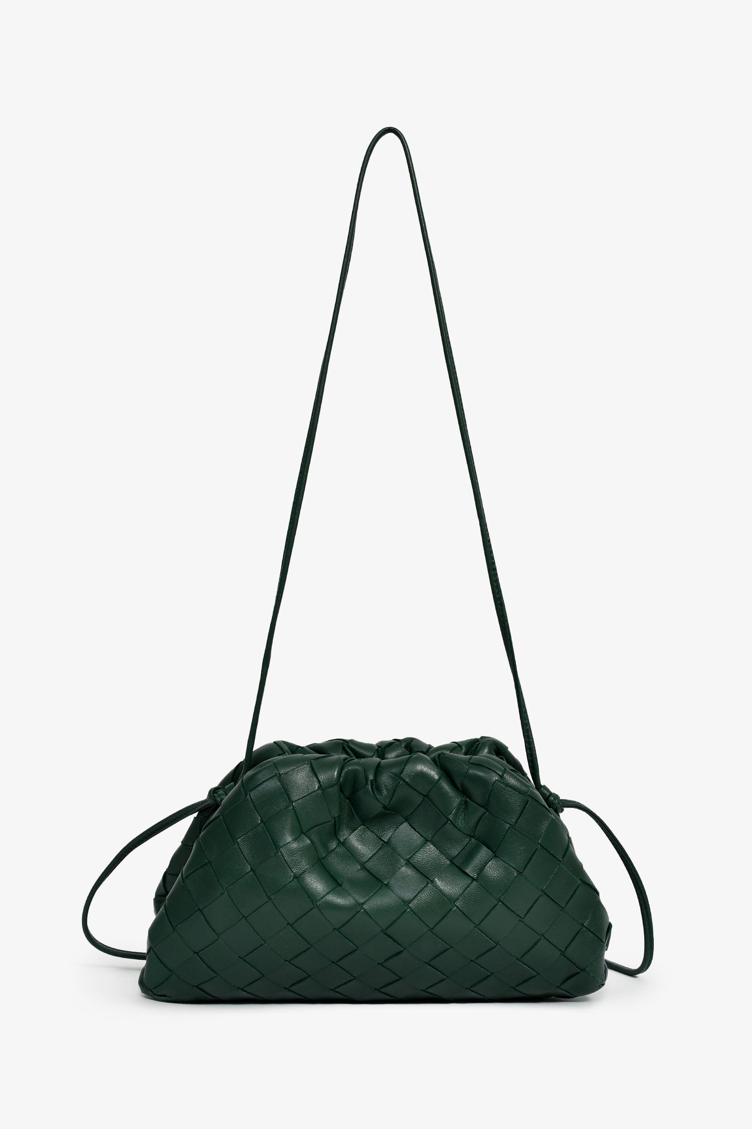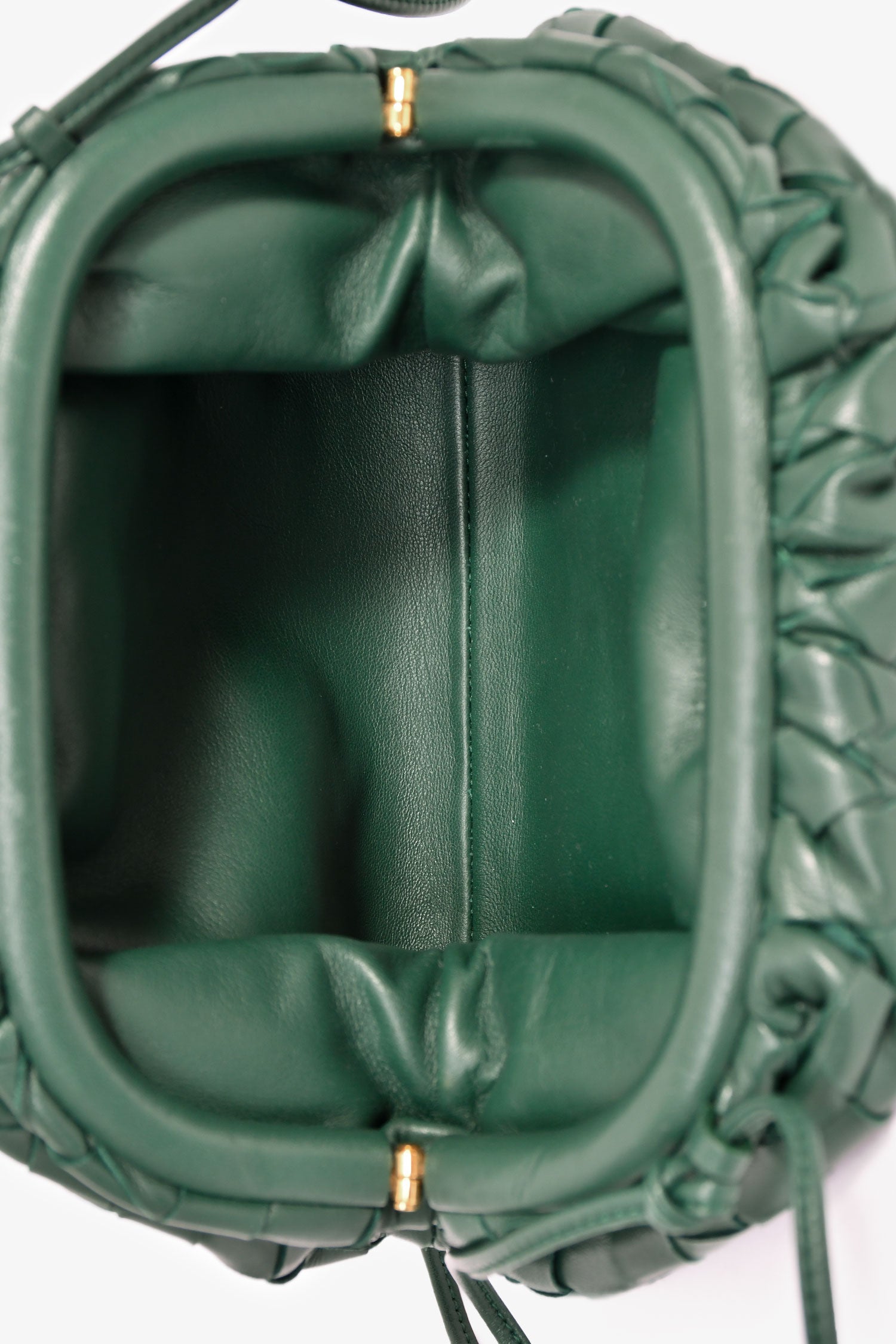 Refresh availabilityBottega Veneta Forest Green Intrecciato Leather Mini Pouch Bag. Hinge opening. Single crossbody strap. Lined leather interior. Gold-tone hardware. Tonal stitching.