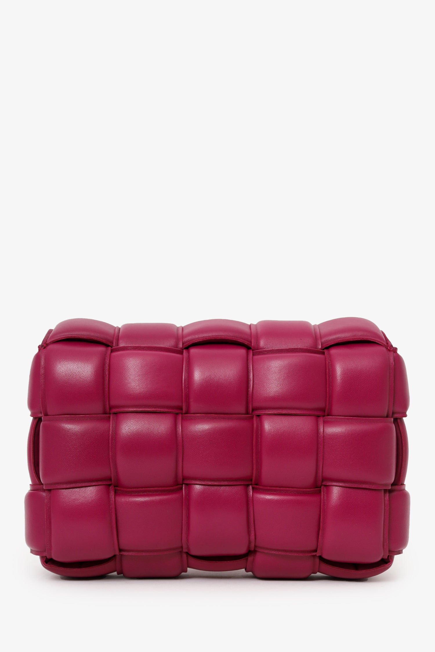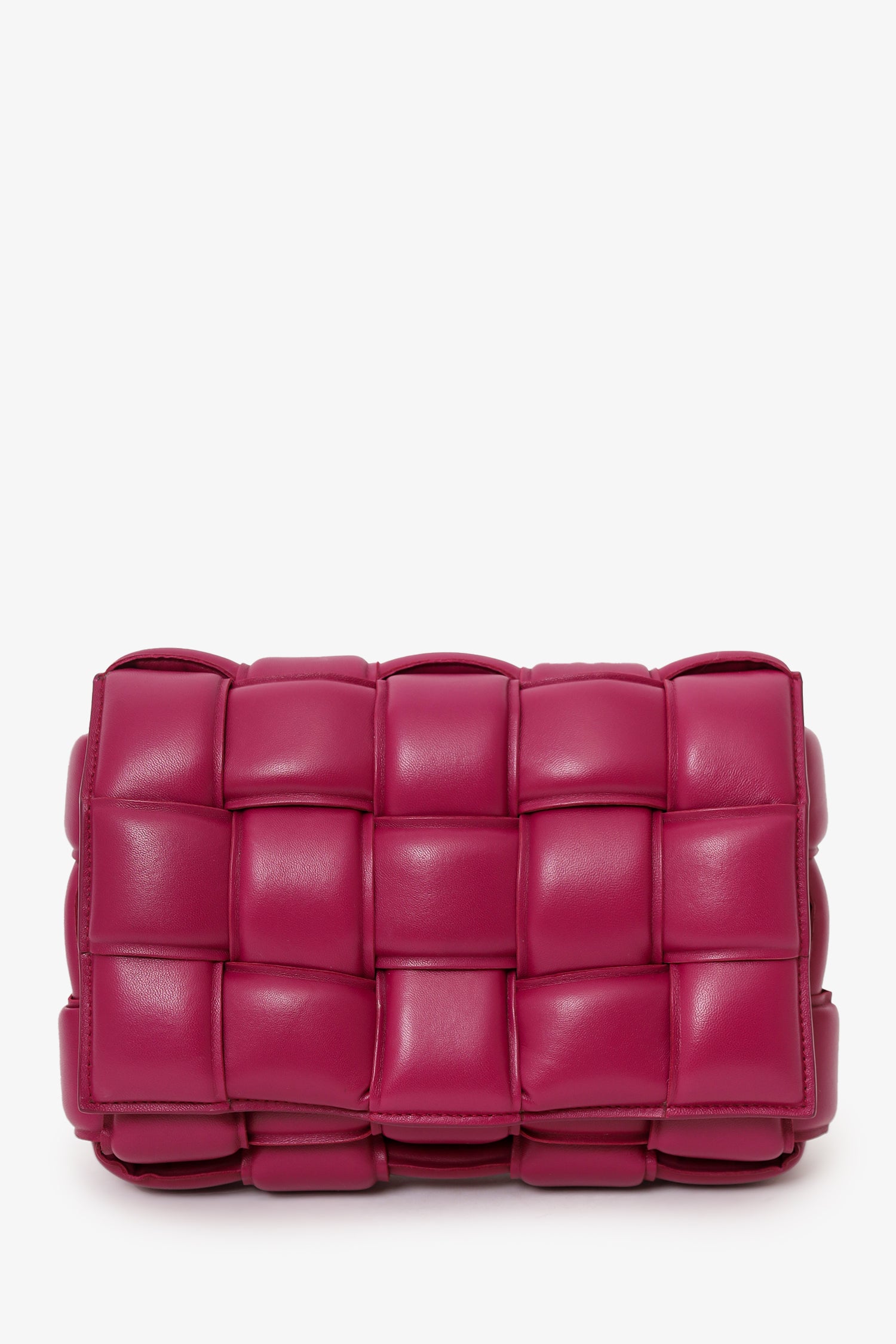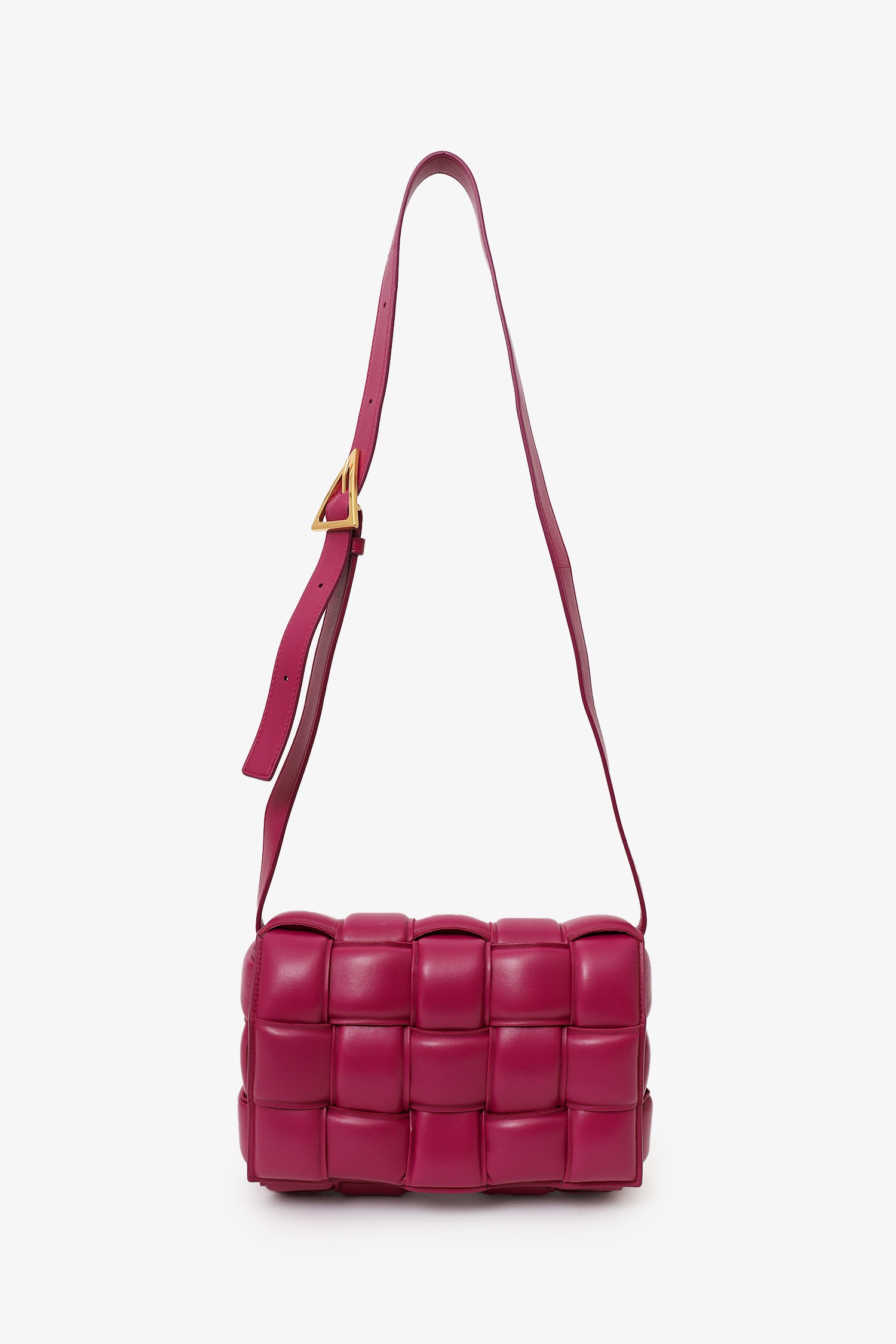 Refresh availabilityBottega Veneta Fuchsia Pink Leather Cassette Crossbody. Front fold-over slip-lock closure. Adjustable strap with triangle buckle closure. Open unlined interior. 2 interior pockets; 1 zip and 1 slip. Gold-tone hardware. Tonal stitching.
