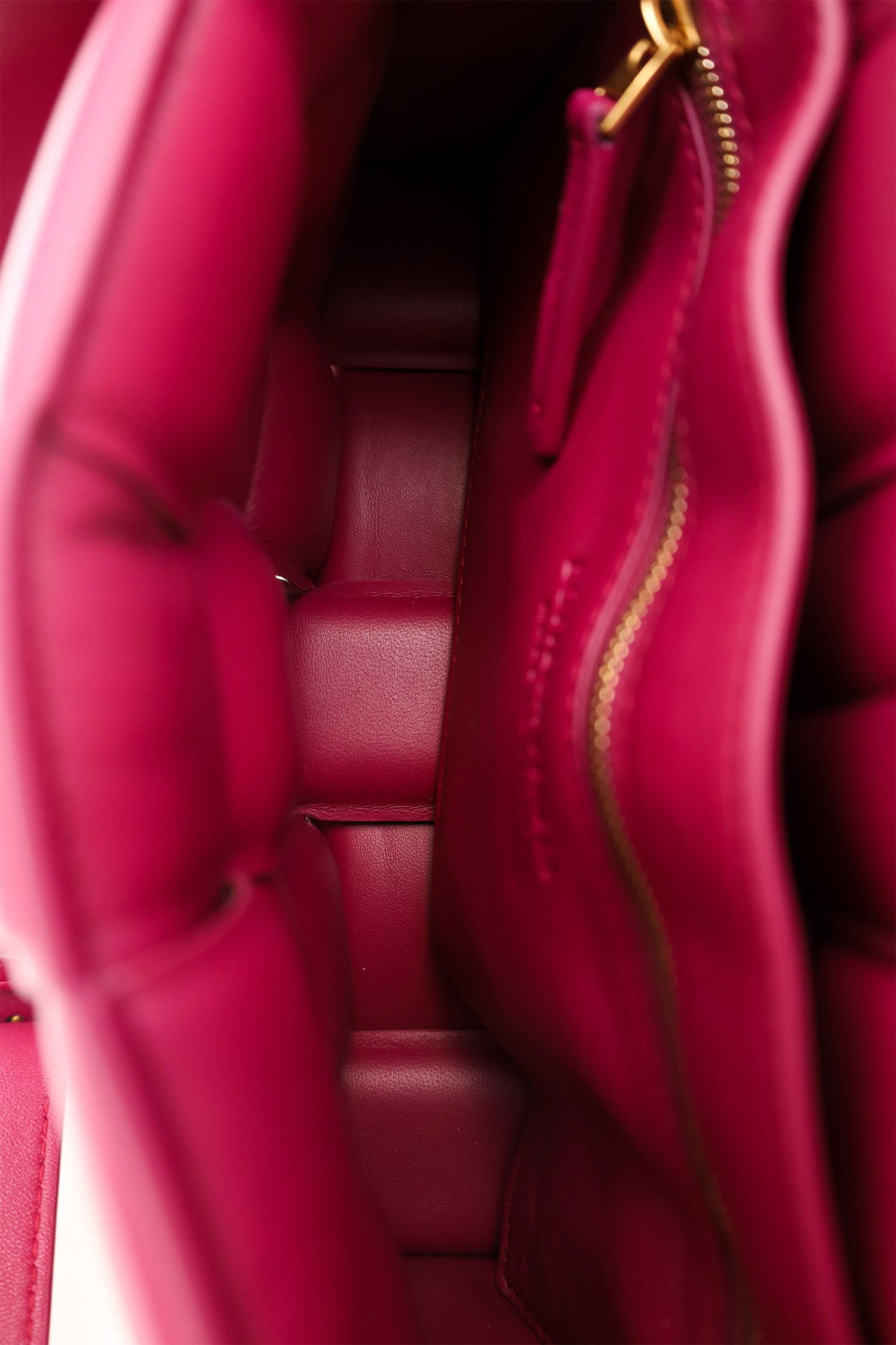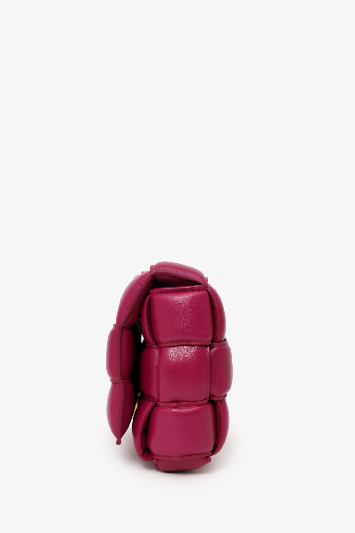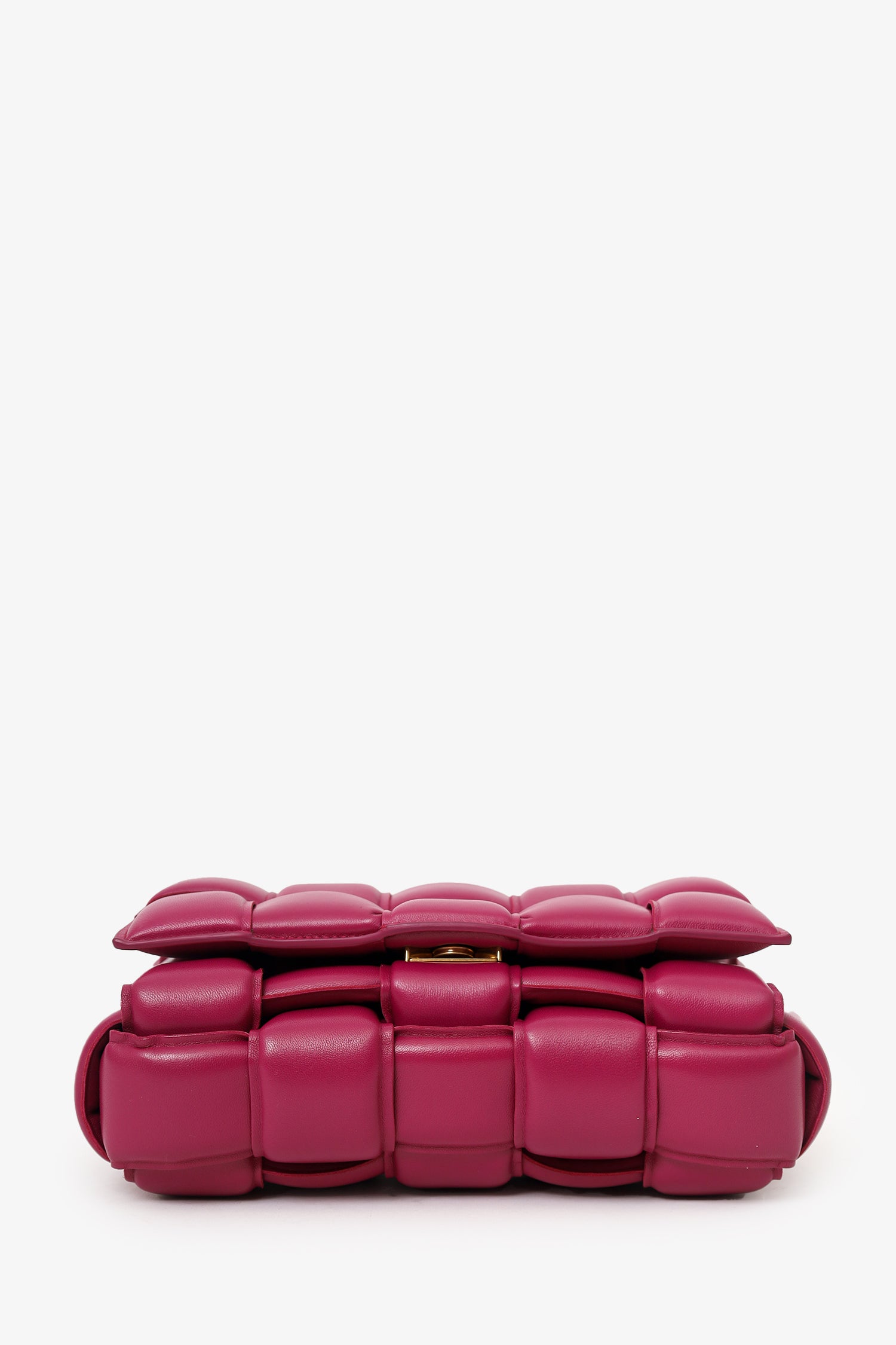 Refresh availabilityBottega Veneta Fuchsia Pink Leather Cassette Crossbody. Front fold-over slip-lock closure. Adjustable strap with triangle buckle closure. Open unlined interior. 2 interior pockets; 1 zip and 1 slip. Gold-tone hardware. Tonal stitching.