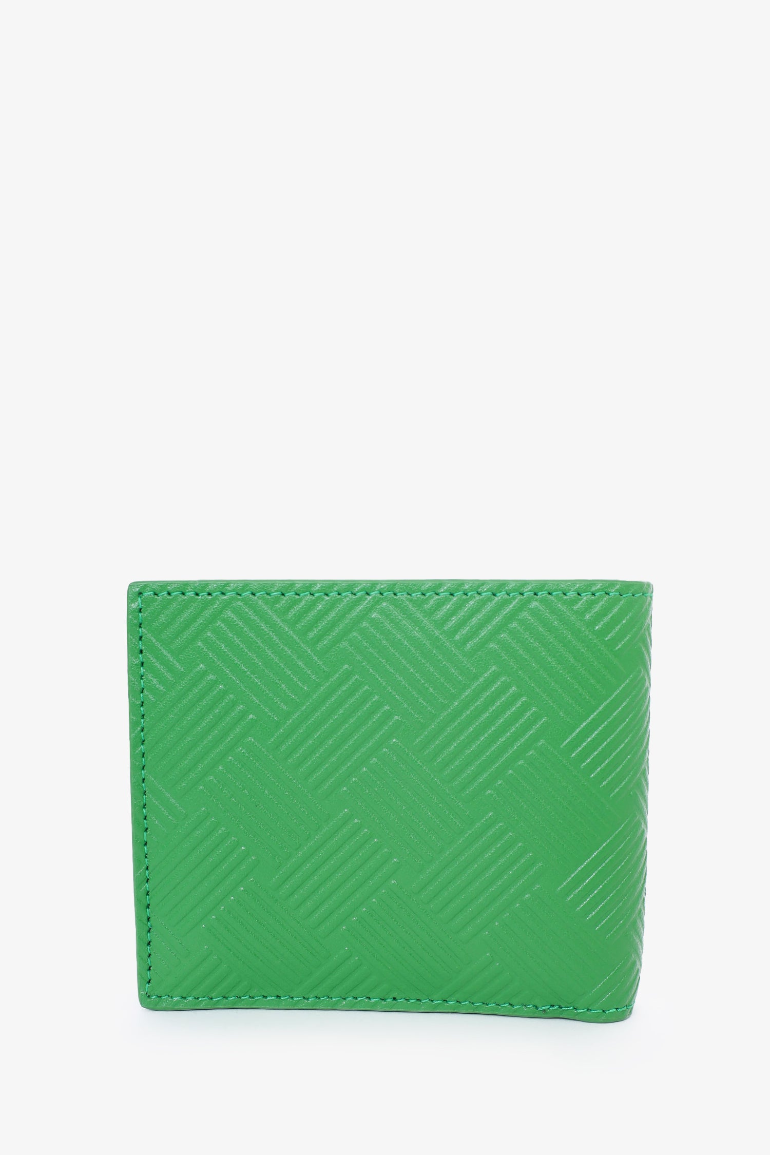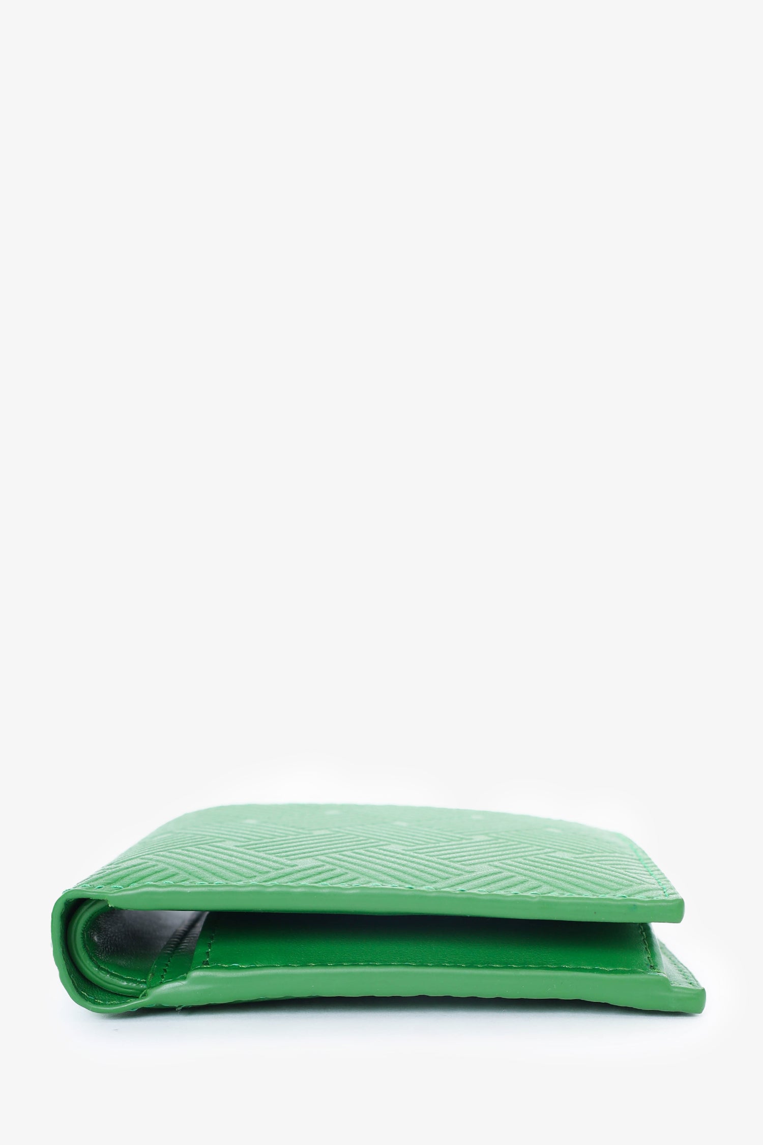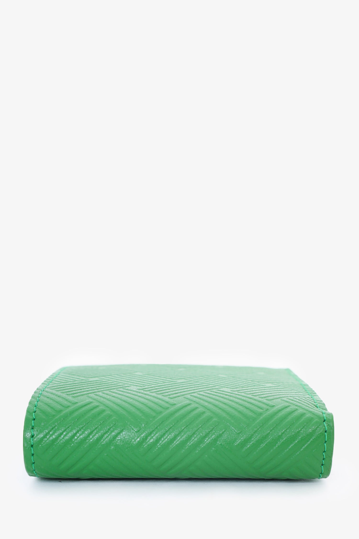 Refresh availabilityBottega Veneta Green Embossed Intrecciato Leather Bifold Wallet. Fold open. 2 interior bill fold pockets at back of interior. 4 interior card slip pockets. Single interior snap button coin pouch with slip pocket underneath. Tonal stitching.