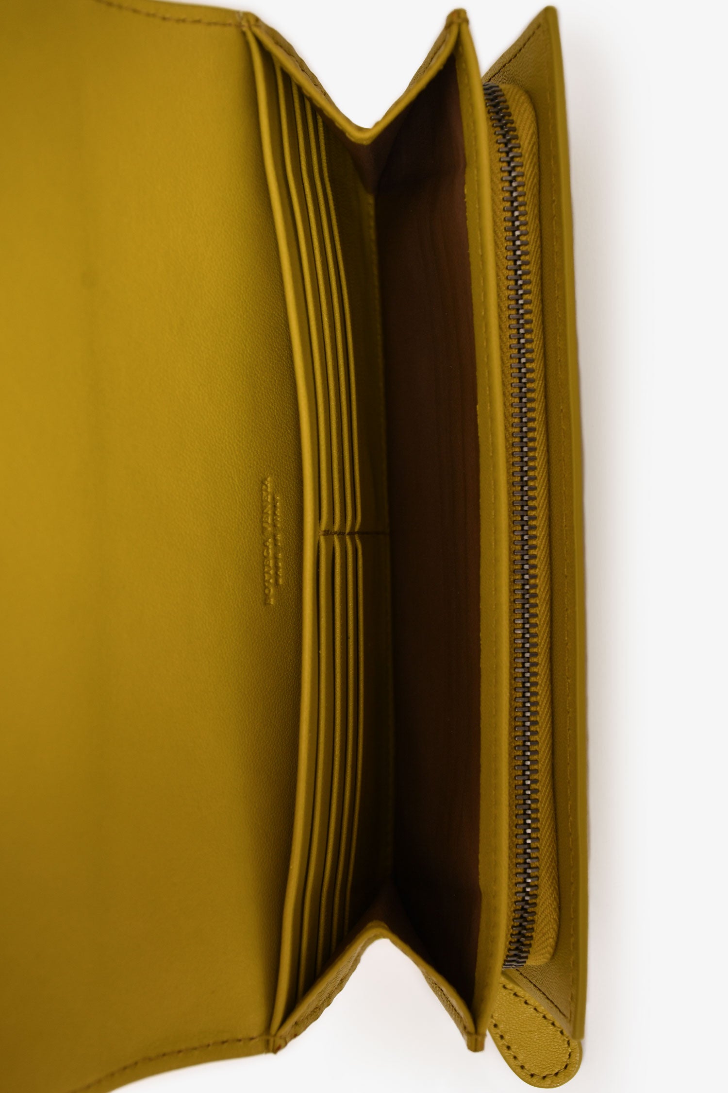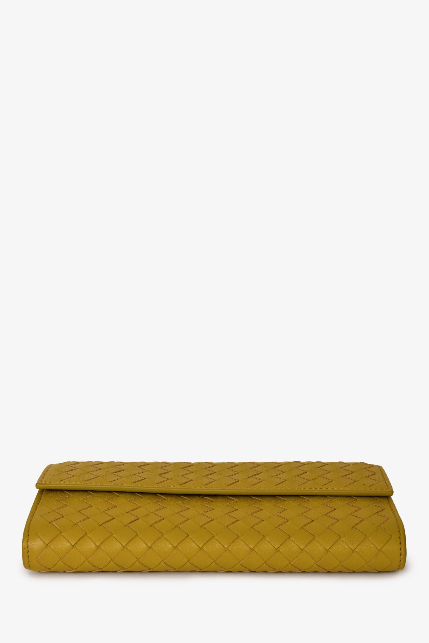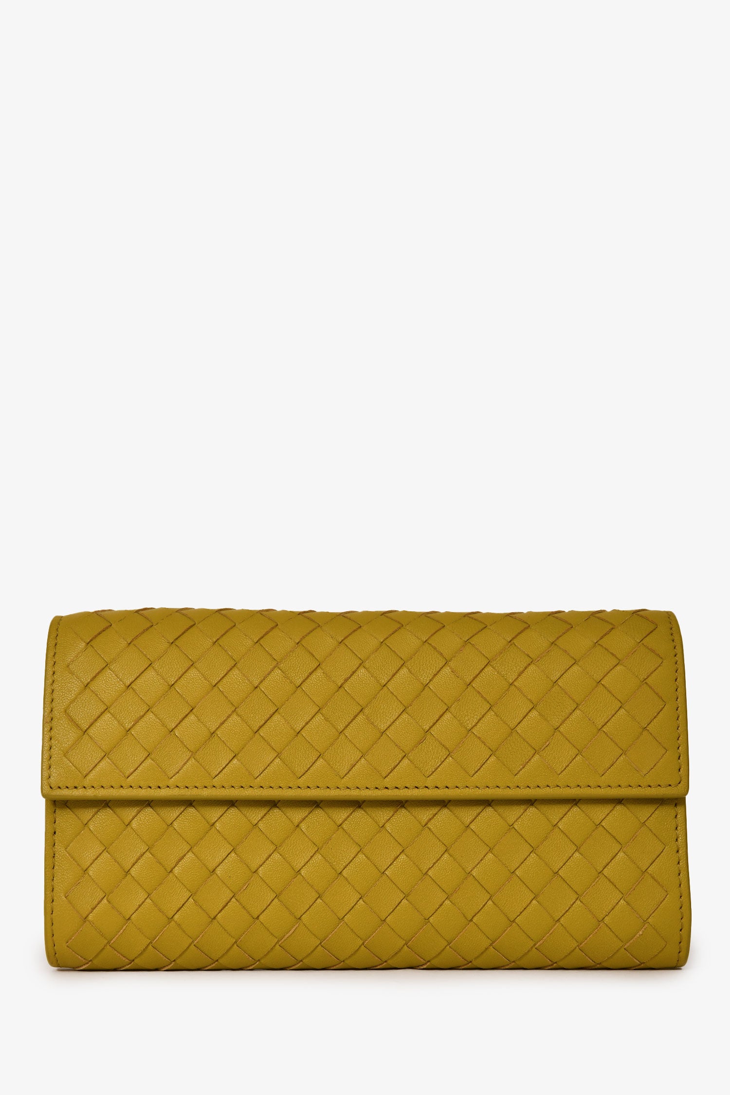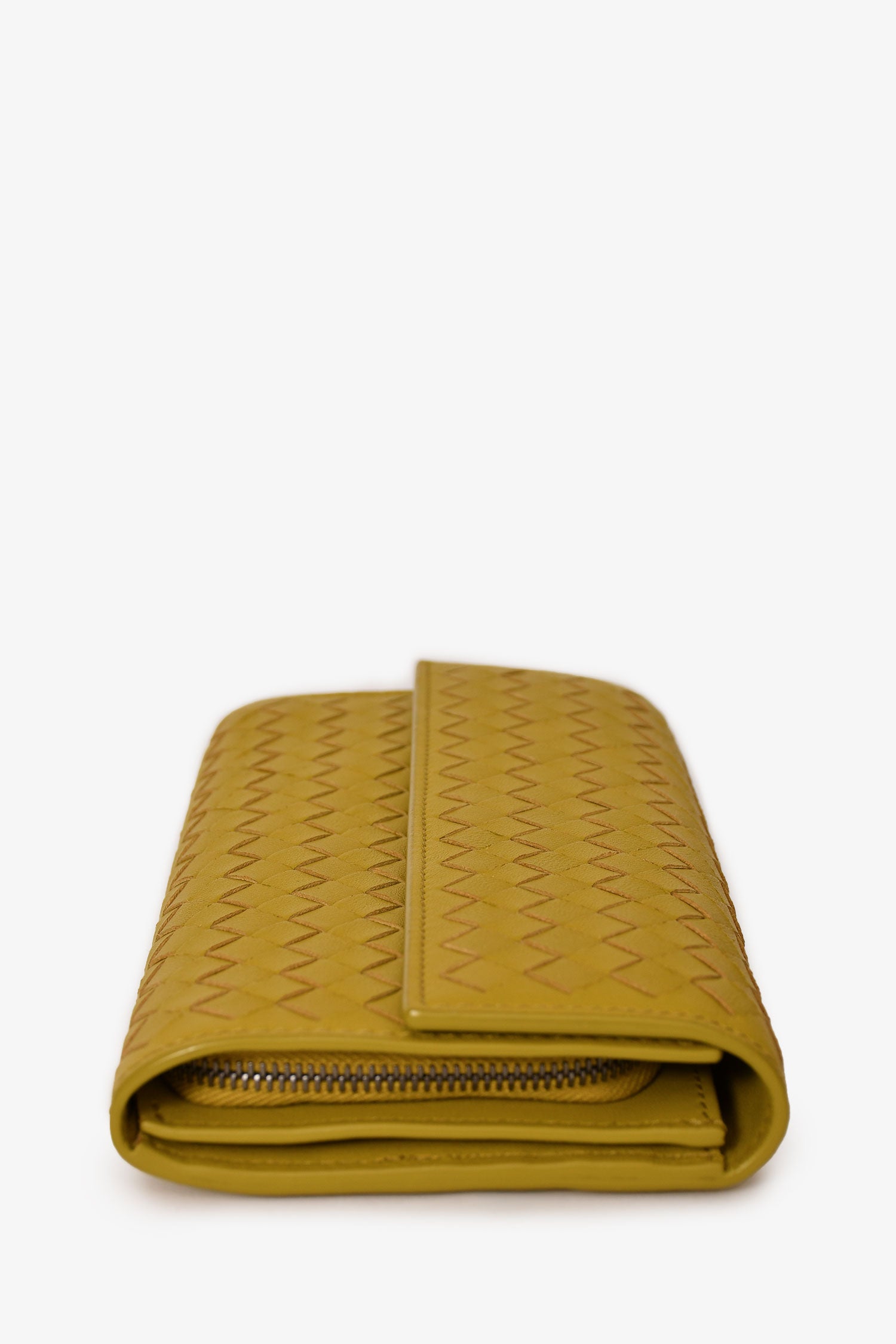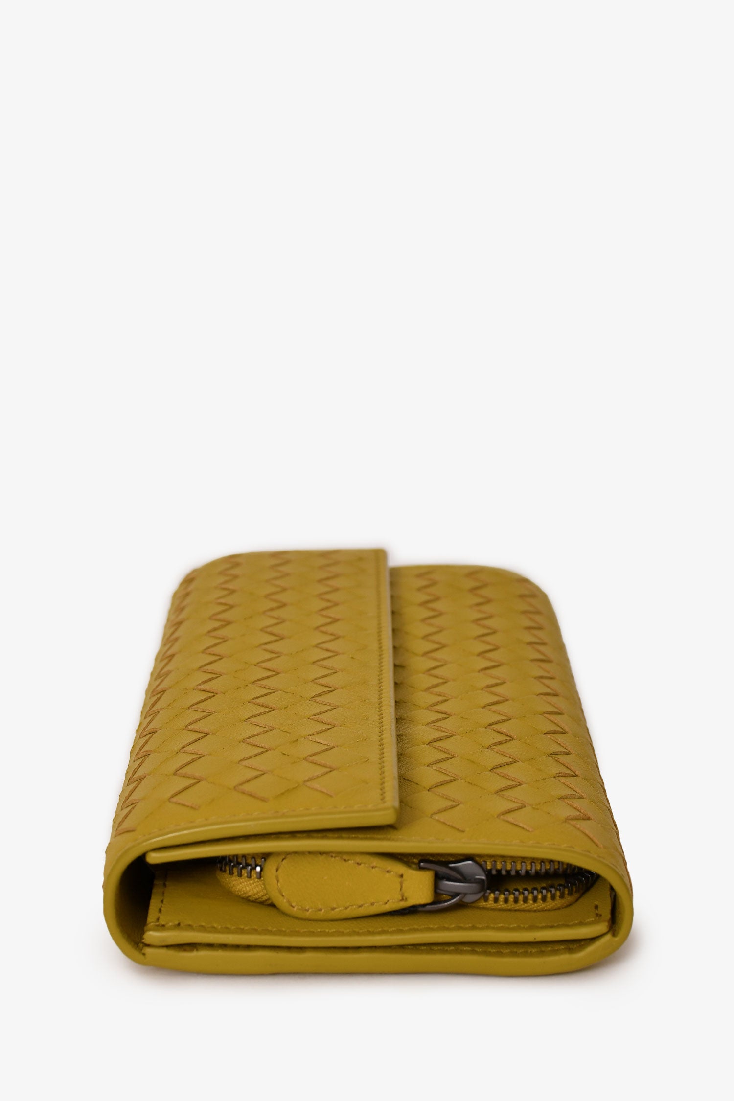 Refresh availabilityBottega Veneta Green Leather Intrecciato Long Wallet. Front fold-over flap with snap button closure. Single interior zip compartment. 2 interior slip compartments. 8 interior card slots. Silver-toned hardware. Tonal stitching.