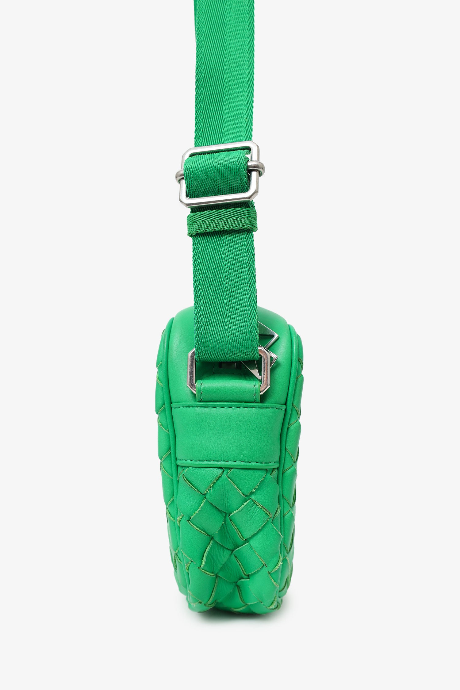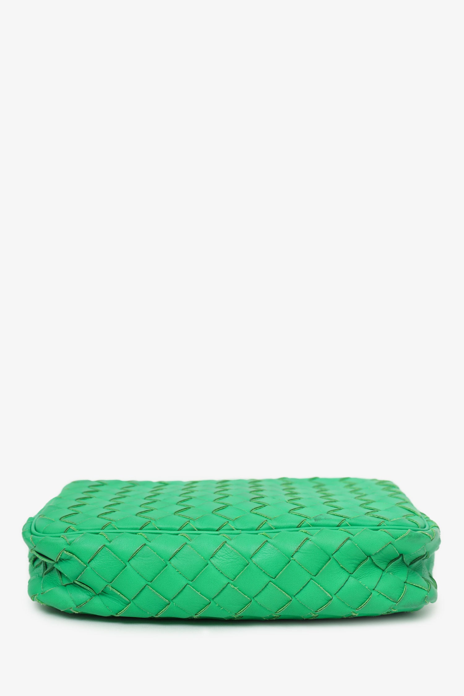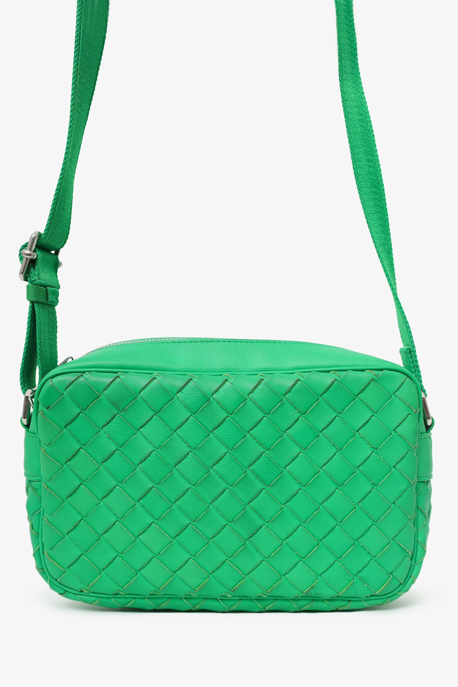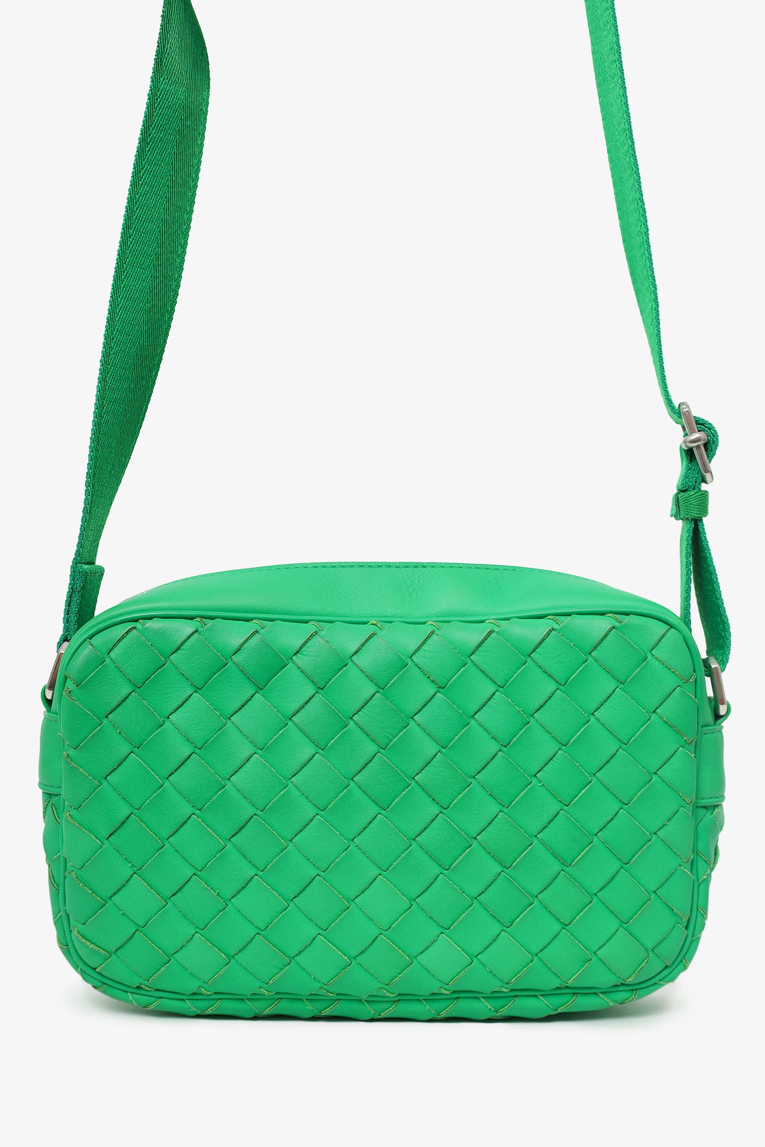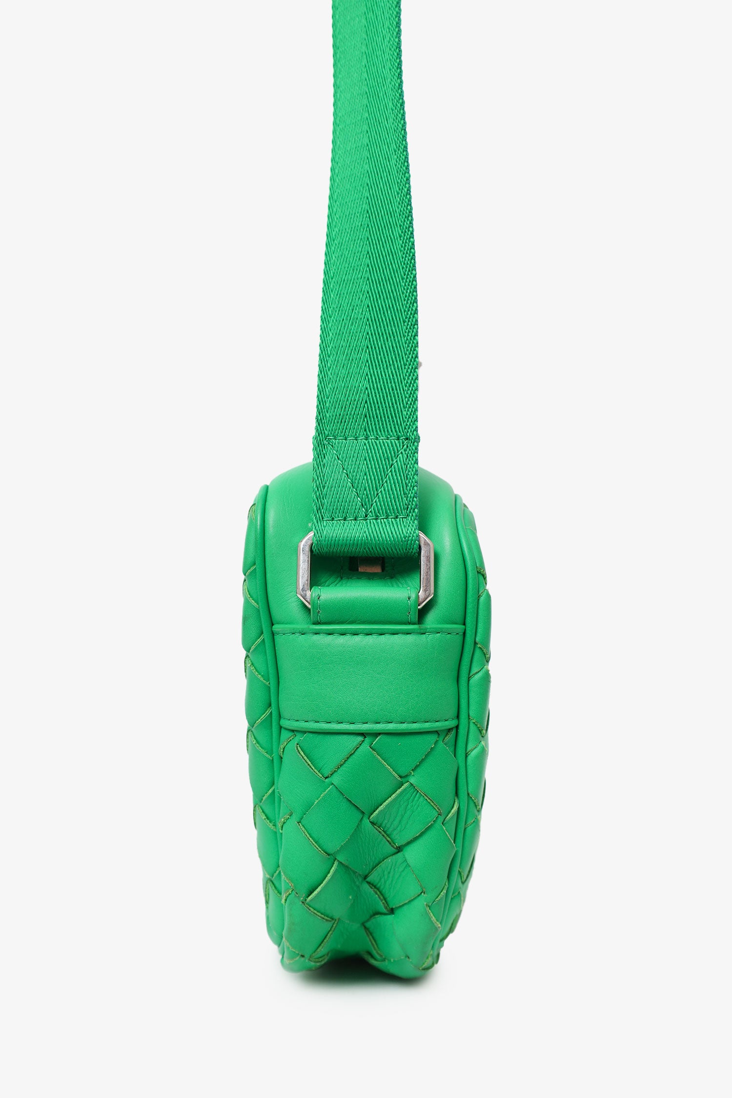 Refresh availabilityBottega Veneta Green Small Intrecciato Camera Bag. Top two-way zip closure. Adjustable shoulder strap with buckle closure. Open leather interior. Silver-tone hardware. Tonal stitching.
