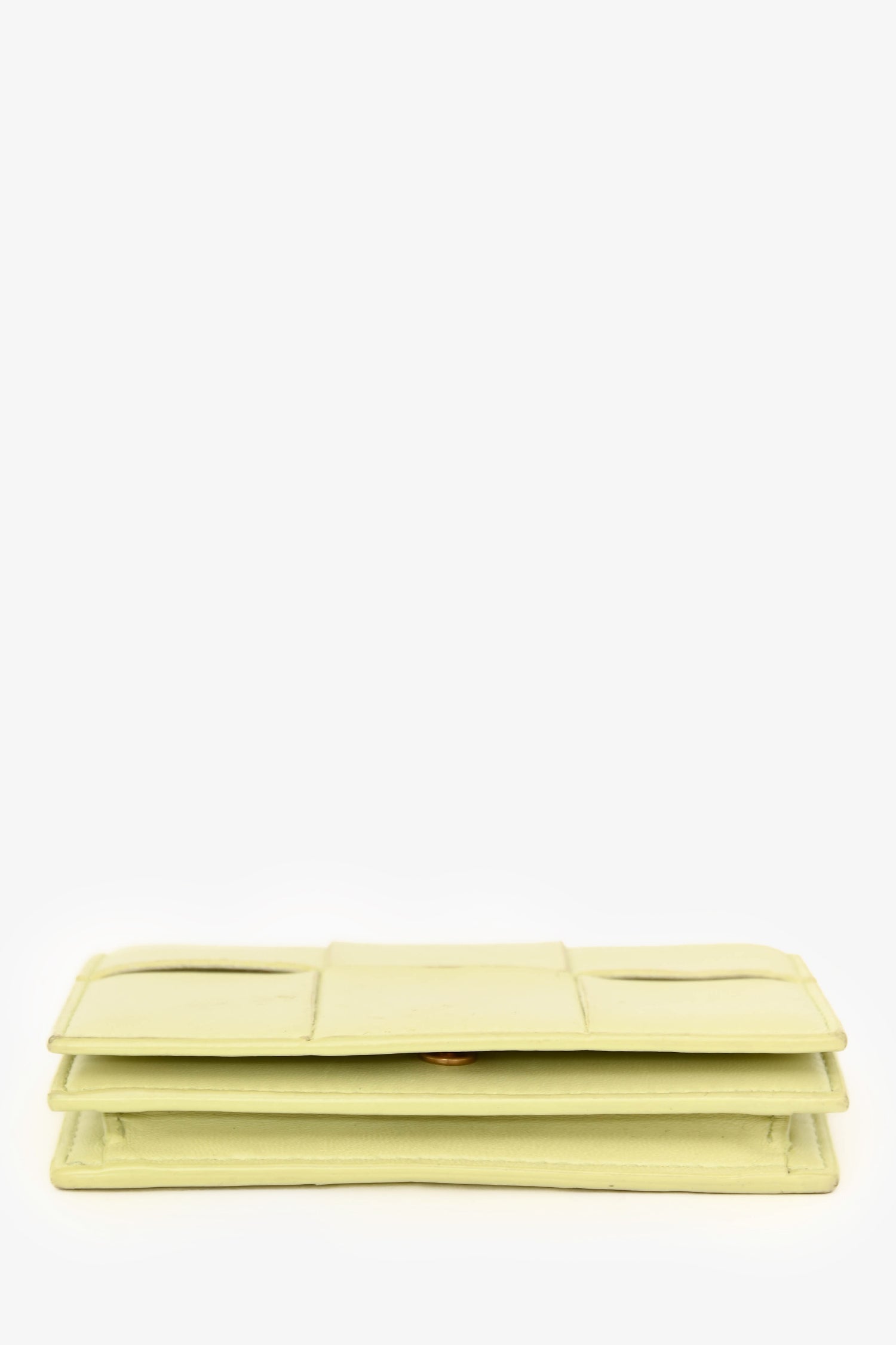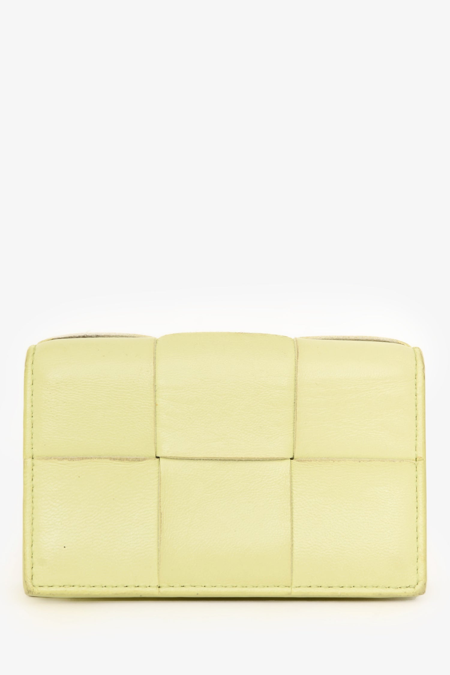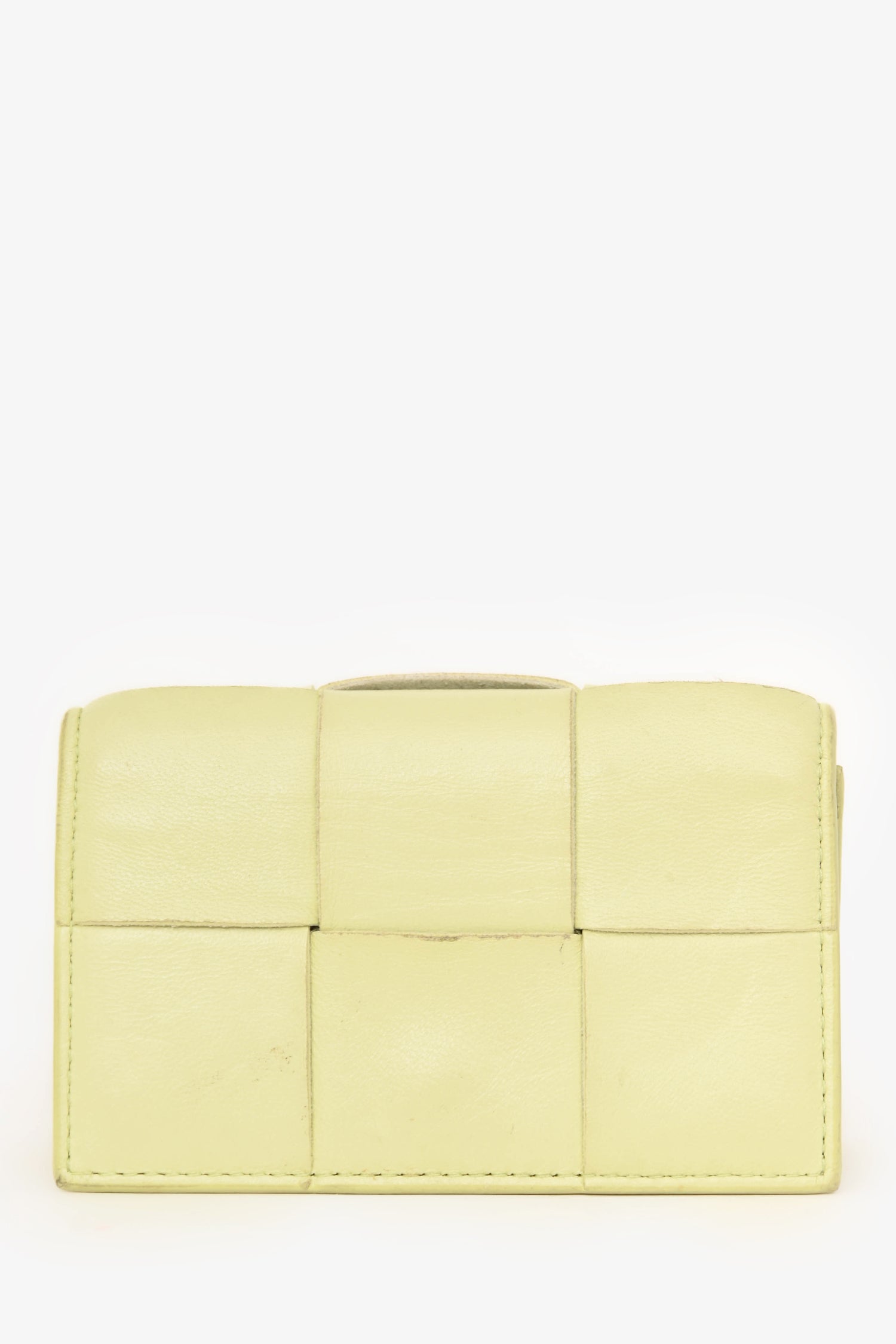 Refresh availabilityBottega Veneta Light Yellow Cassette Card Holder. Front fold-over flap with a snap closure. 2 interior card slots. Gold-tone hardware. Tonal stitching.