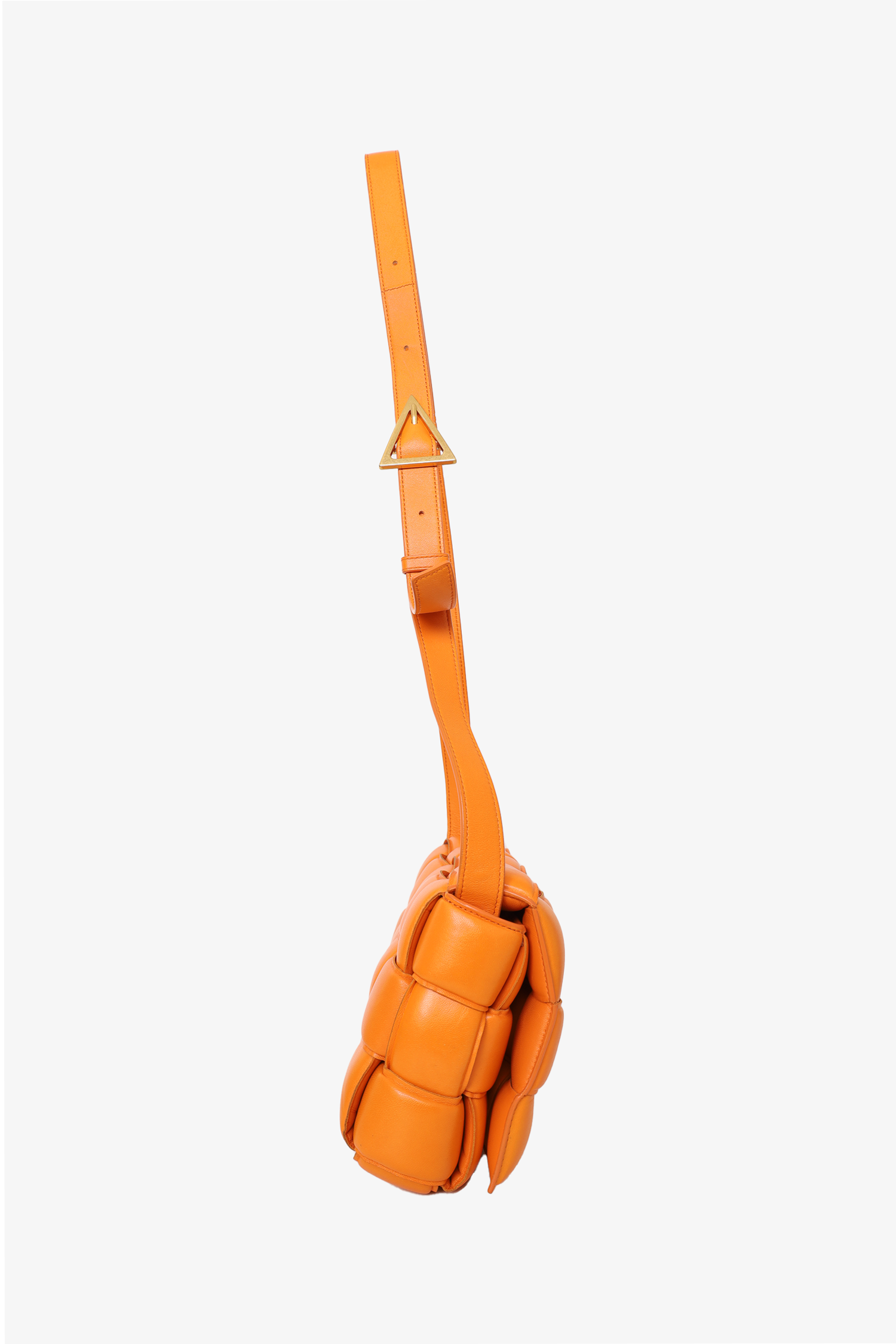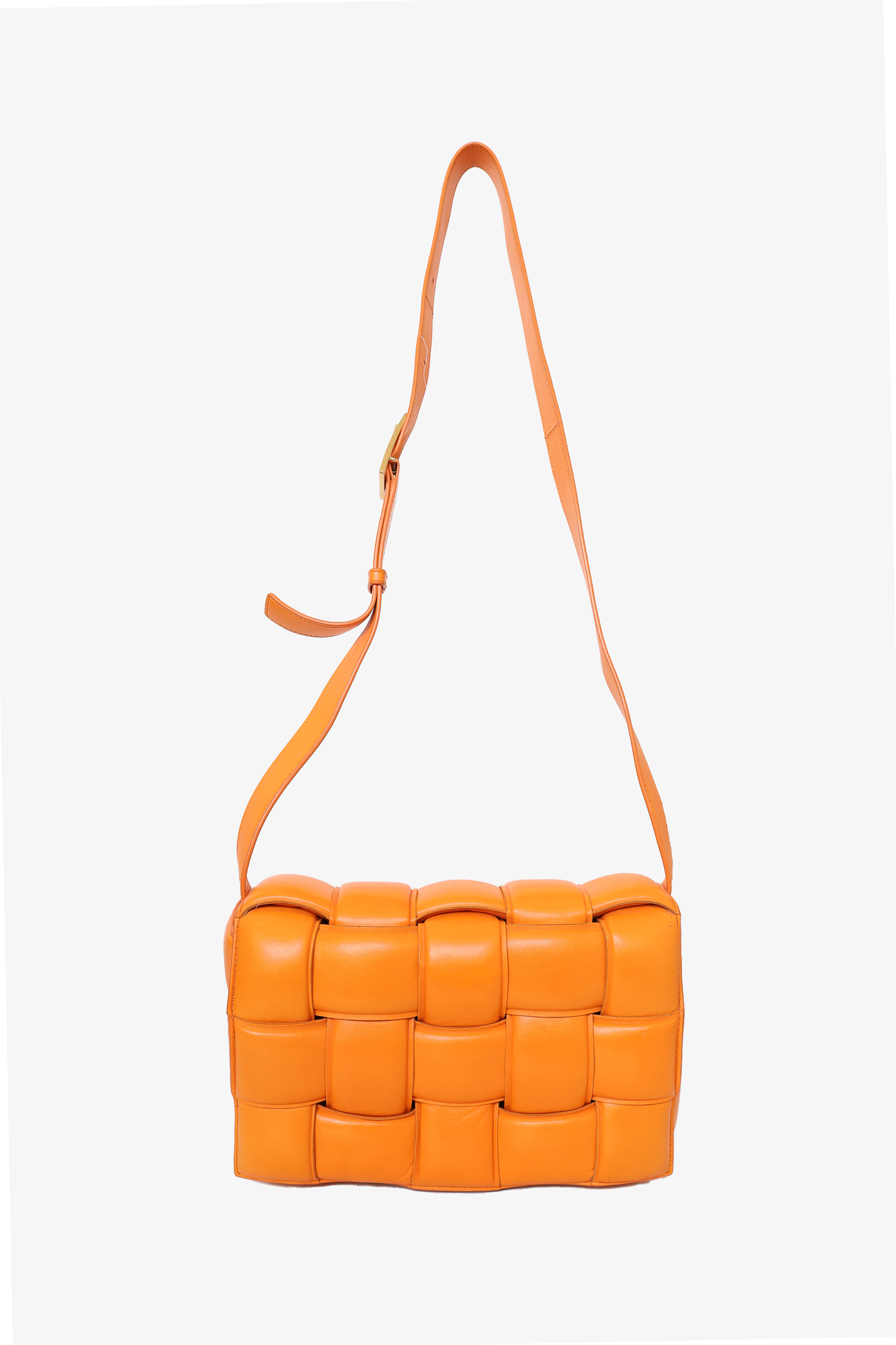 Refresh availabilityBottega Veneta Orange Leather "Padded Cassette" Shoulder Bag. 1 interior zip pocket. Clasp closure. Adjustable buckle strap. Gold-tone hardware. Tonal stitching.