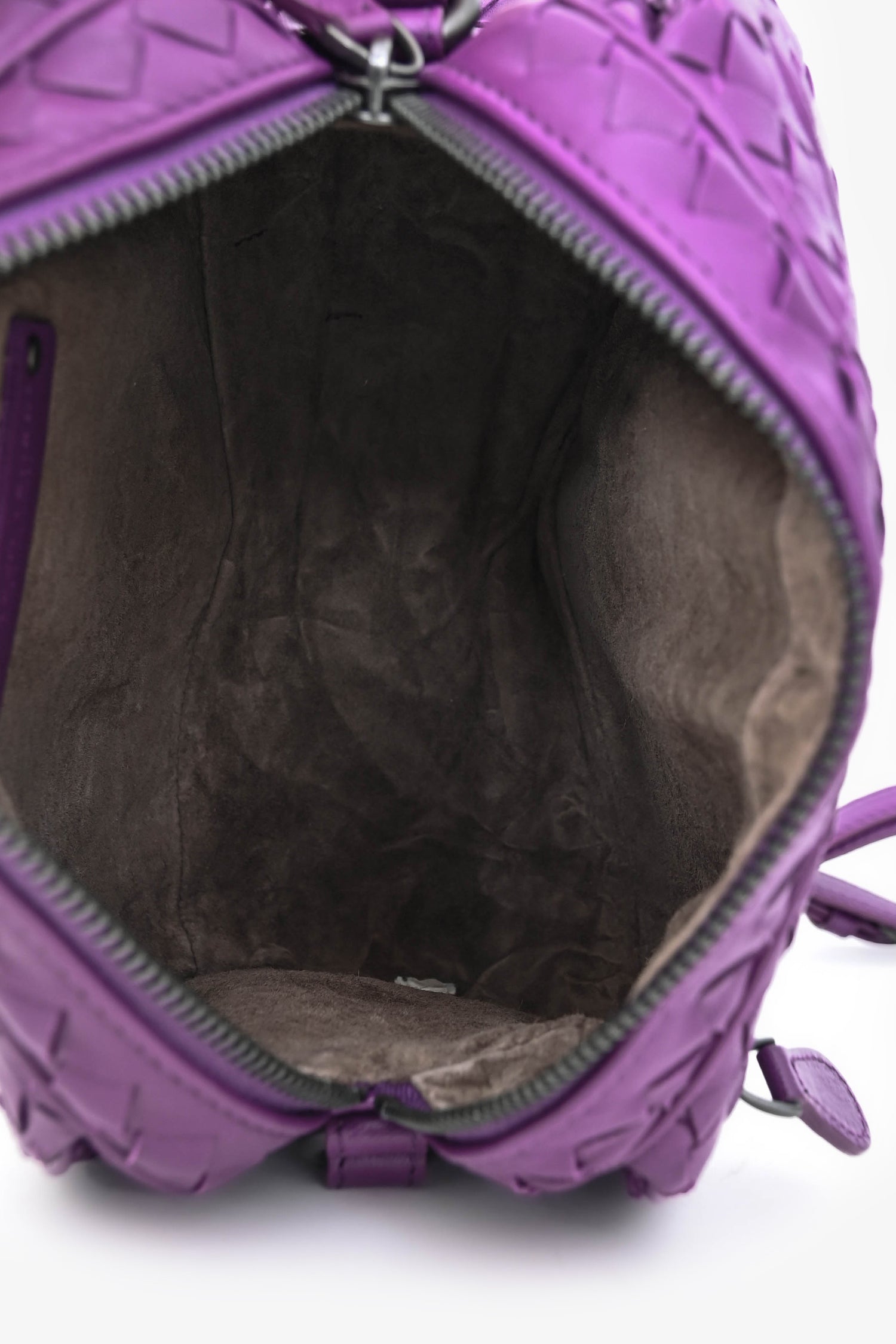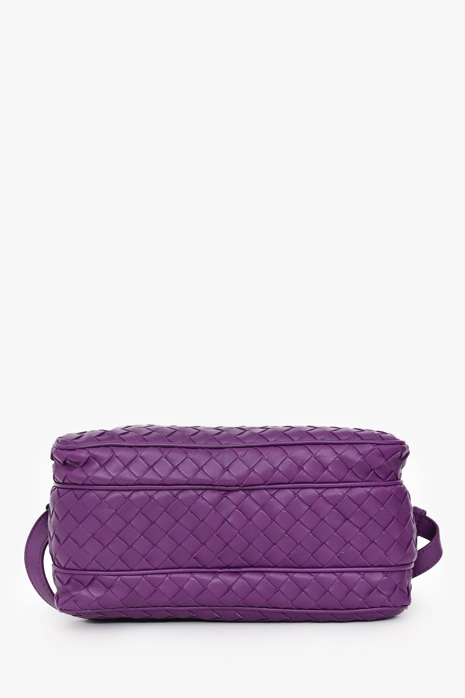 Refresh availabilityBottega Veneta Purple Intrecciato Leather Camera Crossbody Bag. Top zipper closure. Two exterior pockets with a zipper closure. Adjustable shoulder strap. Suede interior with label detailing. Dark silver-tone hardware. Tonal stitching.