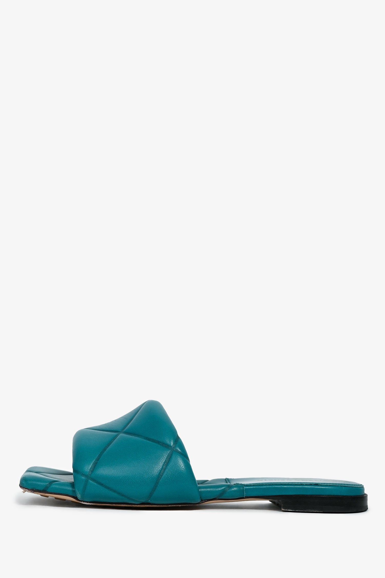 Refresh availabilityBottega Veneta Teal Quilted Leather 'Lido' Flat Sandals. Open toe. Slip-on. Tonal stitching.