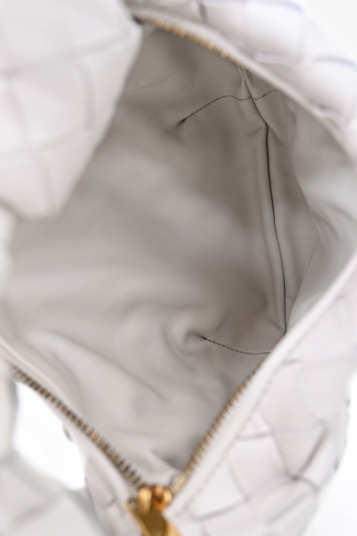Refresh availabilityBottega Veneta White Intrecciato Mini Jodie Bag. Top zip closure. Leather interior. Tonal stitching. Gold-tone hardware.