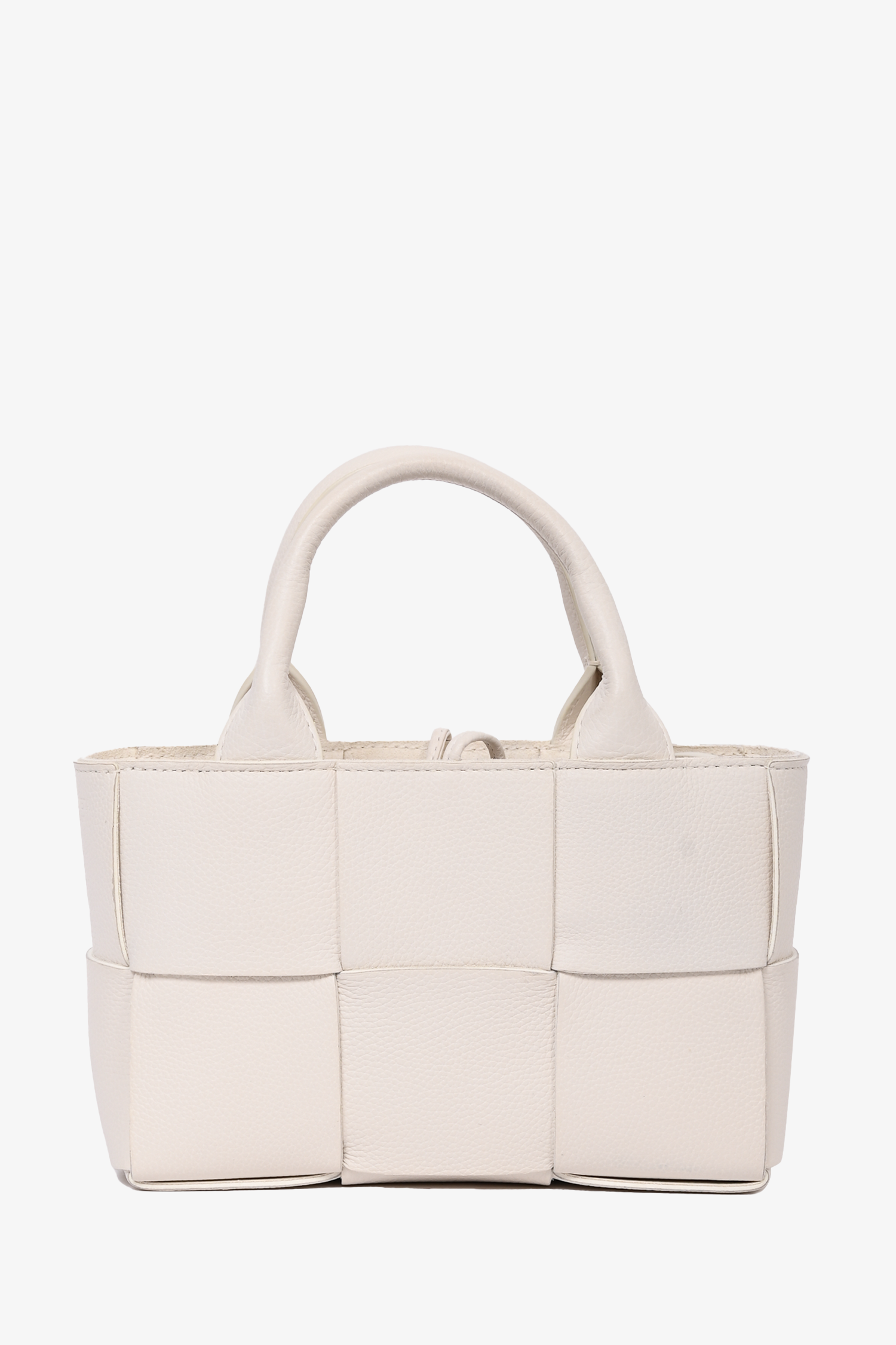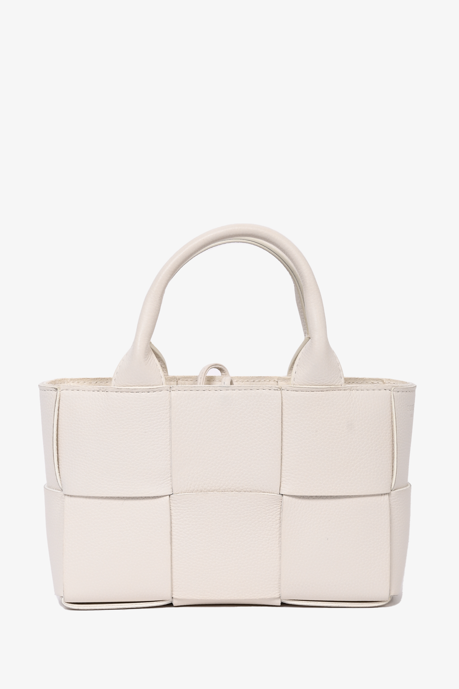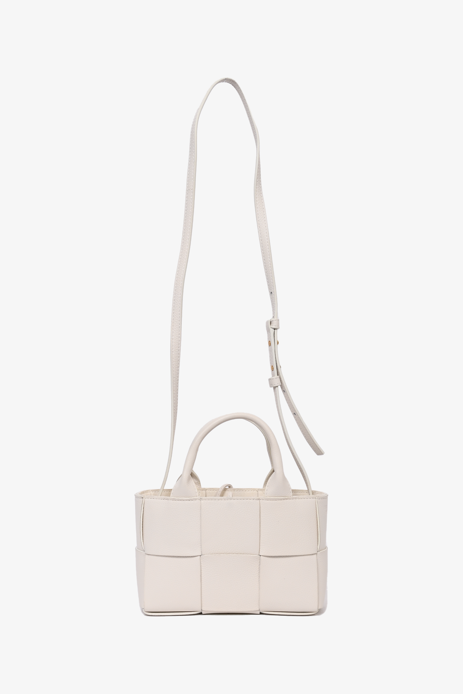 Refresh availabilityBottega Veneta White Leather Mini Arco Tote with Strap. Dual rolled handles. Top tie-up closure. Open interior. Detachable interior zip pouch. Adjustable strap. Gold-tone hardware. Tonal stitching.