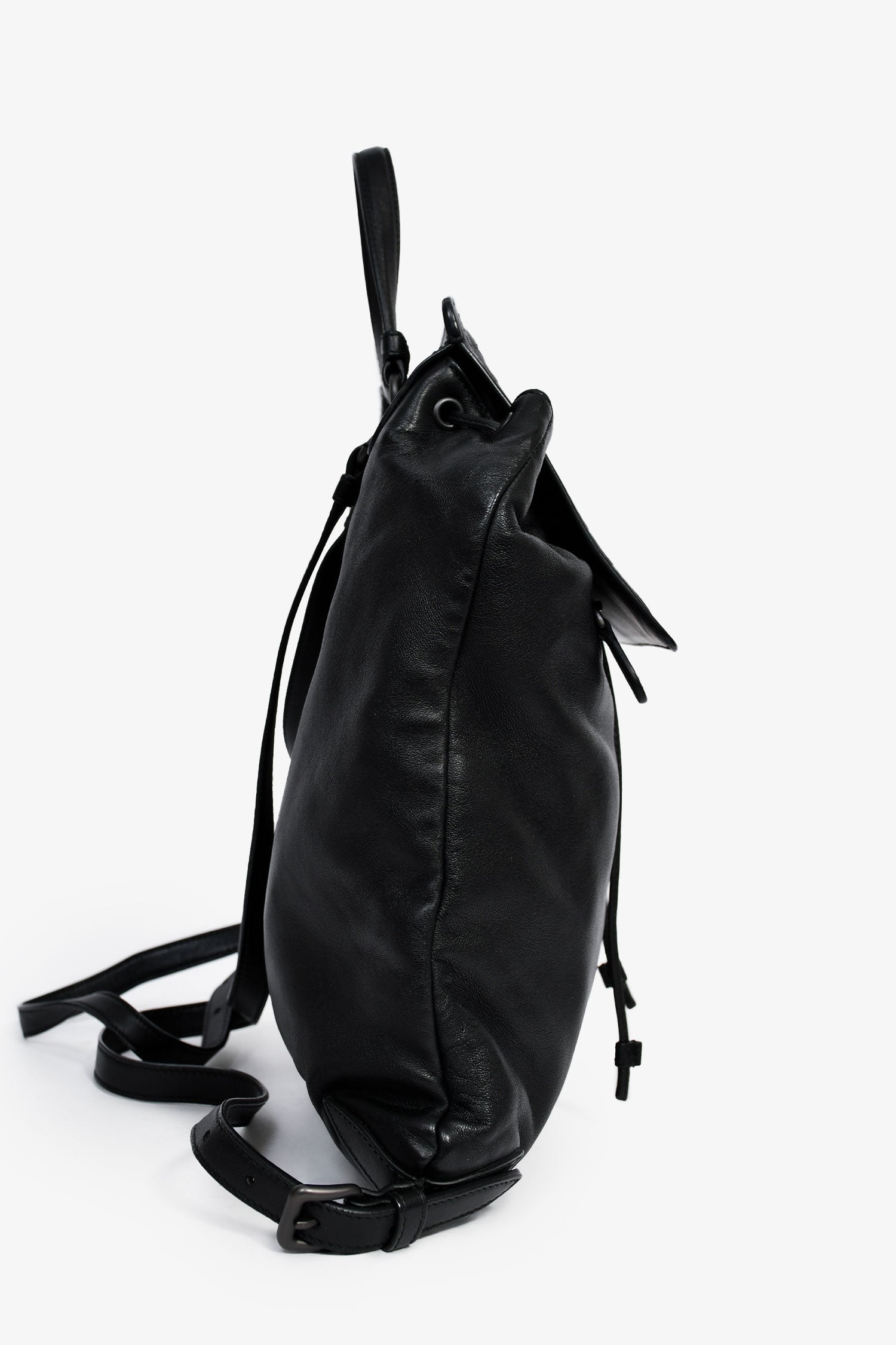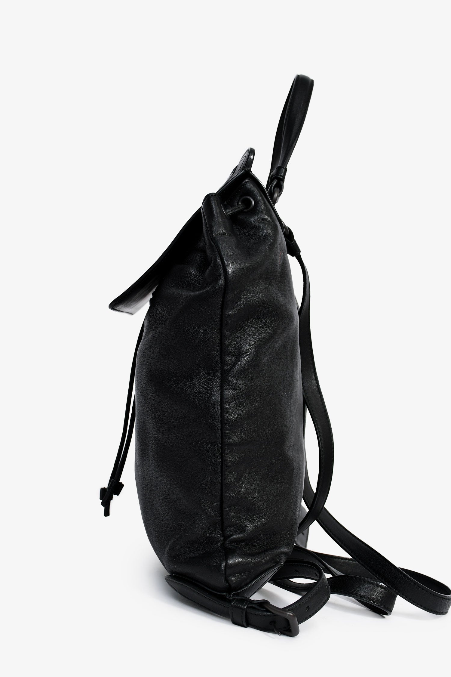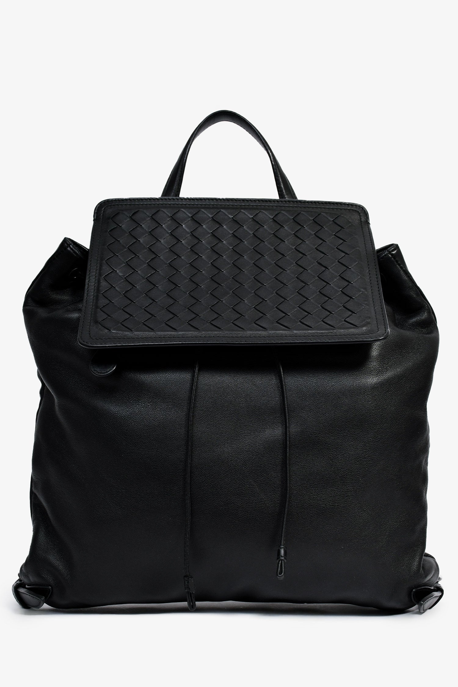 Refresh availabilityBottega Veneta Black Leather Intrecciato Backpack. Front fold-over flap with magnetic button closure. Front exterior zip pocket. Brown suede interior lining. Single interior wall slip pocket. Adjustable shoulder straps. Grey-tone hardware.