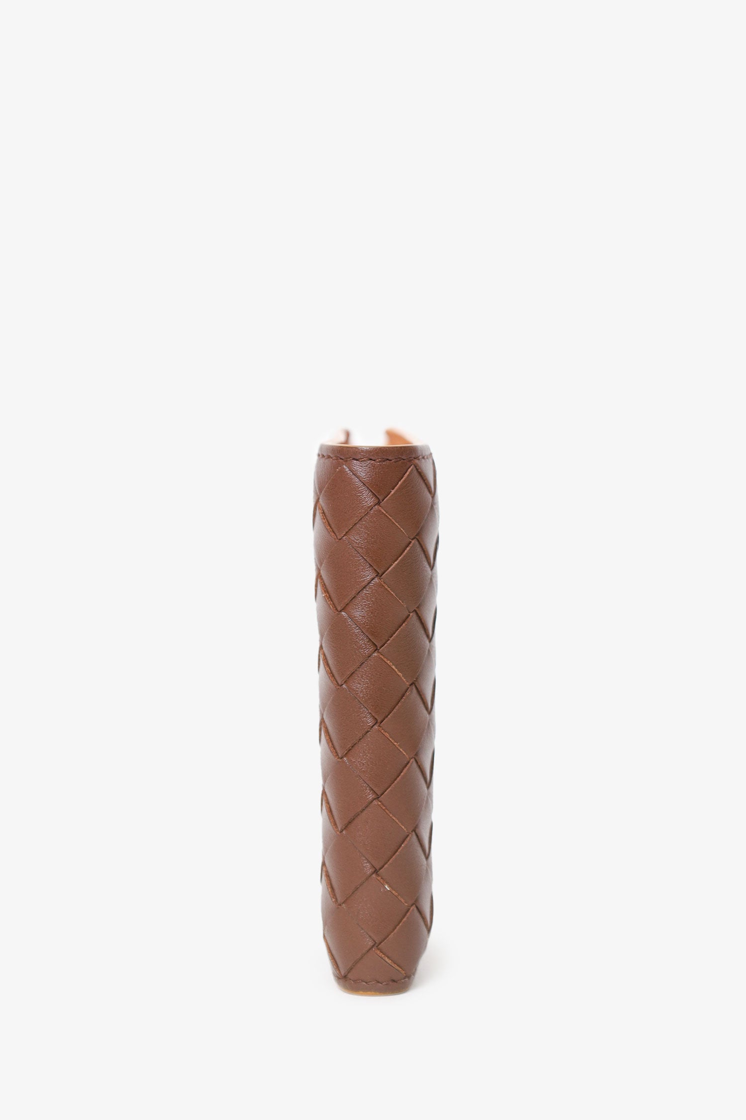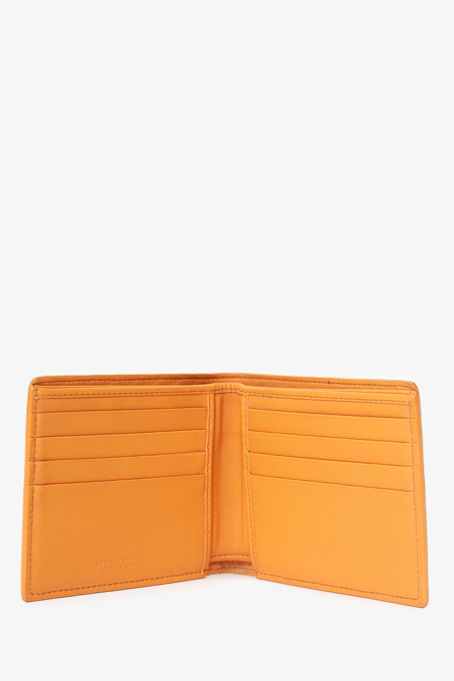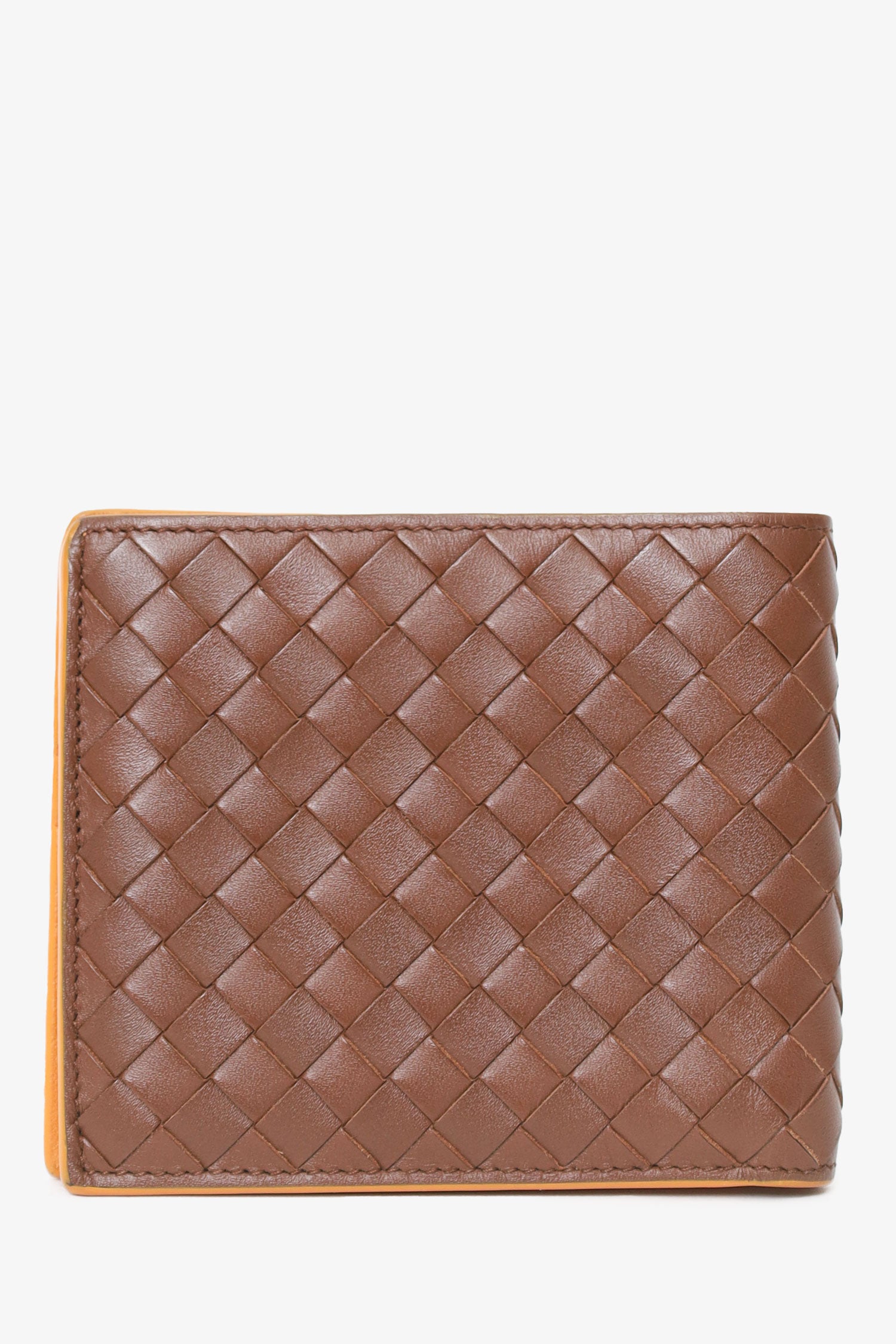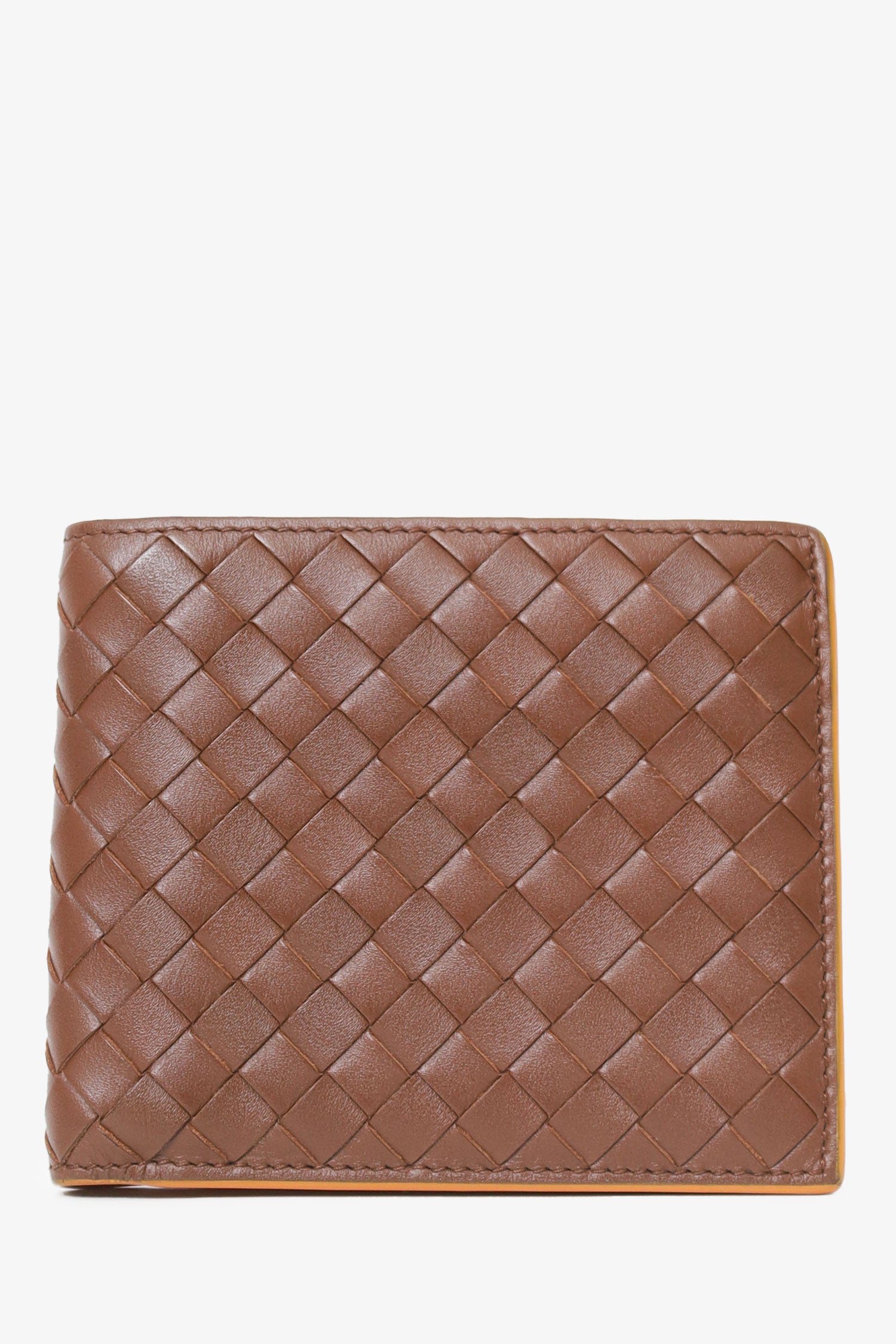 Refresh availabilityBottega Venneta Brown Interaciato Leather Bifold Wallet. Leather lined interior. 3 main interior compartments; front with 8 card slots and 2 side slip pockets, middle bill slot, and rear bill slot. Total stitching.