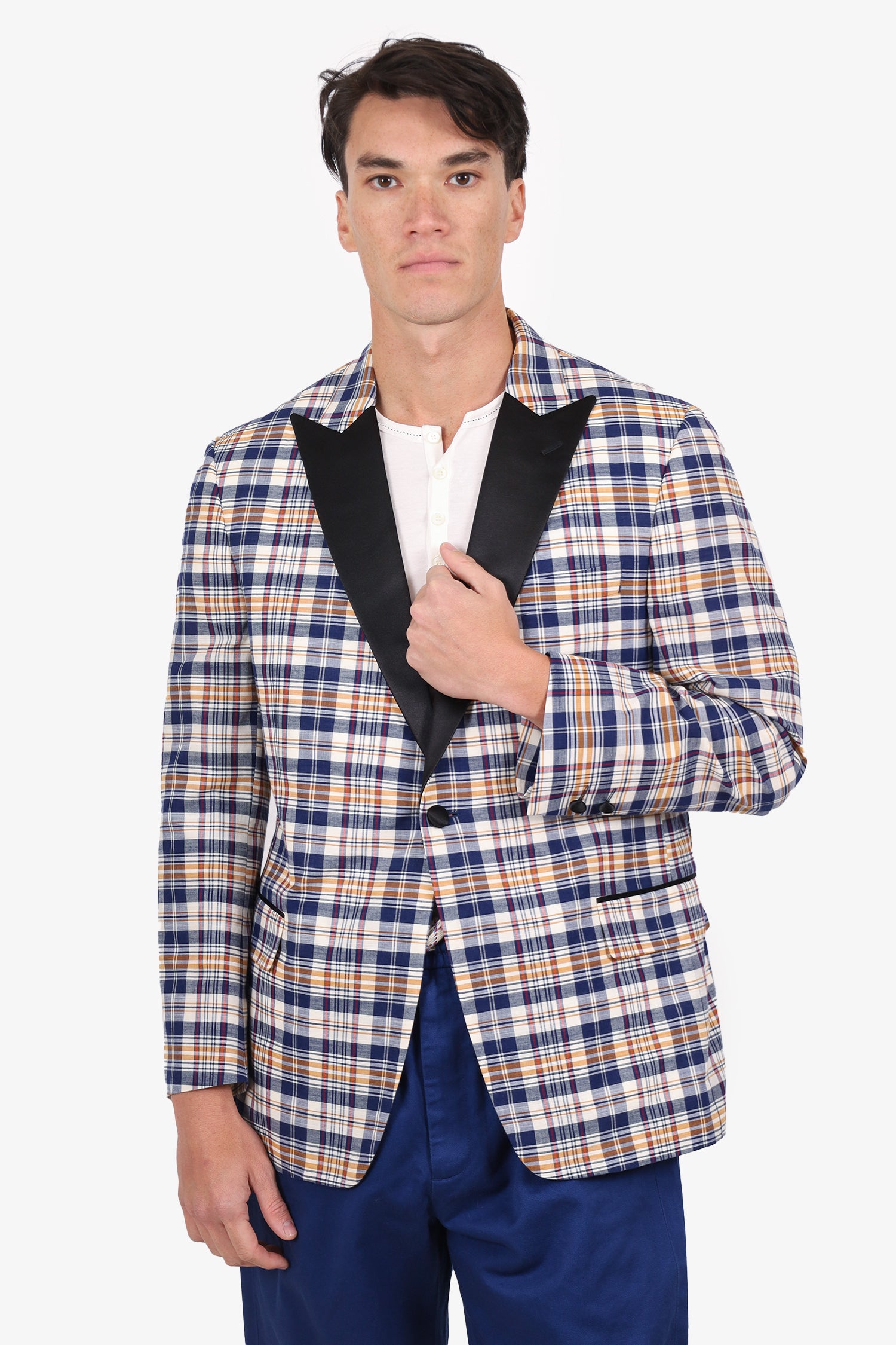 Refresh availabilityBrooks Brothers White/Blue/Yellow Plaid Tuxedo Blazer Jacket. Pull-on. Peak lapel. Front button-up closure. Sleeve cuffs with button-up closure. 3 front exterior pockets; 1 slip and 2 flaps. Double rear vents. Partially-lined. 2 interior slip pockets. Tonal stitching.