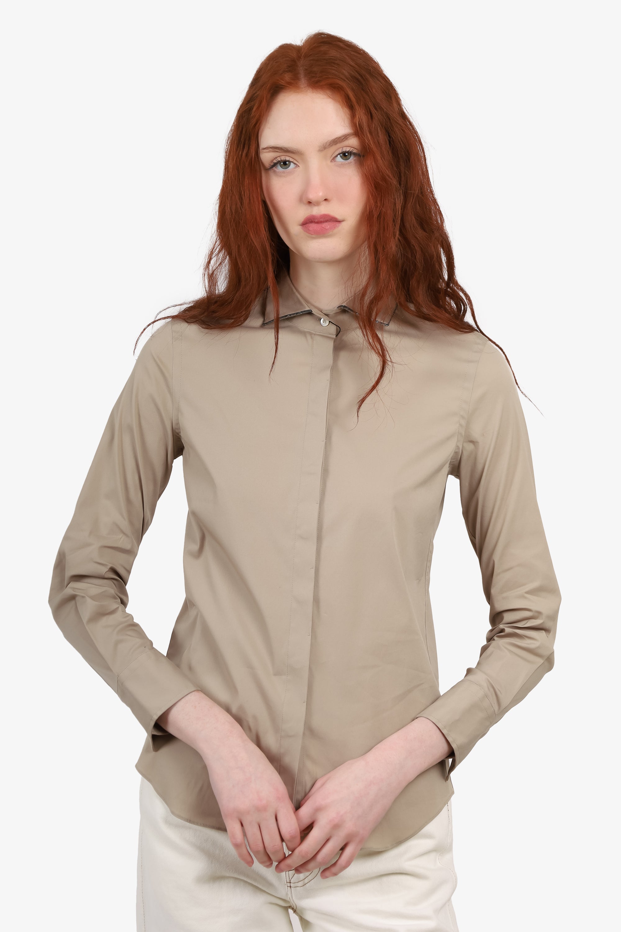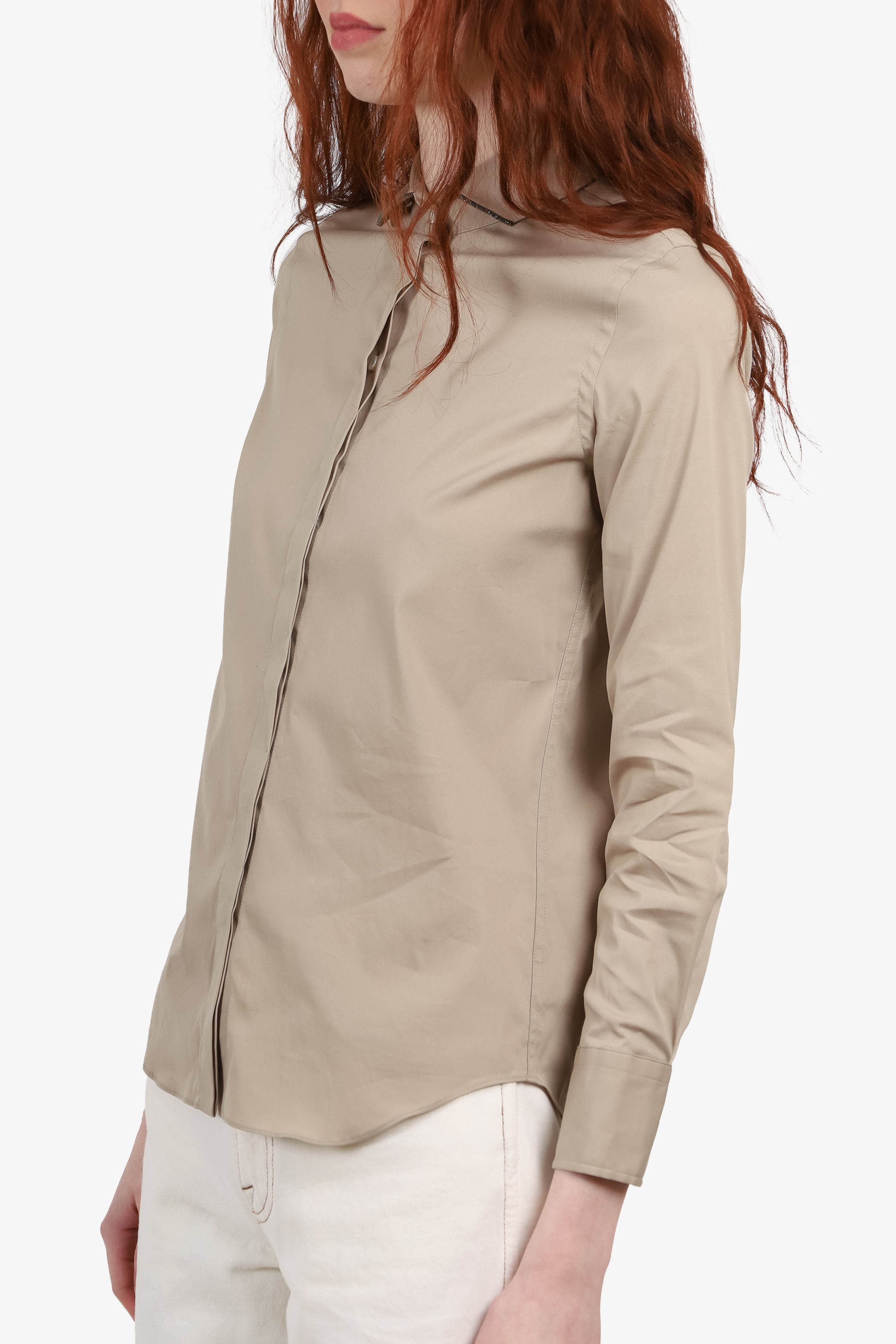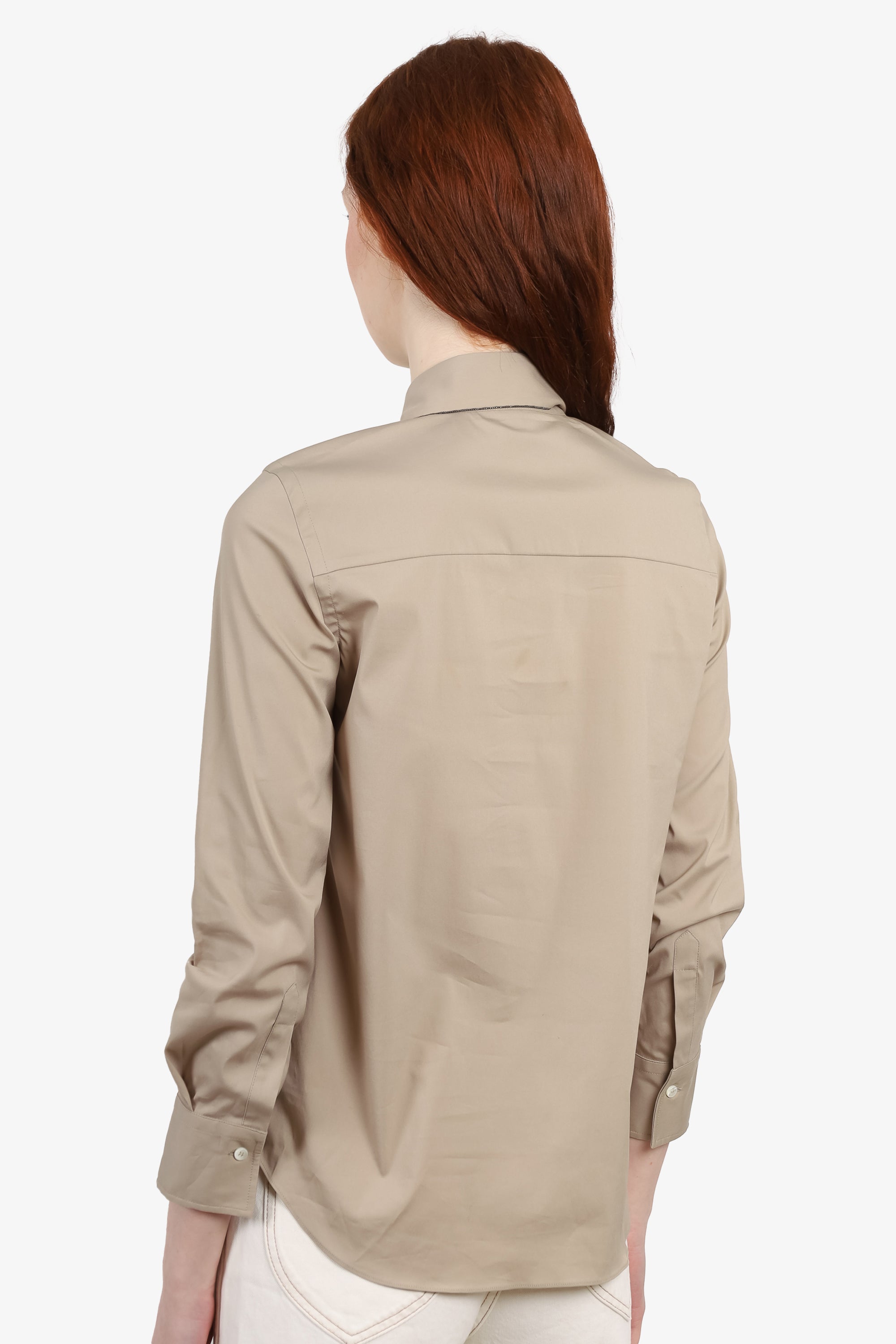 Brunello Cucinelli Beige Beaded Collar Button Down Shirt Size XS