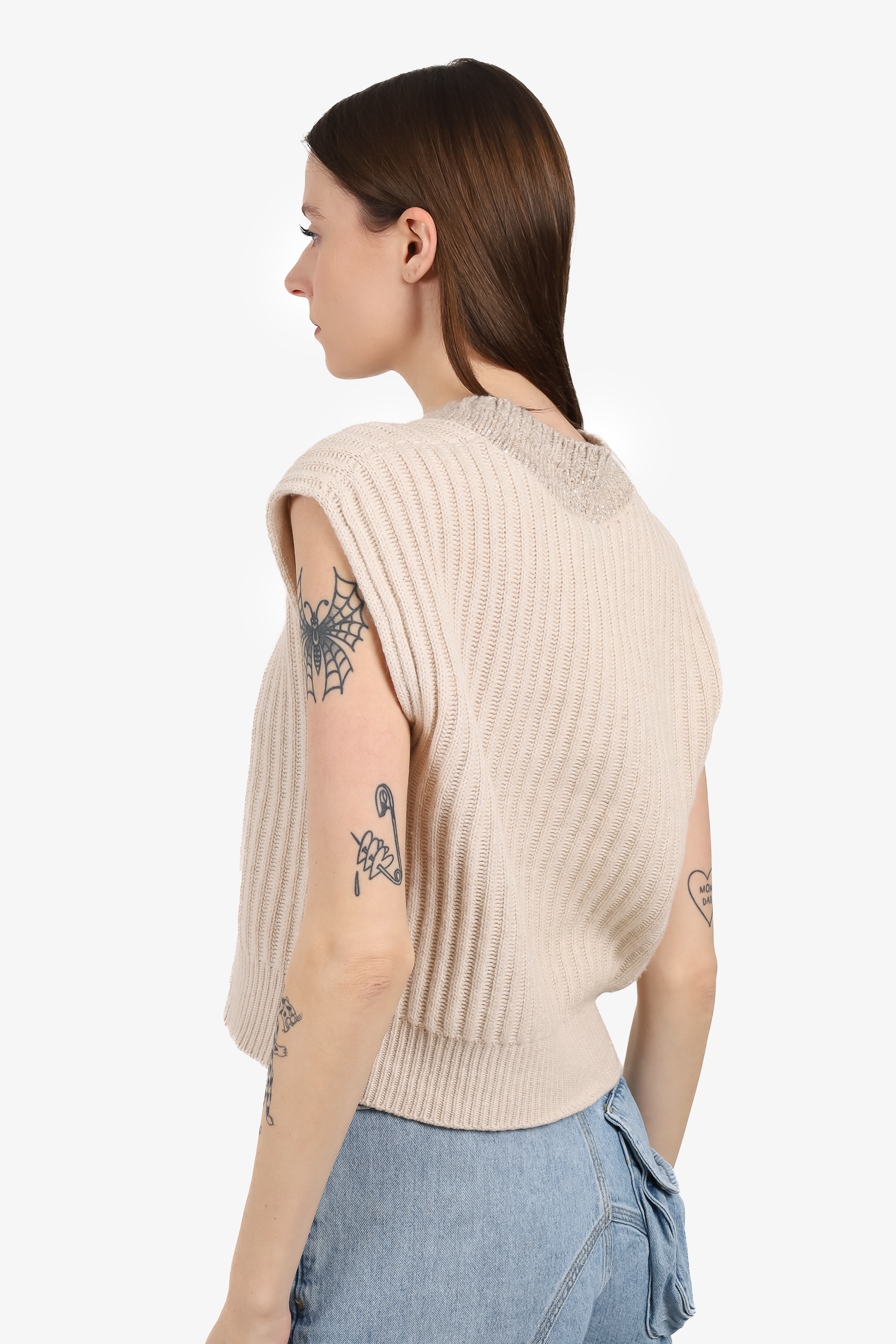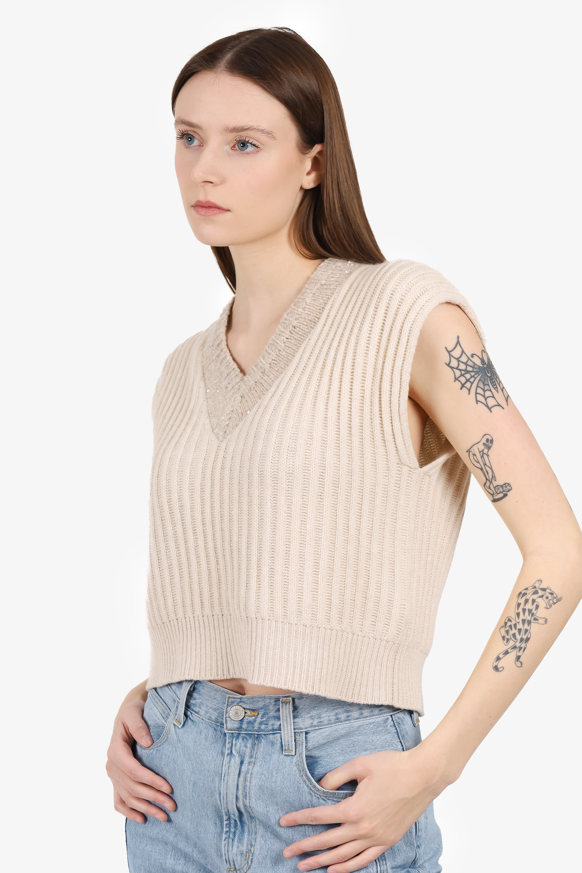 Refresh availabilityBrunello Cucinelli Beige Cashmere Sequin Neckline Sweater Vest. Pull-on. V-neckline. Tonal stitching.