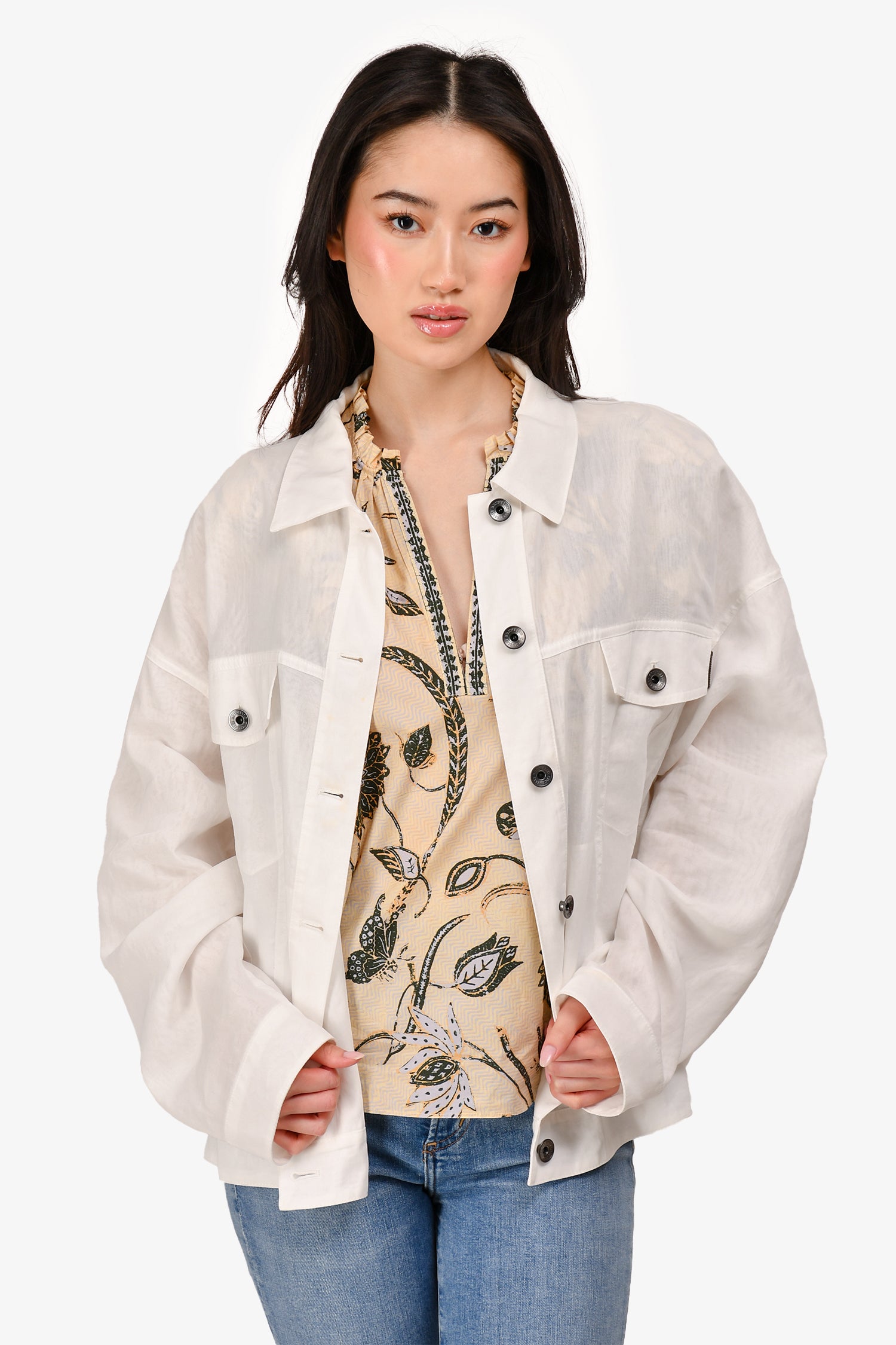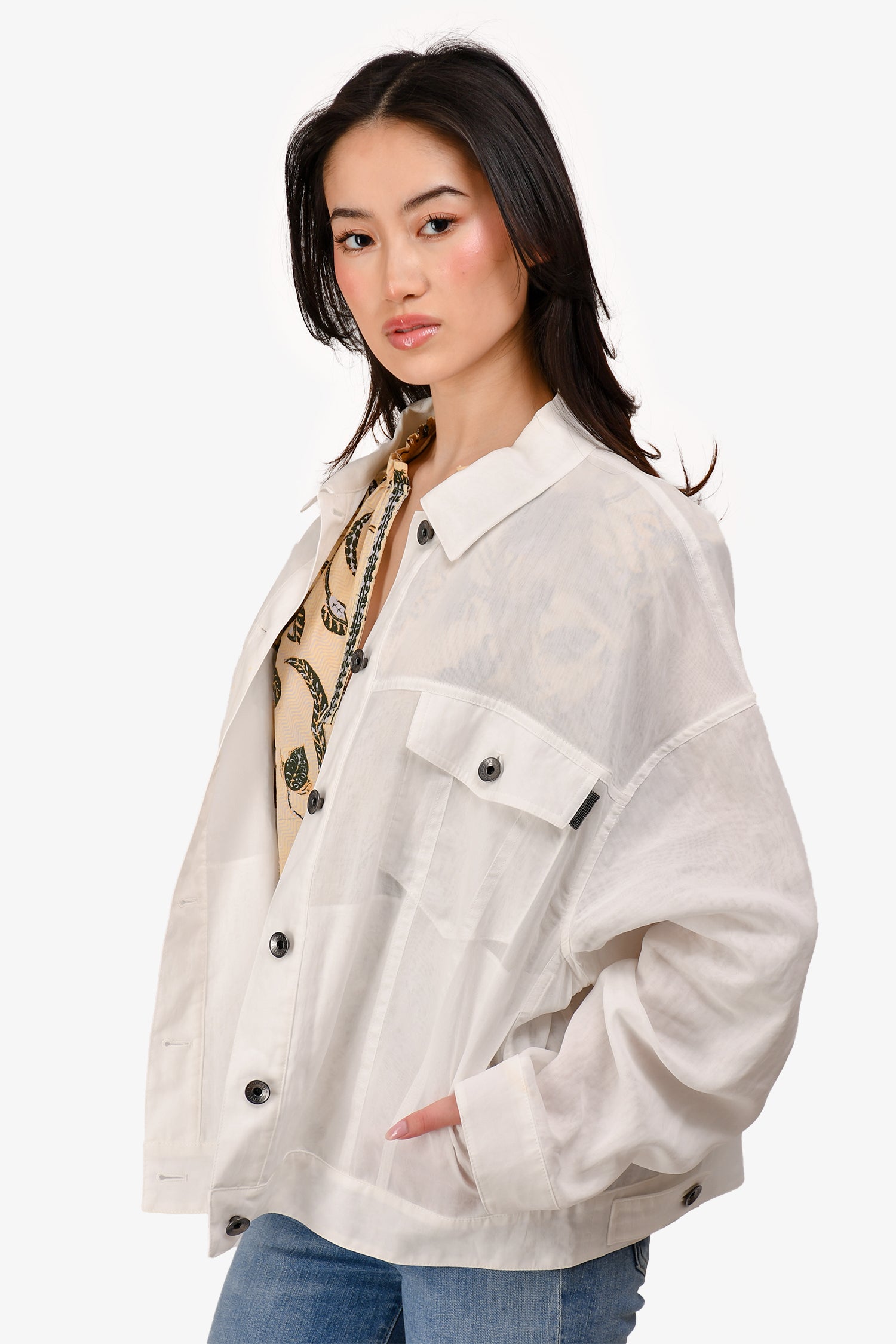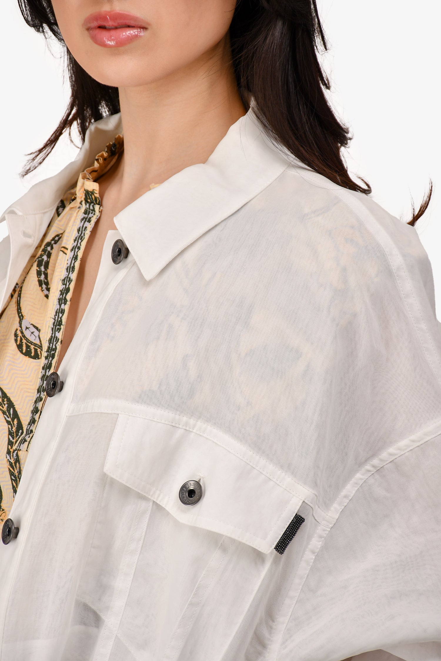 Refresh availabilityBrunello Cucinelli Beige Organza Beaded Jacket. Front button-up closure. Grey-tonal hardware. Four front pockets; Two with button closure. Cuffed at the sleeves. Tonal stitching.