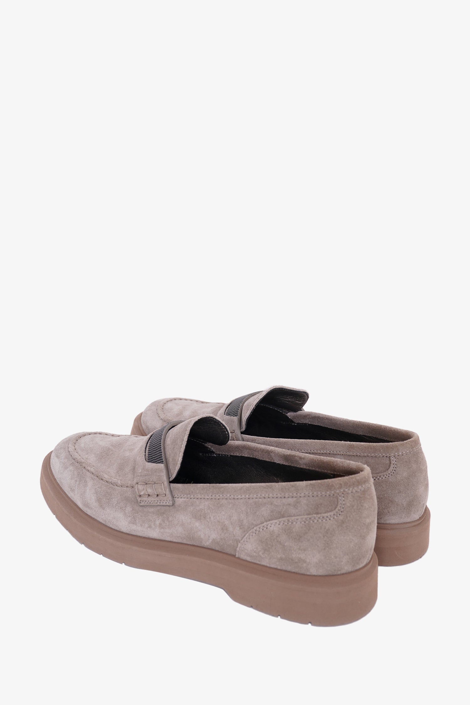 Brunello Cucinelli Beige Suede Beaded Loafer. Square toe. Tonal stitching.
