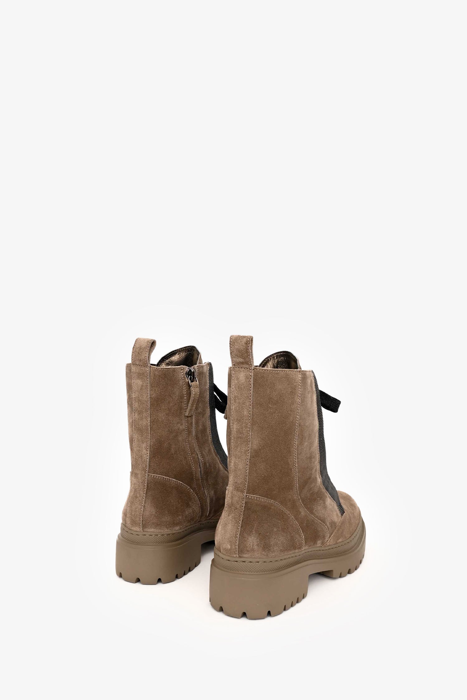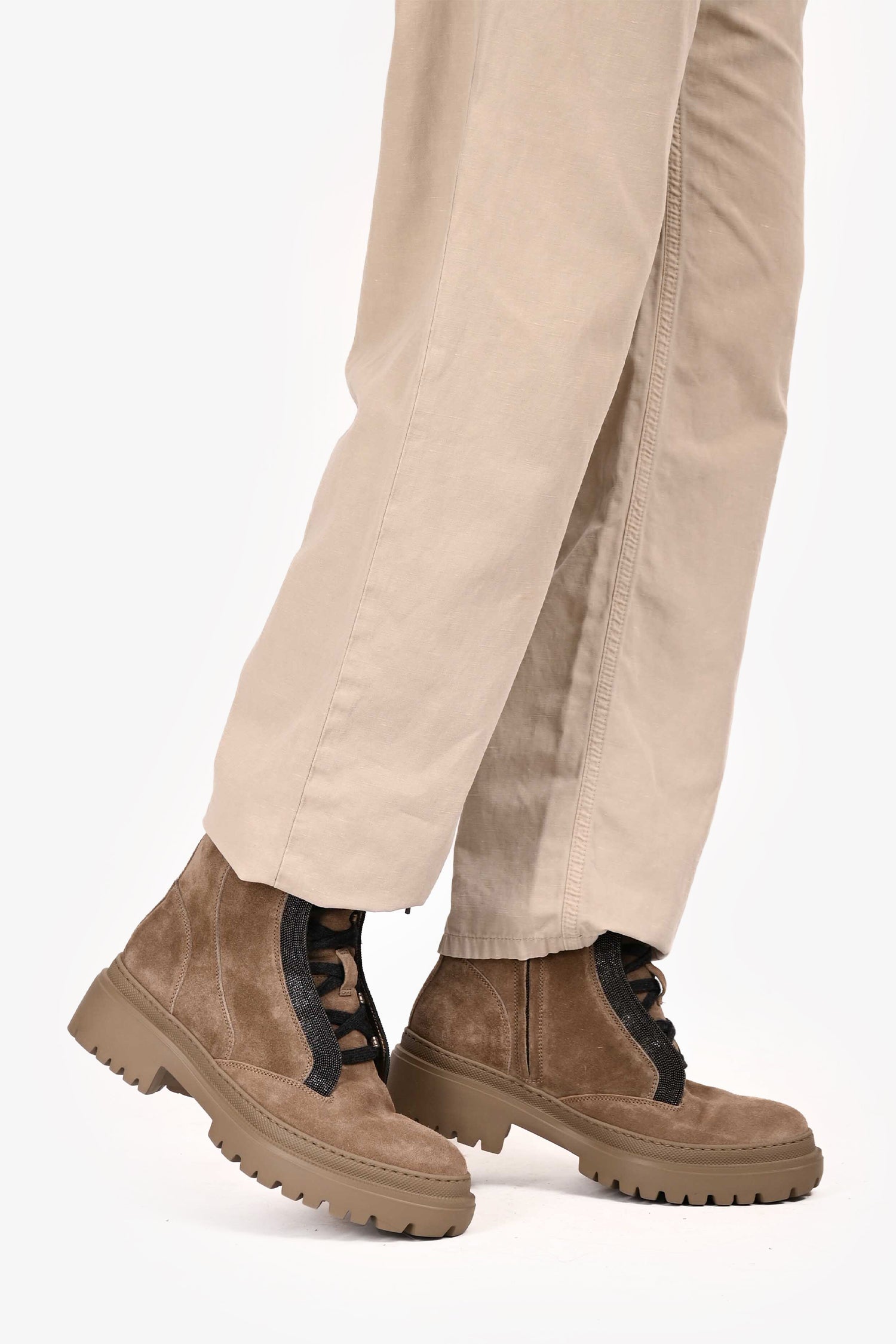 Refresh availabilityBrunello Cucinelli Beige Suede Leather Bead-Embellished Lace-Up Combat Boots. Lace-up. Side zip closure. Round toe. Leather lining and insole. Silver-tone hardware. Tonal stitching.