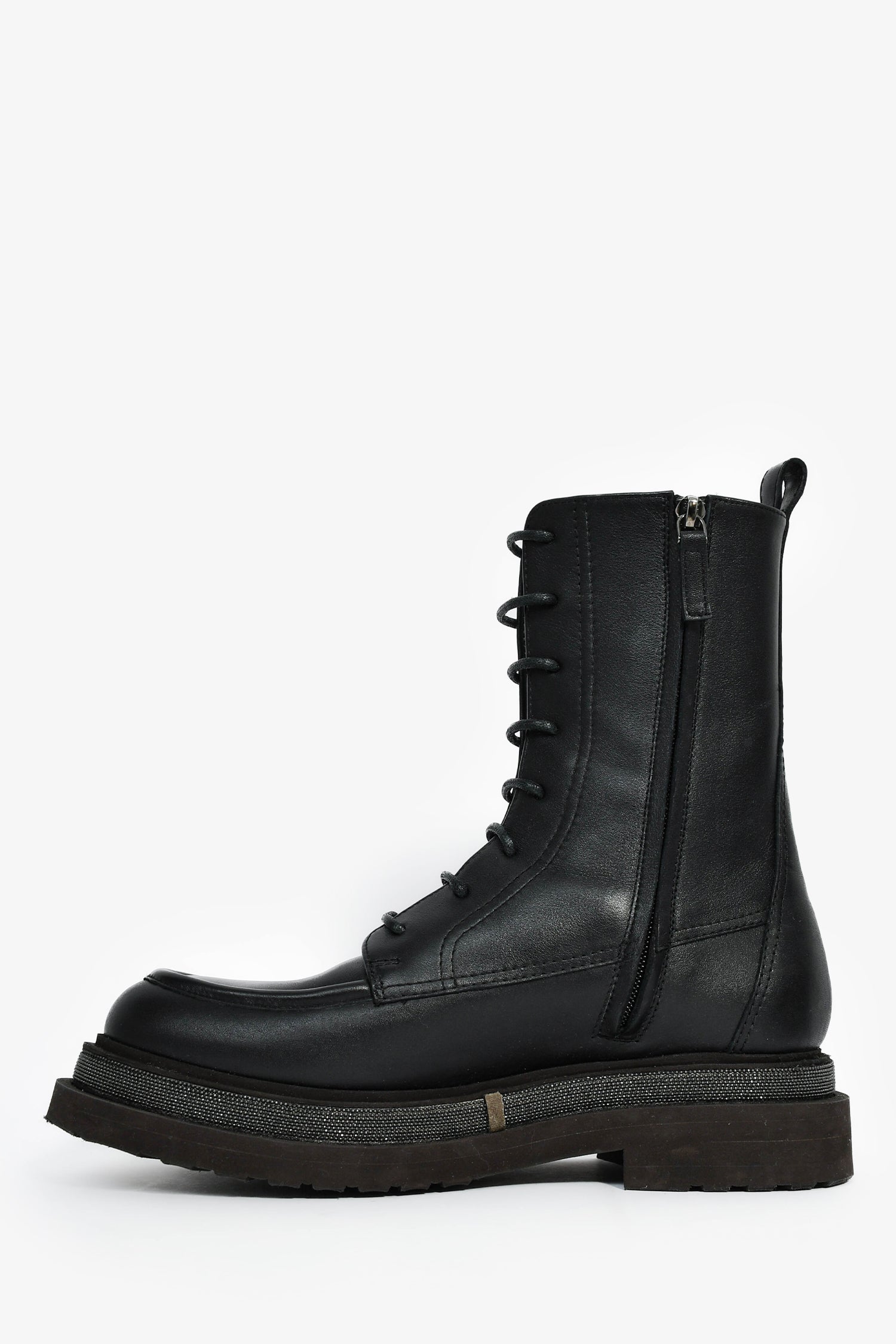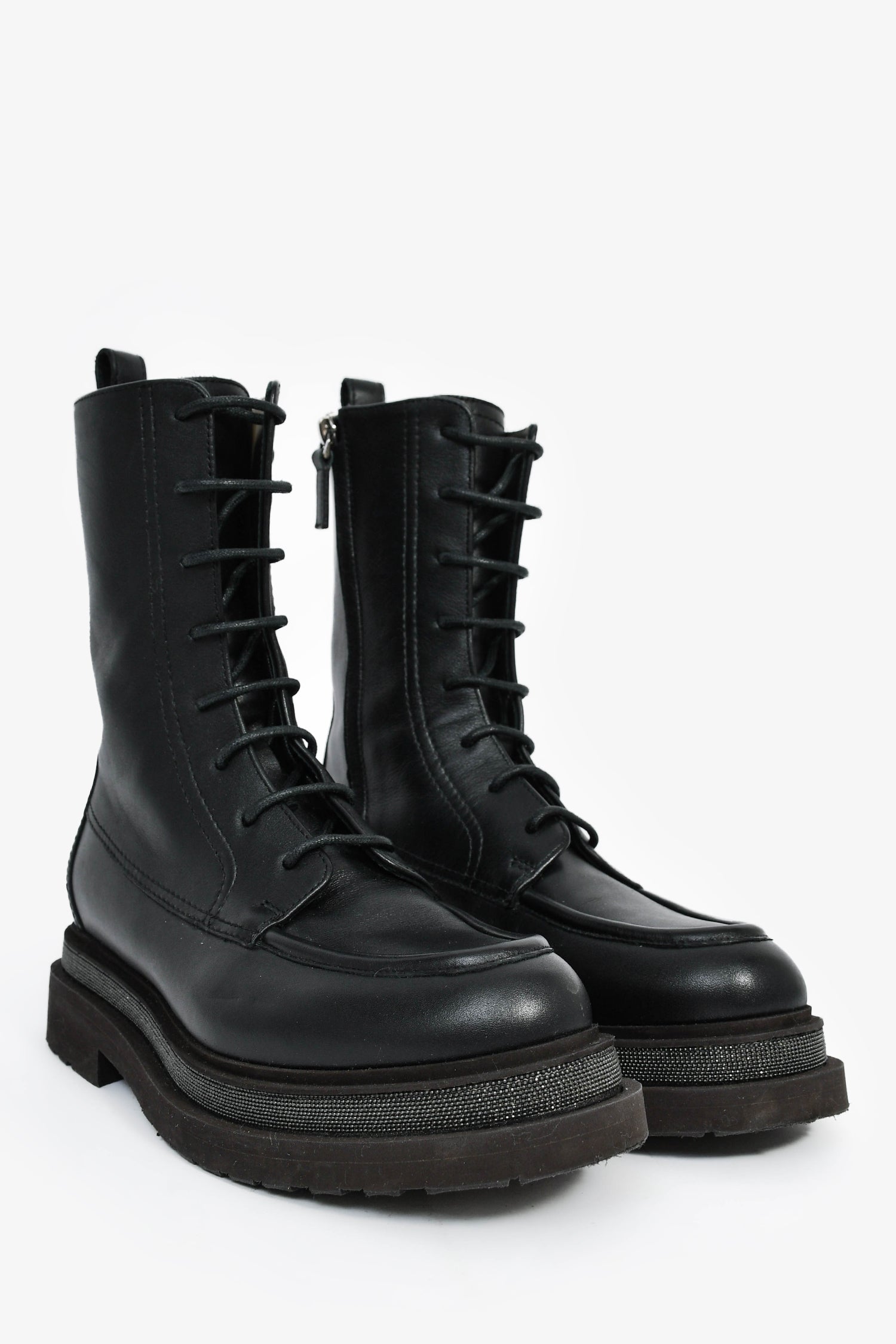 Refresh availabilityBrunello Cucinelli Black Leather Bead Trimmed Combat Boots. Round toe. Lace-up front. Bead-trimmed detailing around ankle. Chunky rubber sole. Tonal stitching.
