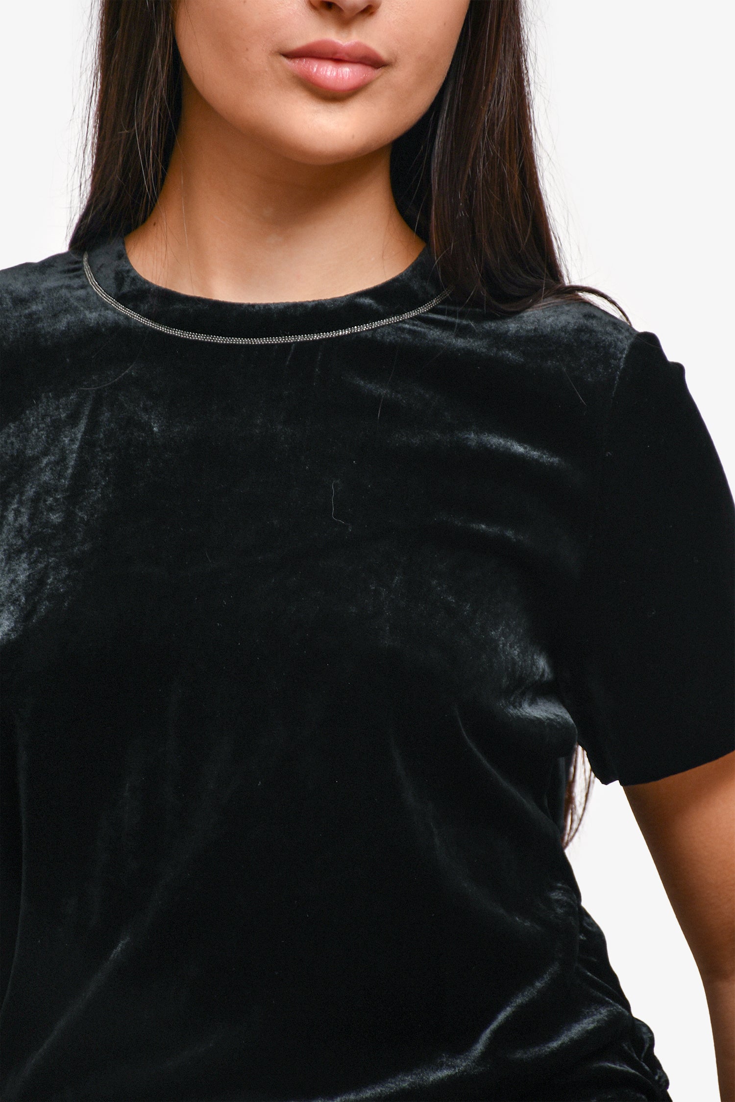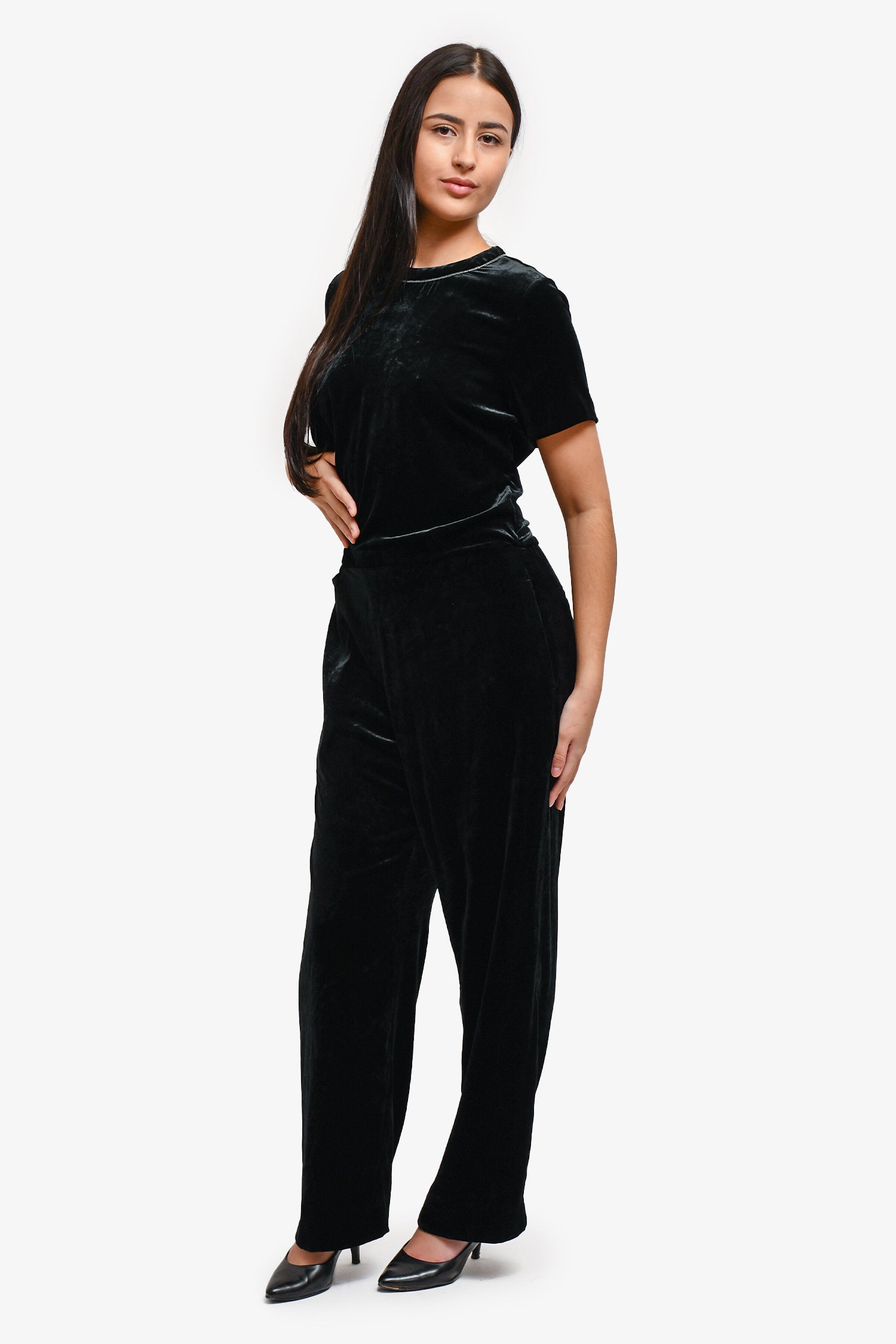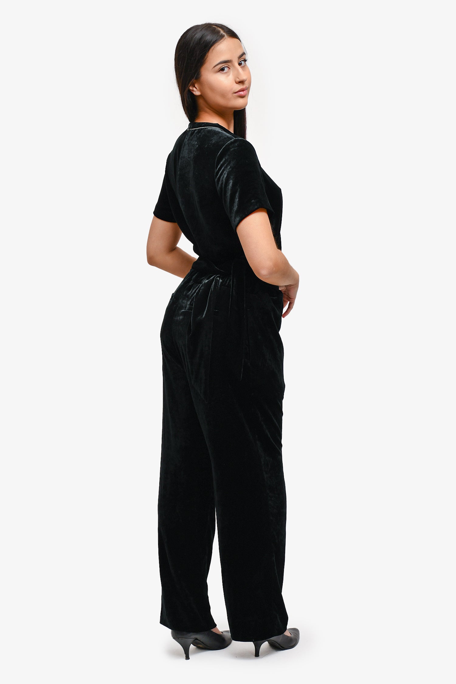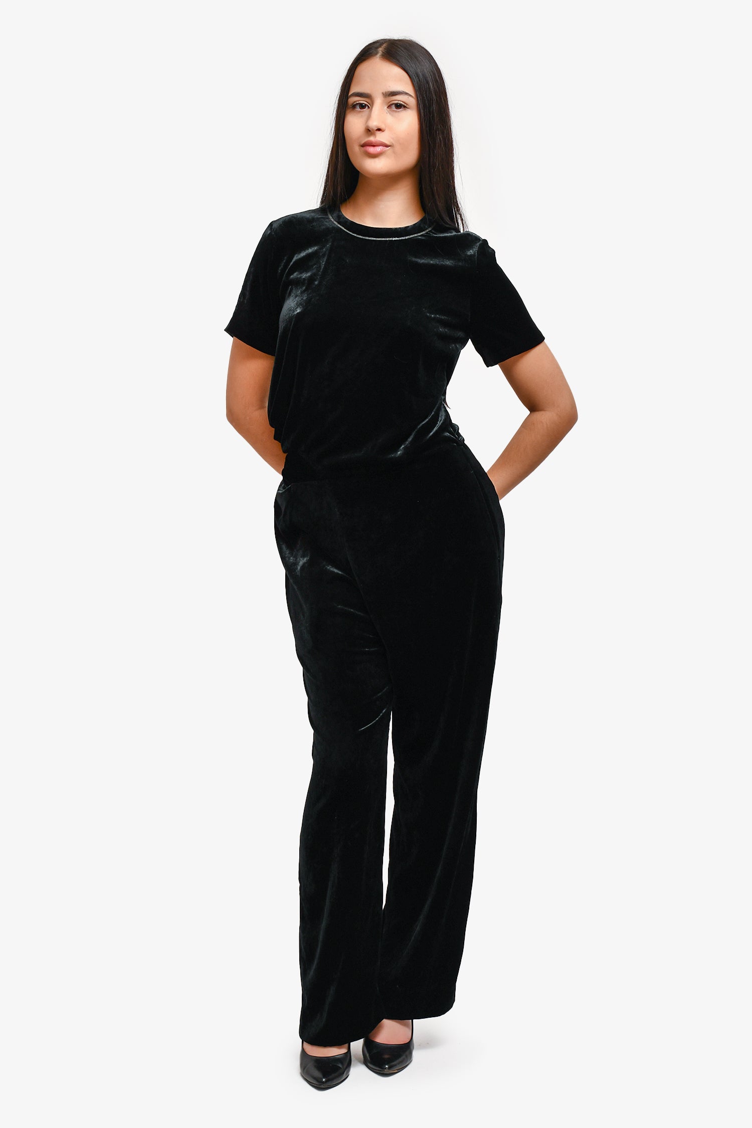 Refresh availabilityBrunello Cucinelli Black Velvet Beaded Jumpsuit. Back zipper closure. Beading around the neckline. Waist belt tie. Two front pockets. Wide leg. Tonal stitching.