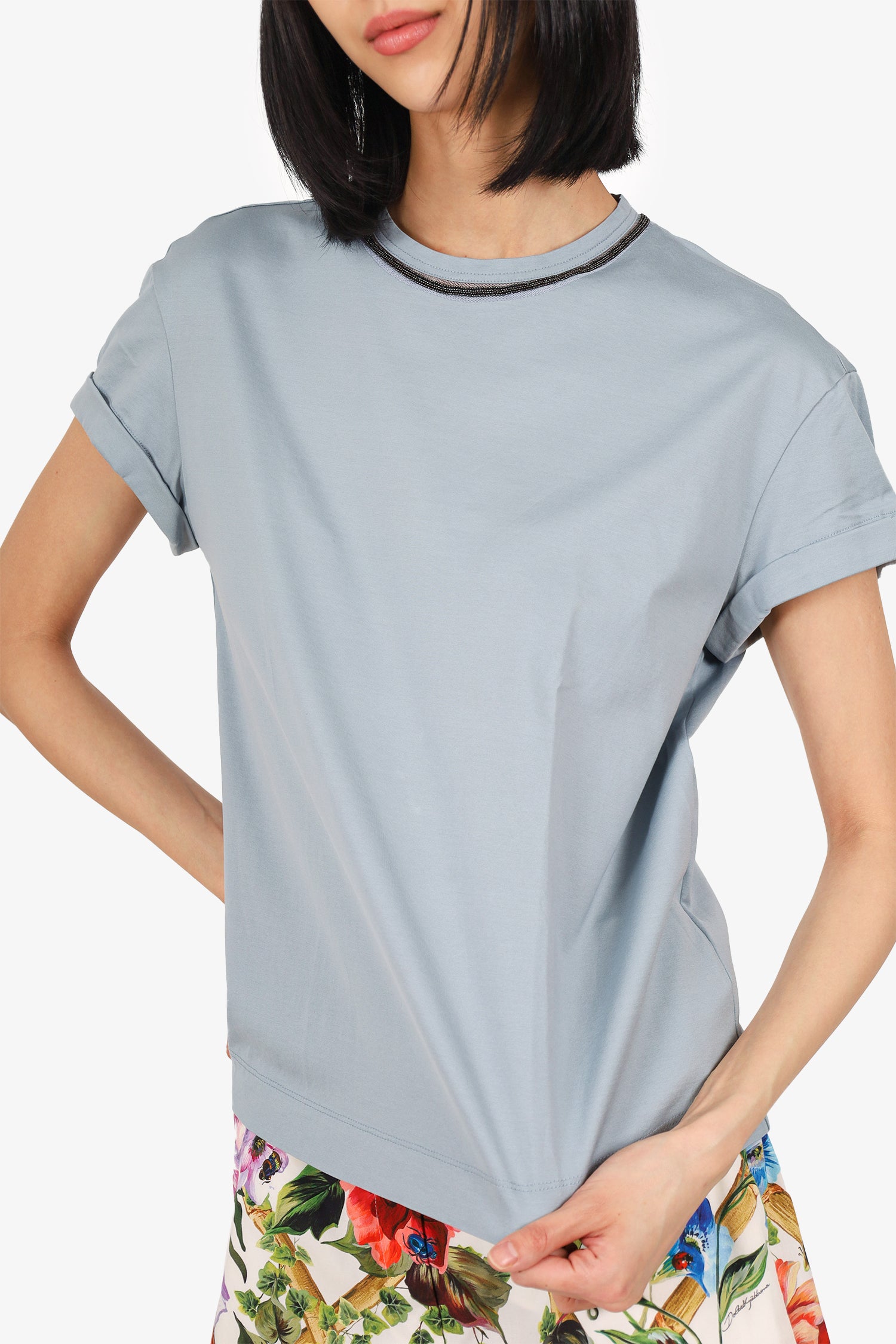 Refresh availabilityBrunello Cucinelli Blue Beaded Detail Top. Pull-on. Round neckline. Rear keyhole under neckline with button-up closure. Cuffed sleeves. Tonal stitching.