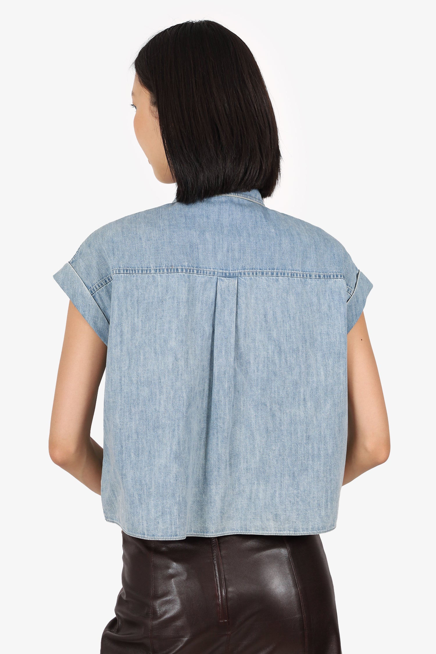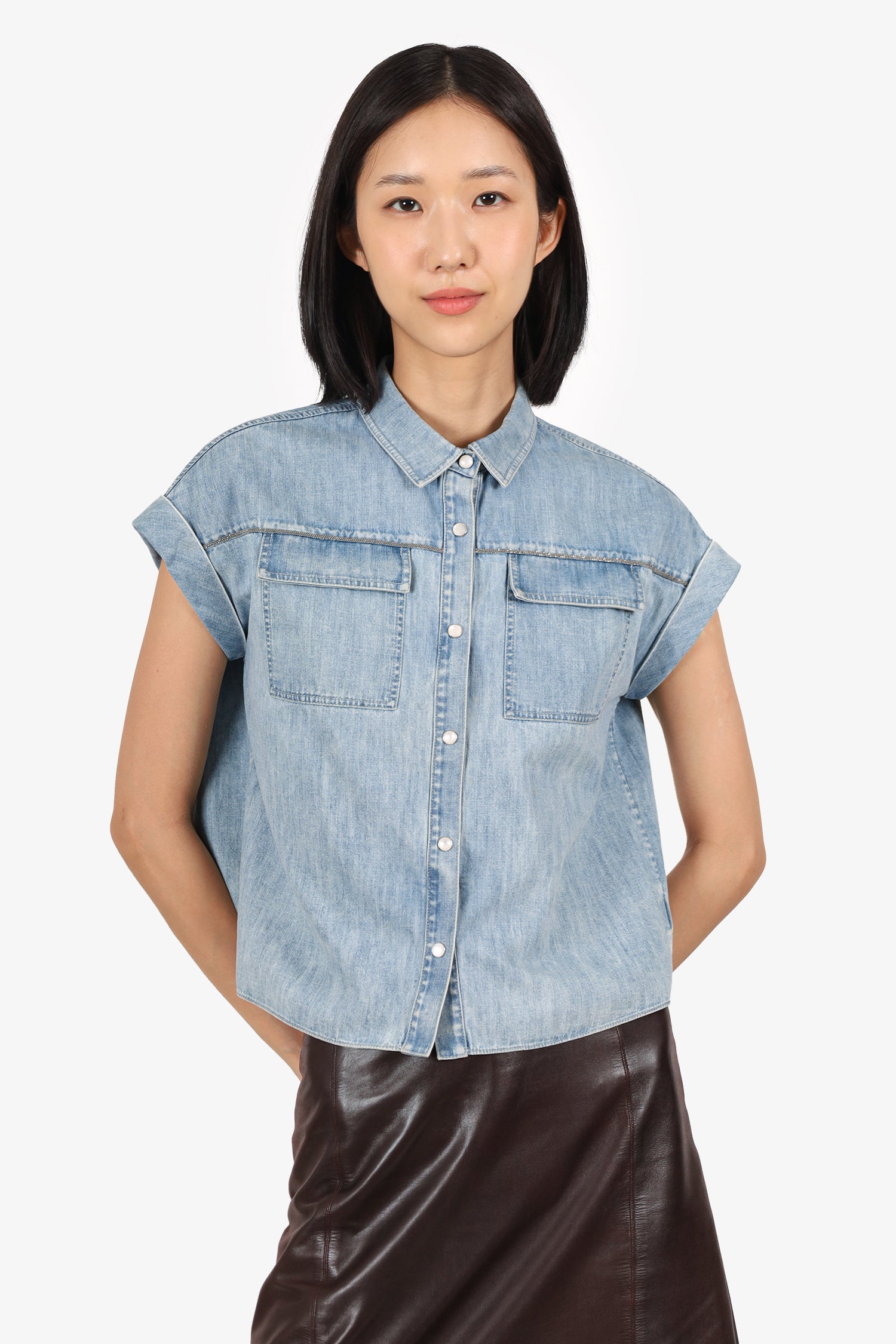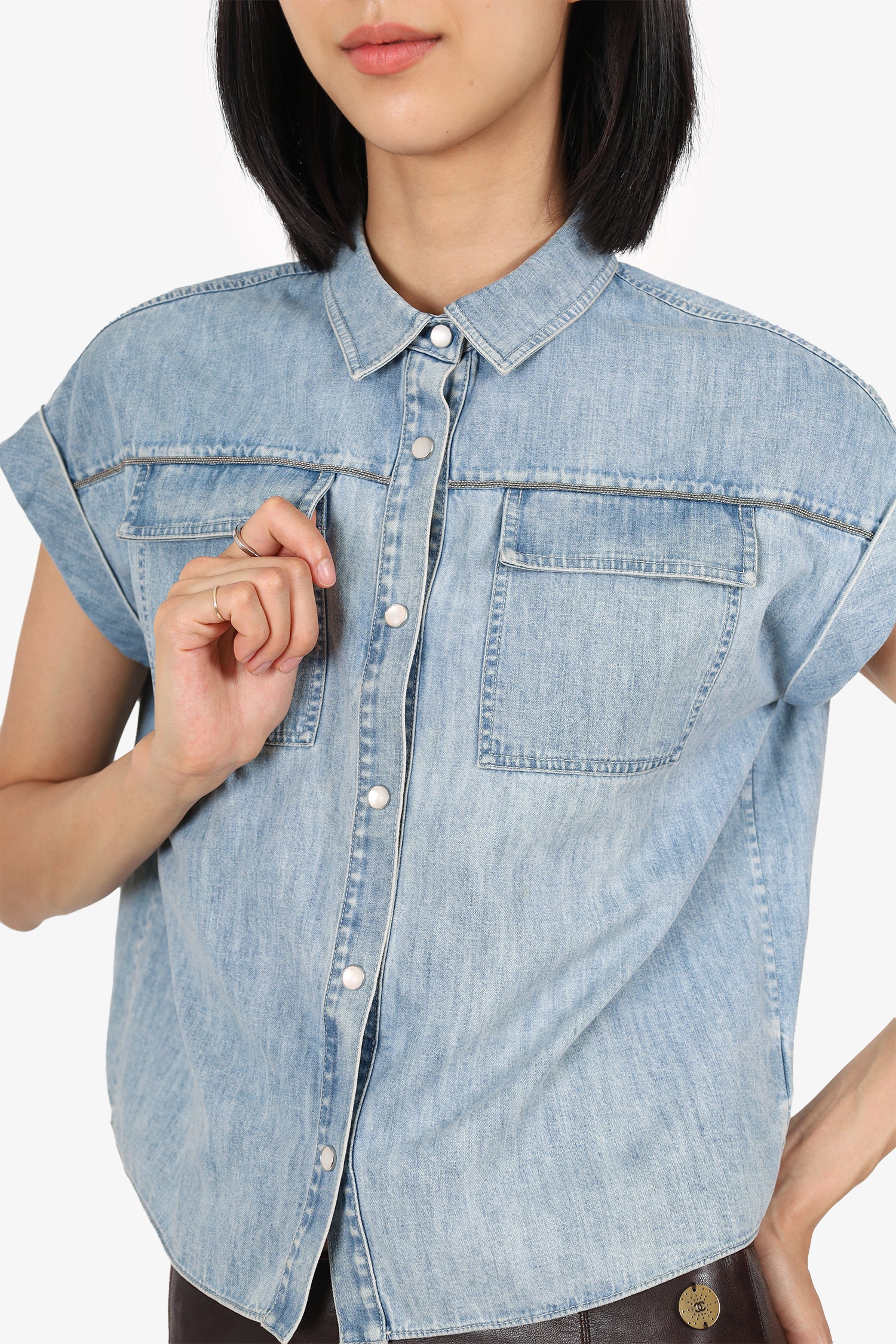 Refresh availabilityBrunello Cucinelli Blue Denim Sleeveless Bead Detail Top. Pull-on. Collared neckline. Front snap-button closure. 2 front exterior flap pockets. Silver-tone hardware. Tonal stitching.