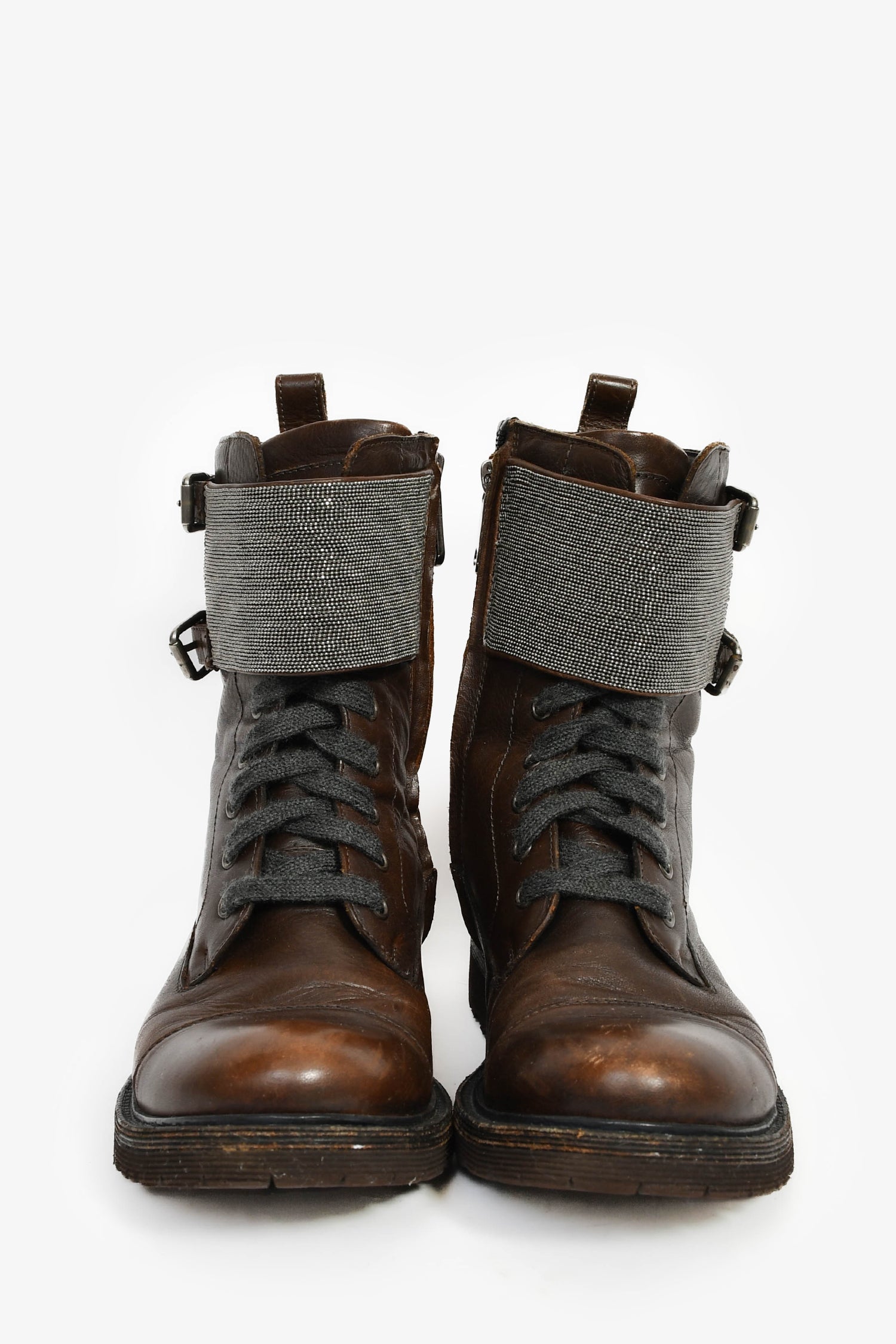 Refresh availabilityBrunello Cucinelli Brown Leather Beaded Ankle Boots. Slip-on. Round toe. Side zip closure. Front lace-up. Leather-lined interior. Rubber soles. Tonal stitching.
