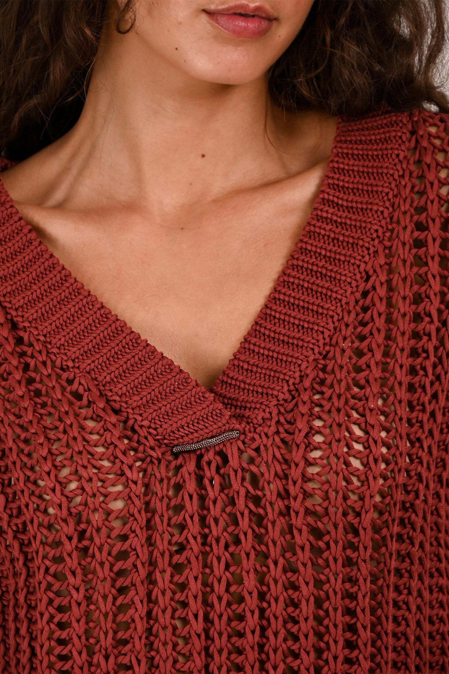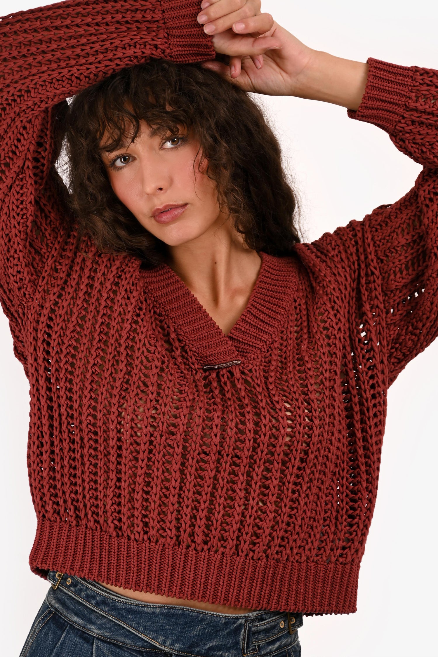 Refresh availabilityBrunello Cucinelli Burgundy Red V-Neck Sweater. Pull-on. Beaded trim detail on the bottom of v-neckline. Ribbed trimmings. Tonal stitching. Gold-tone hardware.