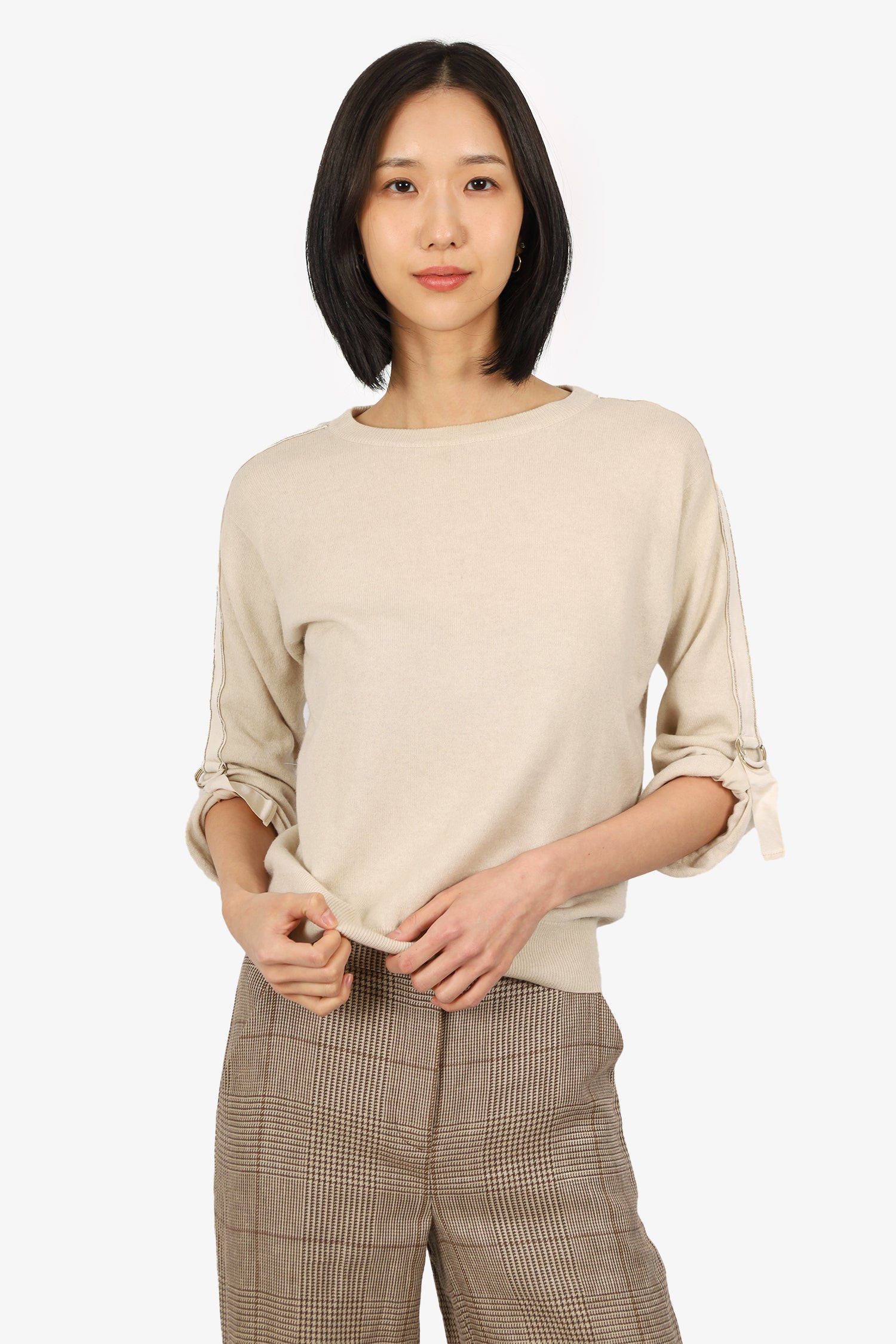 Brunello Cucinelli Cream Cashmere Beaded Sleeves Detail Sweater Size XX-Small