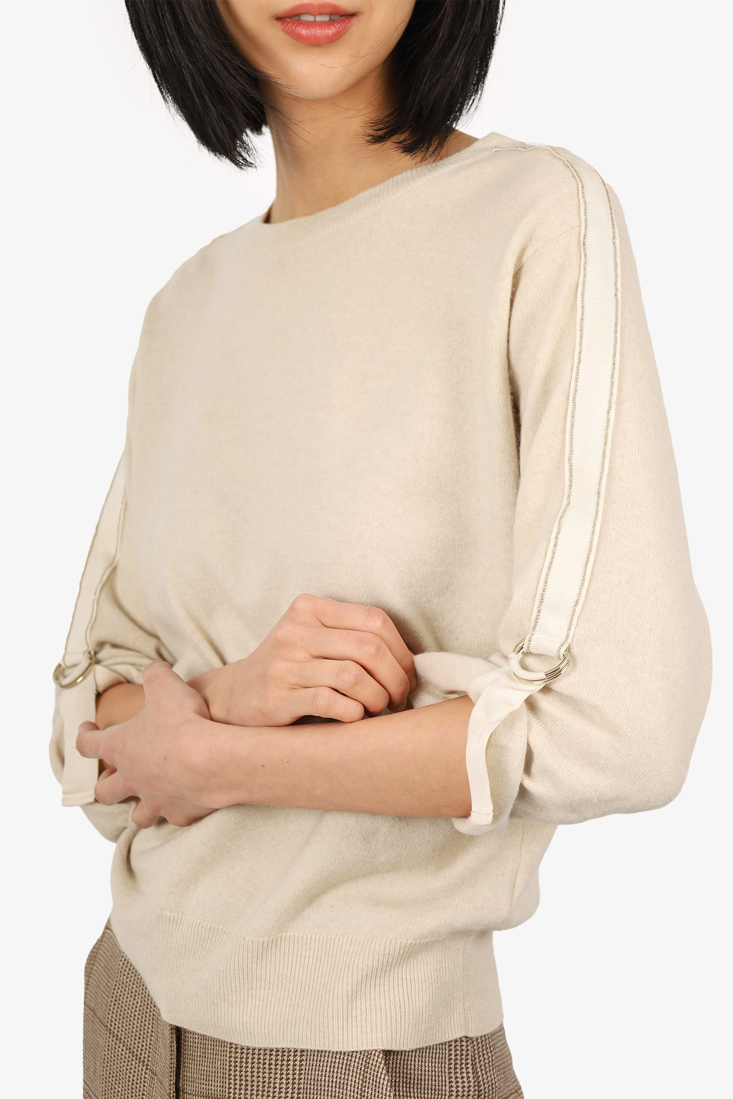 Refresh availabilityBrunello Cucinelli Cream Cashmere Beaded Sleeves Detail Sweater. Pull-on. Quarter length cinched sleeves. Round neckline. Tonal stitching.
