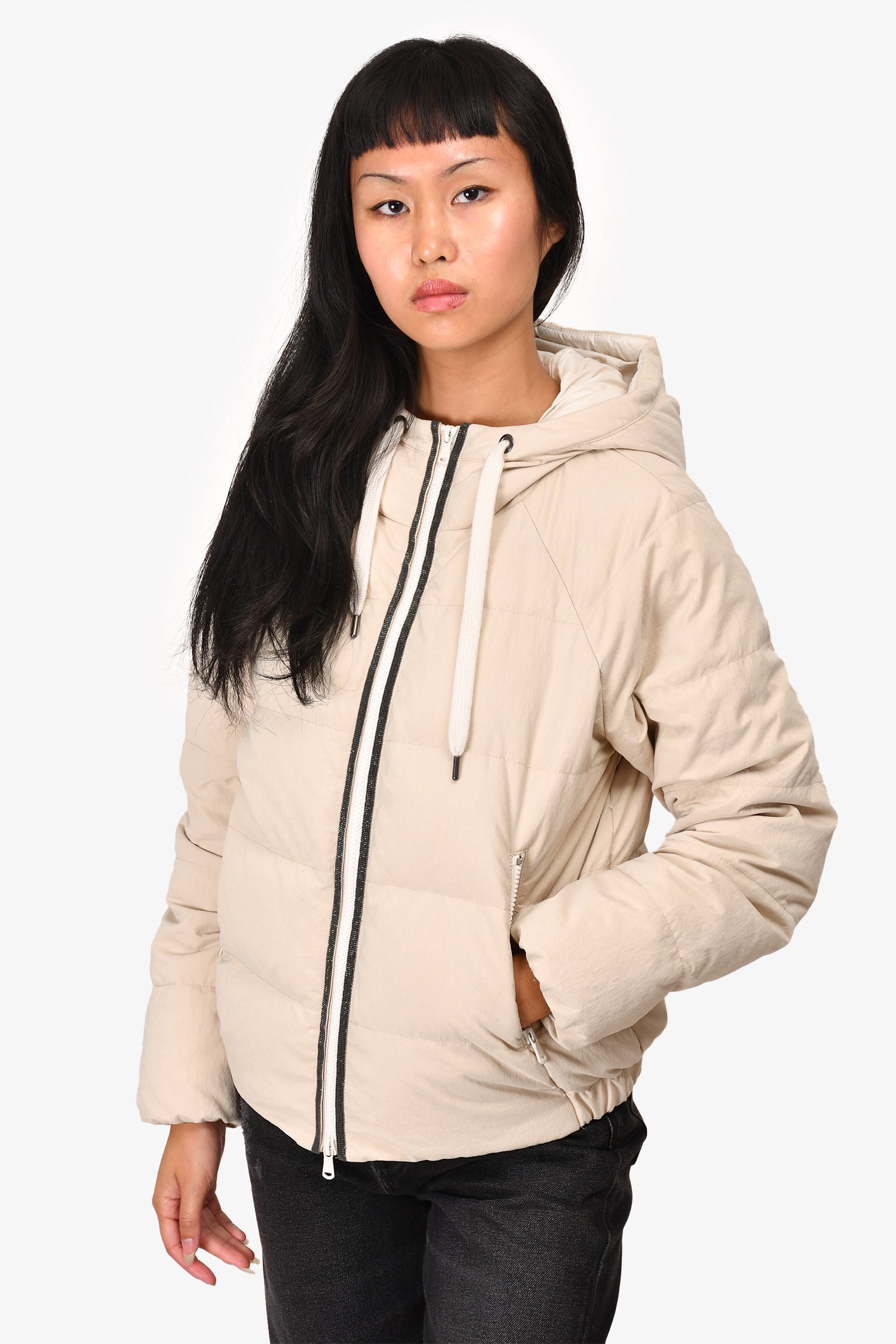 Refresh availabilityBrunello Cucinelli Cream Down Puffer Jacket with Beaded Detail Zip. Front two-way zip closure. Front zip pockets. Elasticized cuffs.