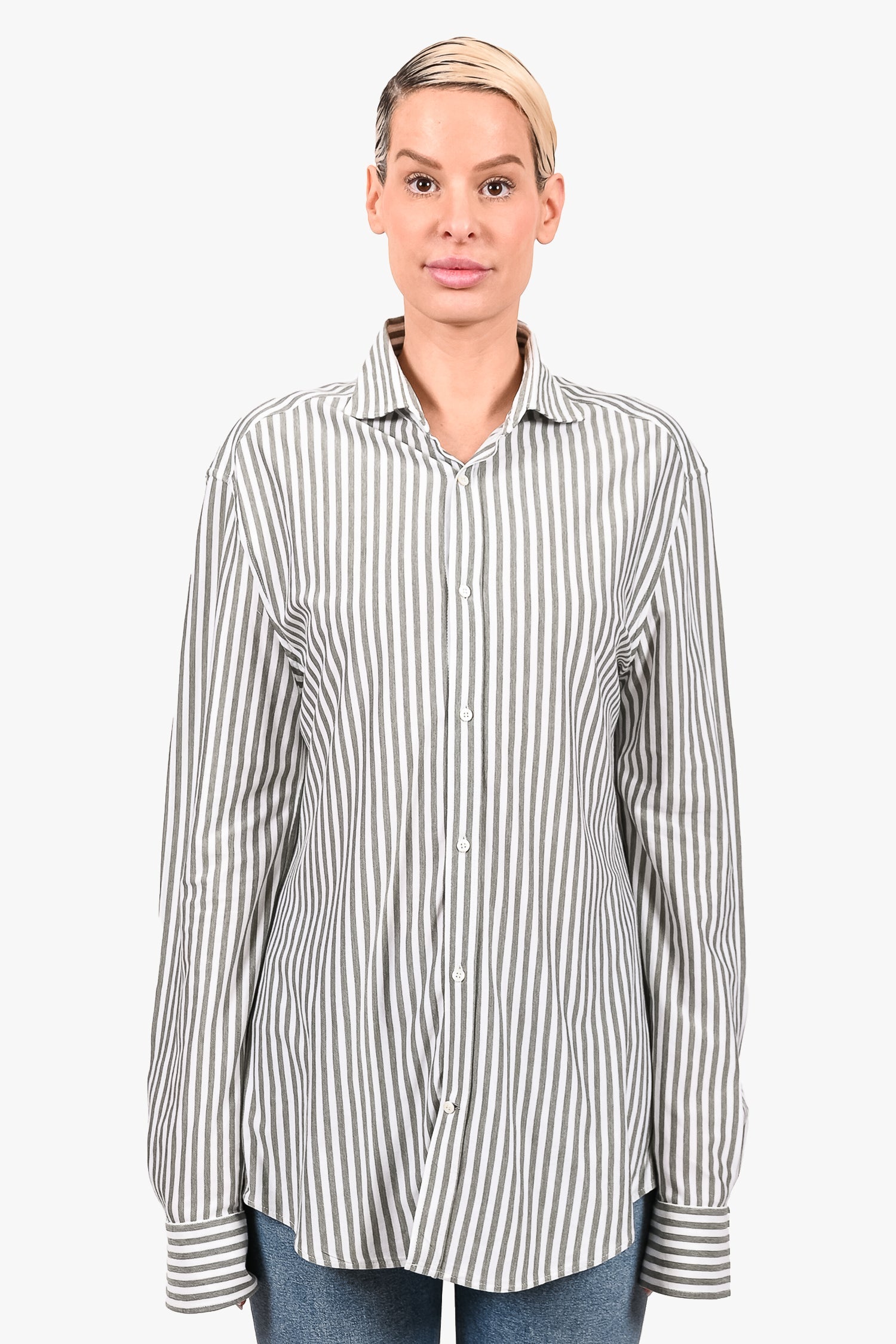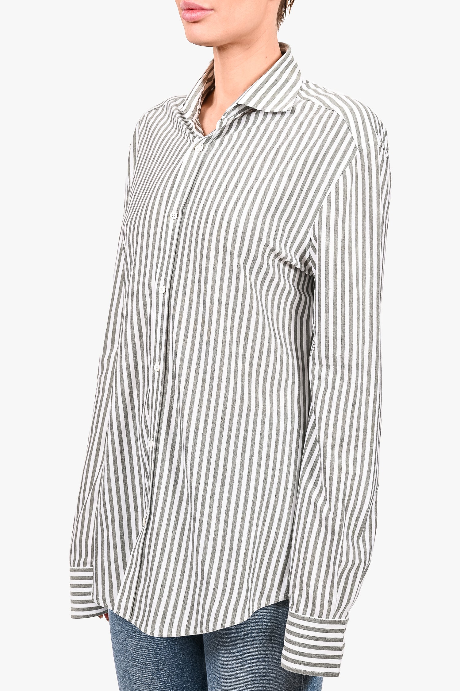 Refresh availabilityBrunello Cucinelli Green/White Striped Cotton Button Down Top. Front button-up closure. Button closures on the cuffs. Tonal stitching.