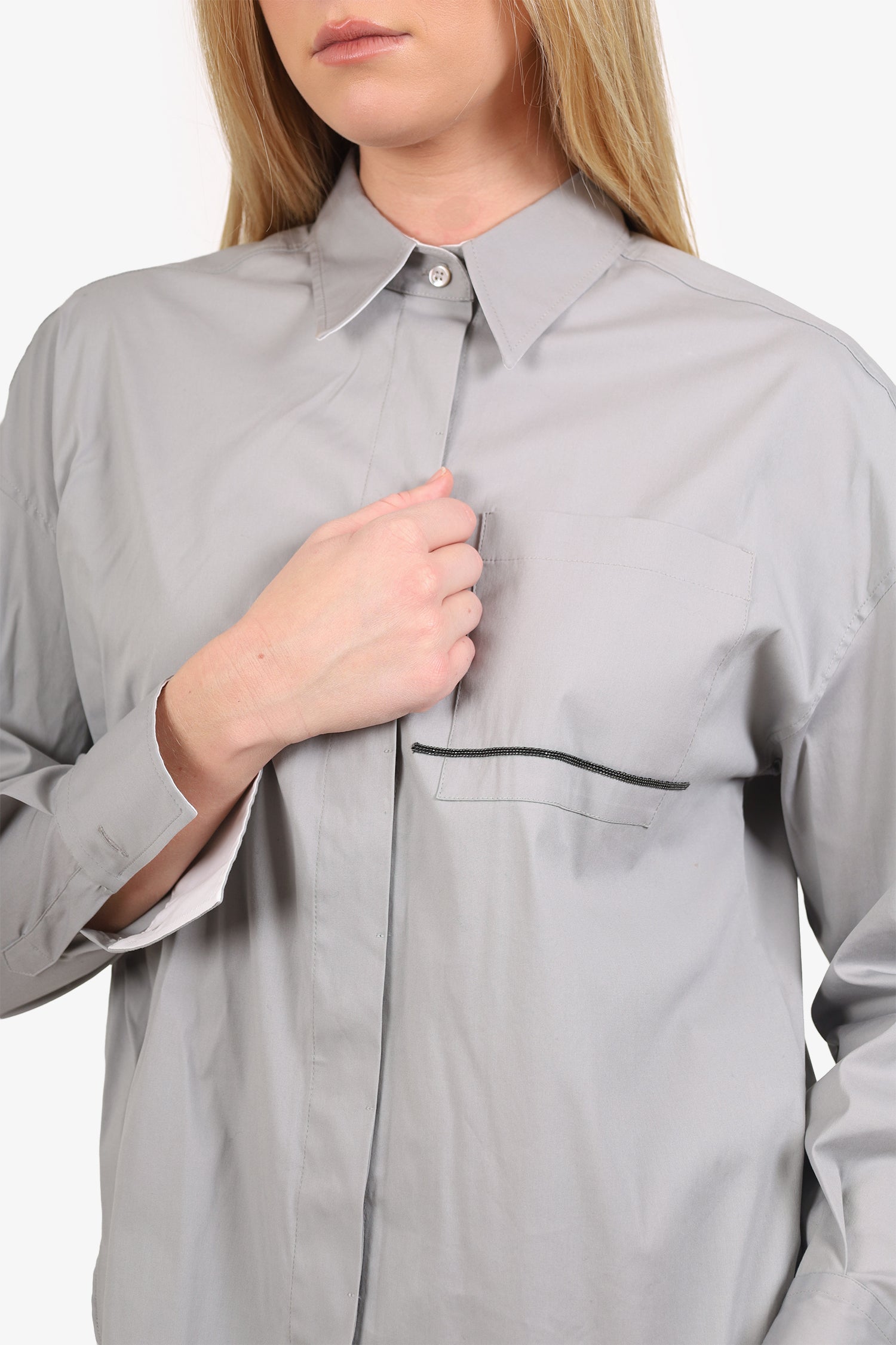 Refresh availabilityBrunello Cucinelli Grey Beaded Detail Button Down Shirt. Pull-on. Collared neckline. Front button-up closure. Sleeve cuffs with button-up closure. Single exterior chest slip pocket. Gunmetal-tone hardware. Tonal stitching.