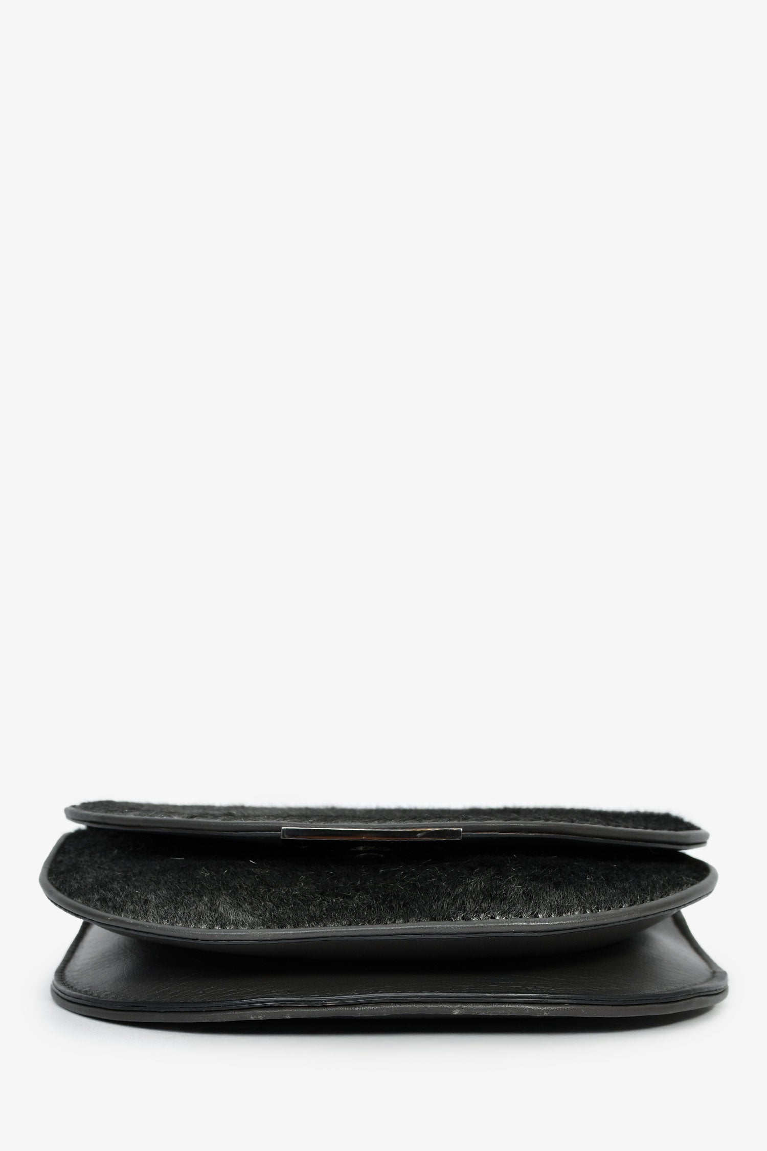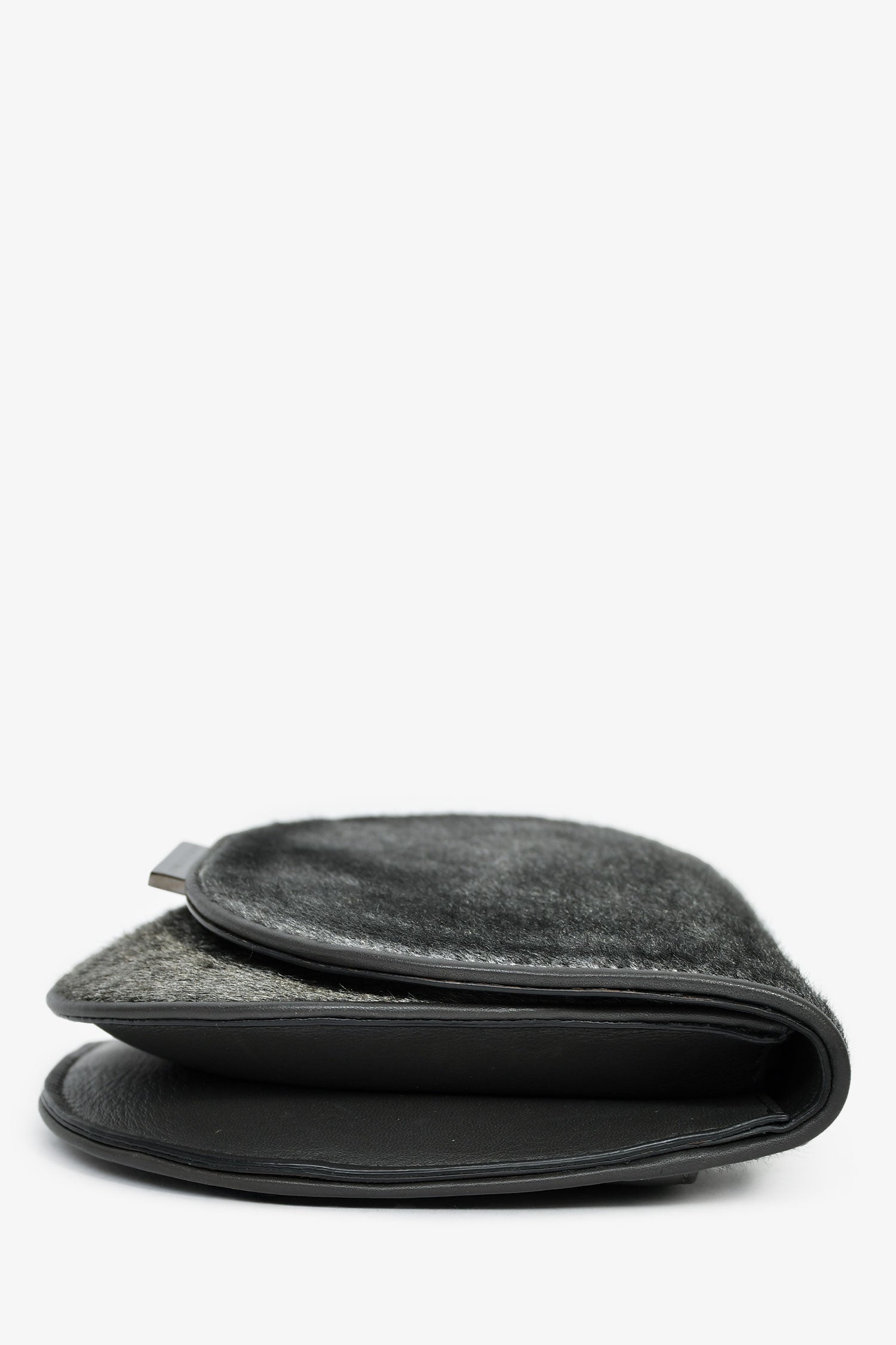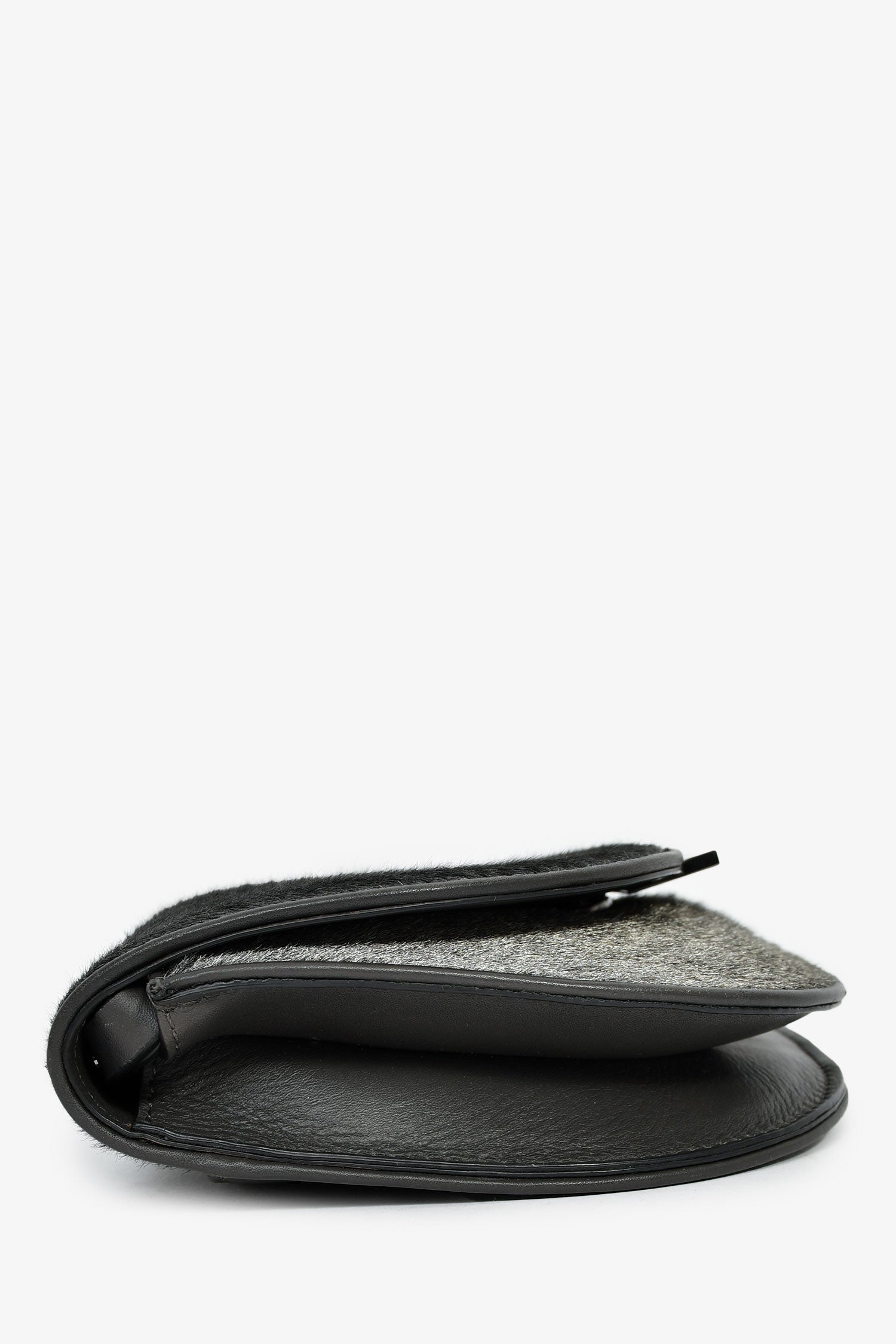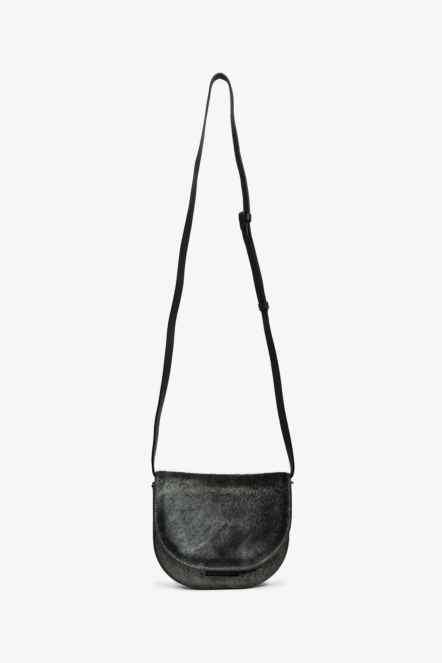 Refresh availabilityBrunello Cucinelli Grey Calfhair Small Crossbody. Flap closure with a magnetic fastening. Adjustable leather strap. 1 slip pocket on the interior and 1 on the exterior. Tonal stitching.