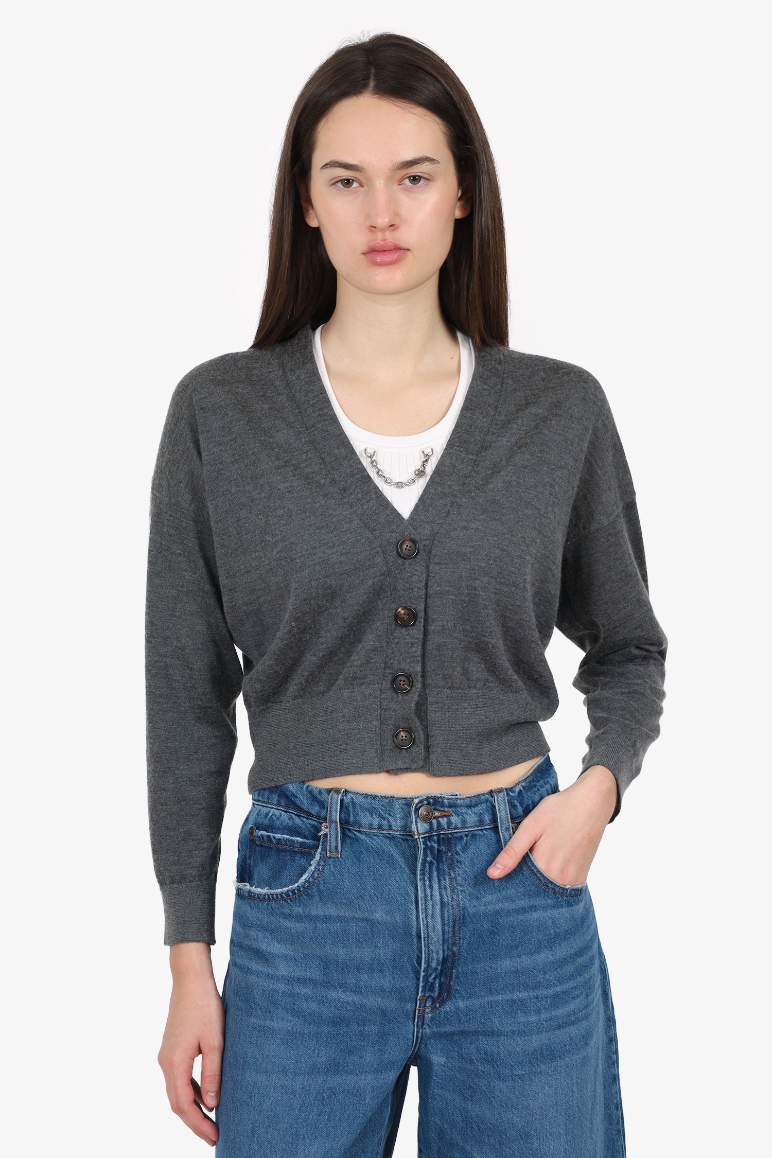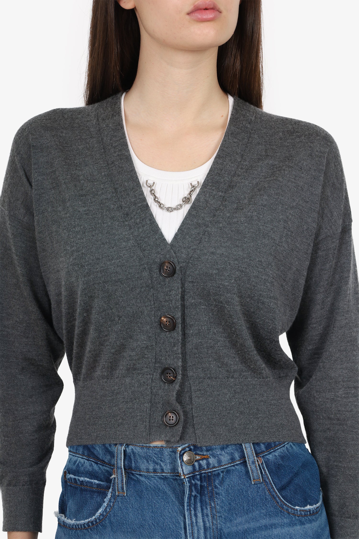 Refresh availabilityBrunello Cucinelli Grey Cashmere/Silk Cardigan. Pull-on. V-neckline. Front button-up closure. Tonal stitching.