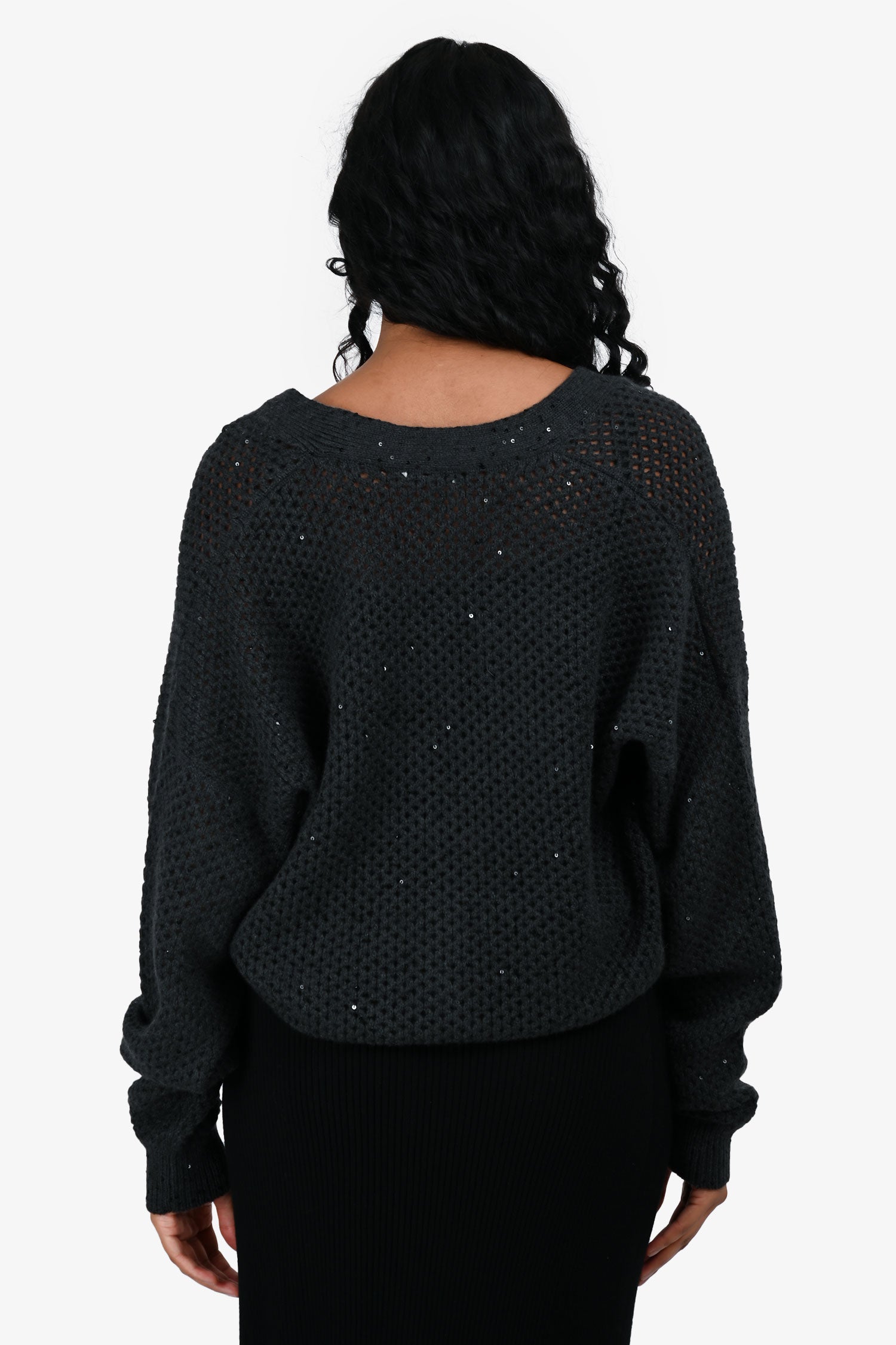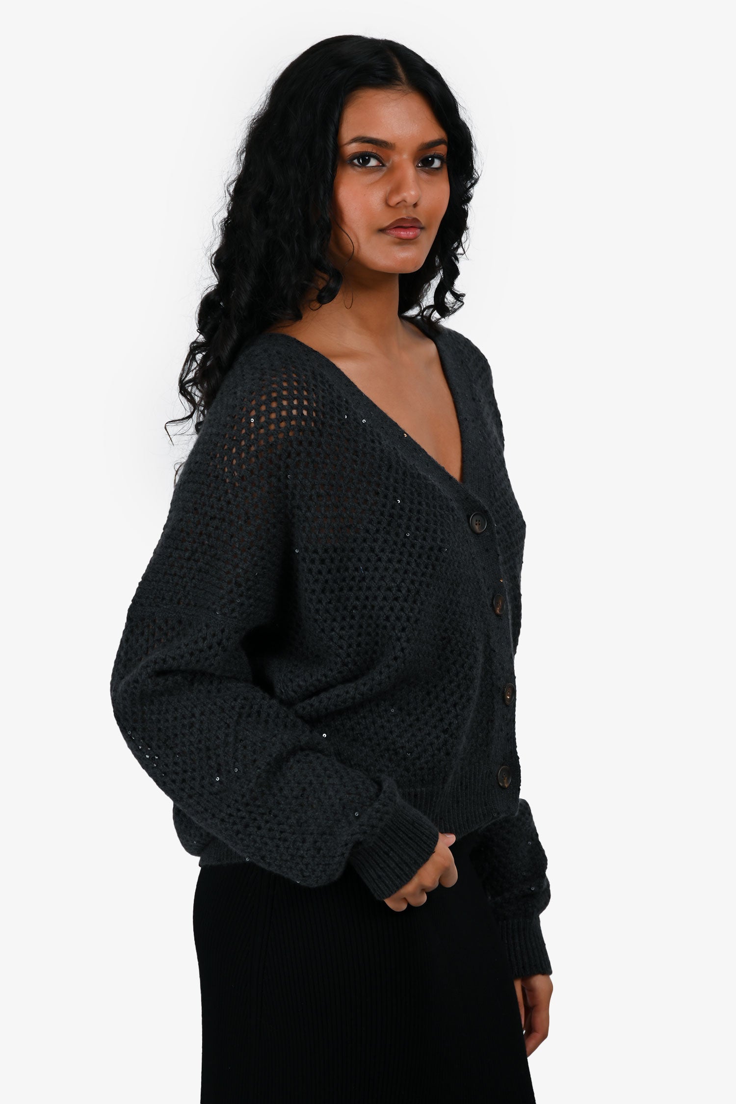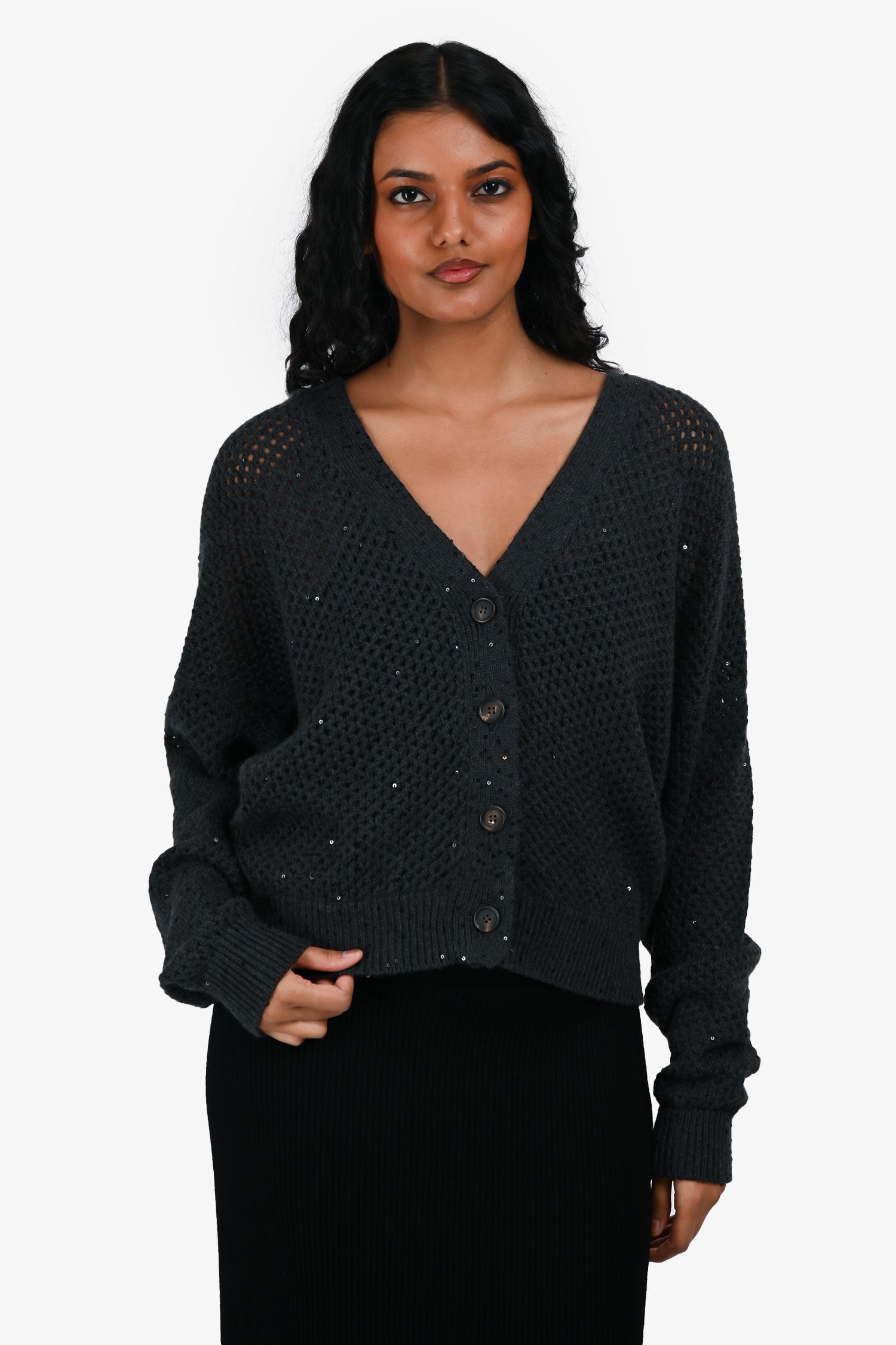 Refresh availabilityBrunello Cucinelli Grey Cashmere/Silk Sequin Embellished Cardigan. Pull-on. Button-up front closure. Ribbed neckline, cuffs, and hem. Tonal stitching.