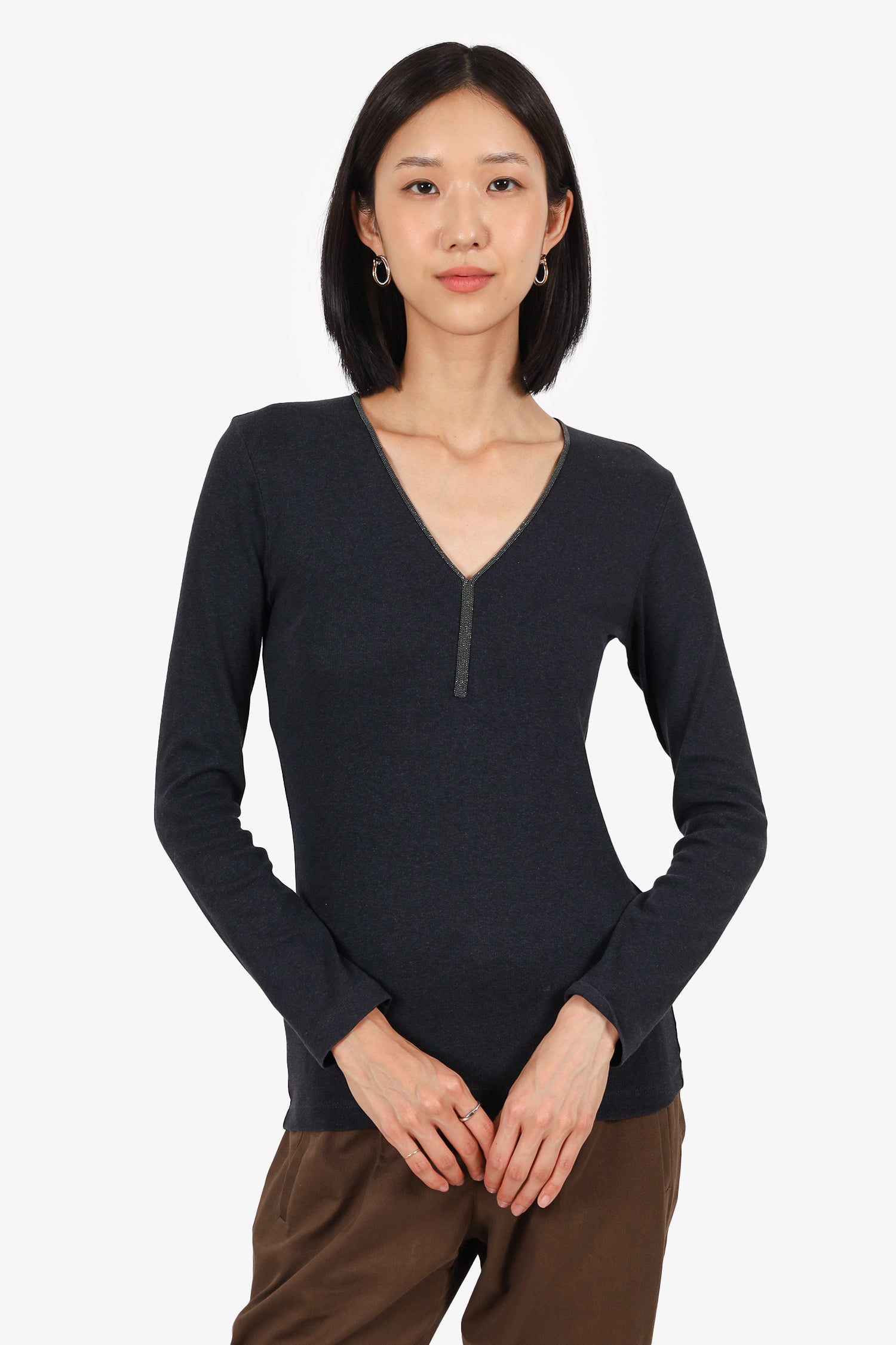 Refresh availabilityBrunello Cucinelli Grey Cotton Beaded V-Neck Long Long Sleeve Top. Pull-on. V-neckline. Silver-tone hardware. Tonal stitching.
