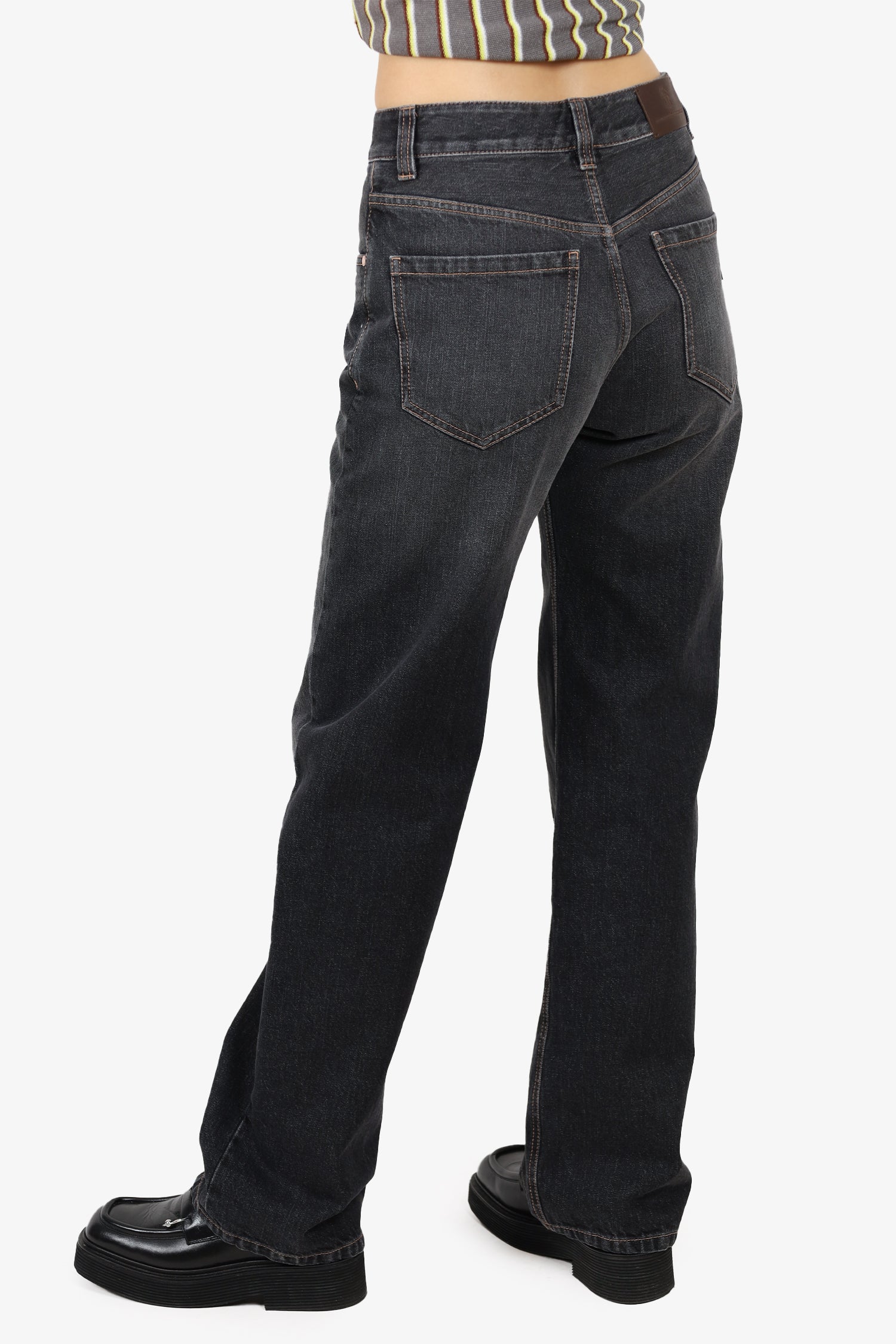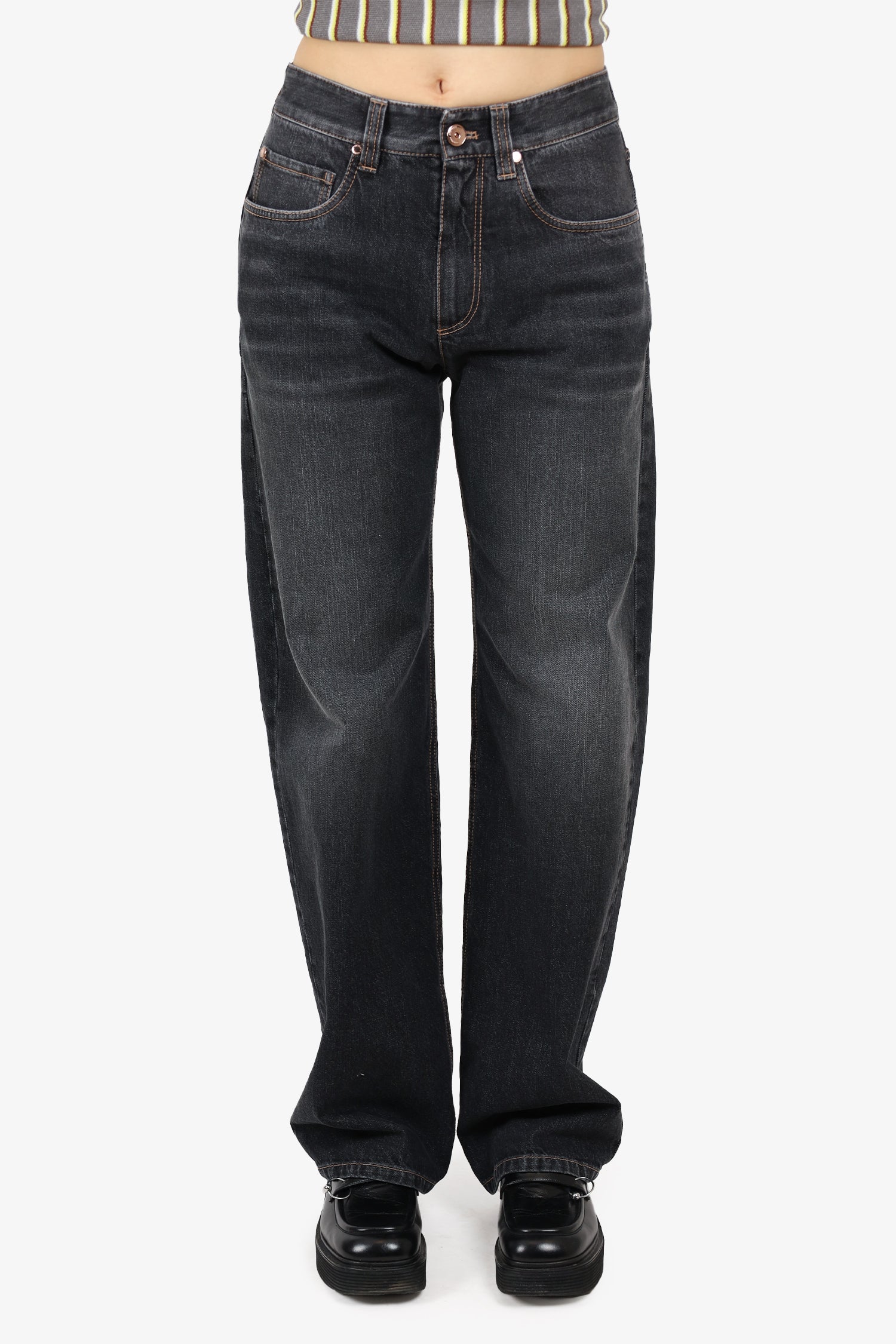 Refresh availabilityBrunello Cucinelli Grey Denim Wide Leg Jeans. Front button closure. Yellow denim stitching.