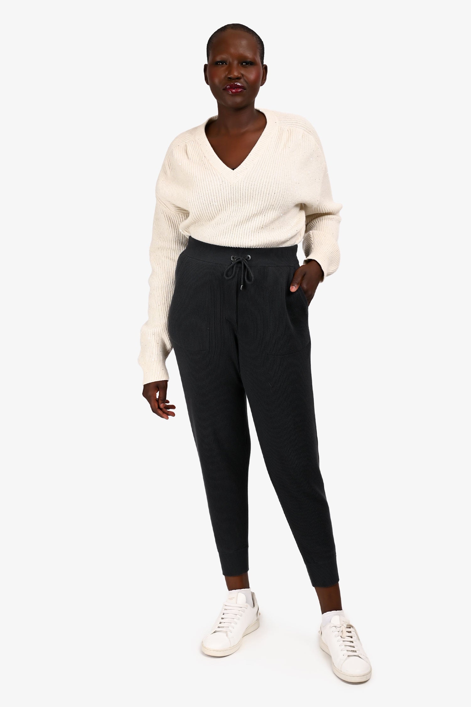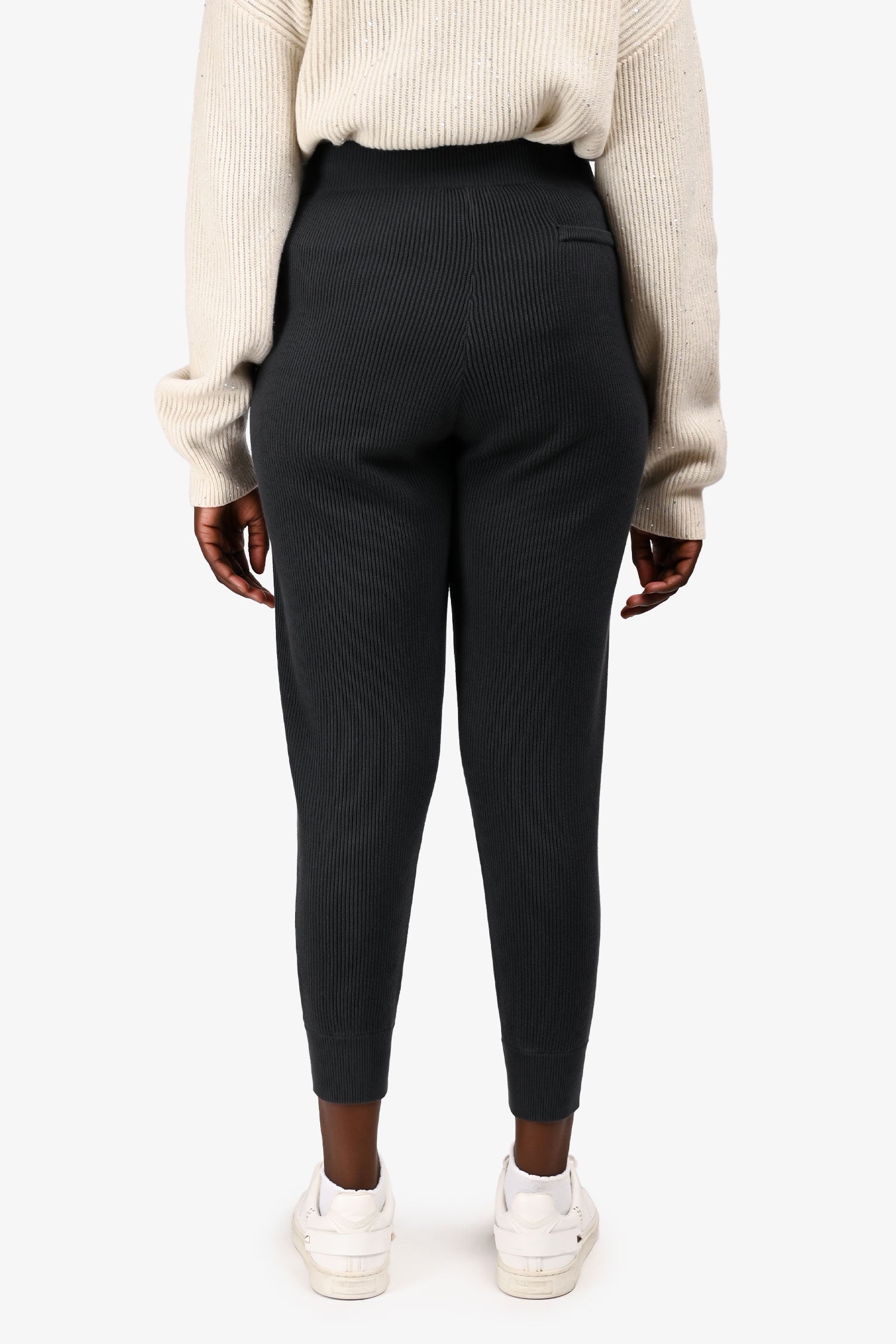 Refresh availabilityBrunello Cucinelli Grey Knit Jogger Pants. Pull-on. Elasticized waistband with drawstring ties. 2 front slip pockets. 1 rear slip pocket. Silver-tone hardware. Tonal stitching.